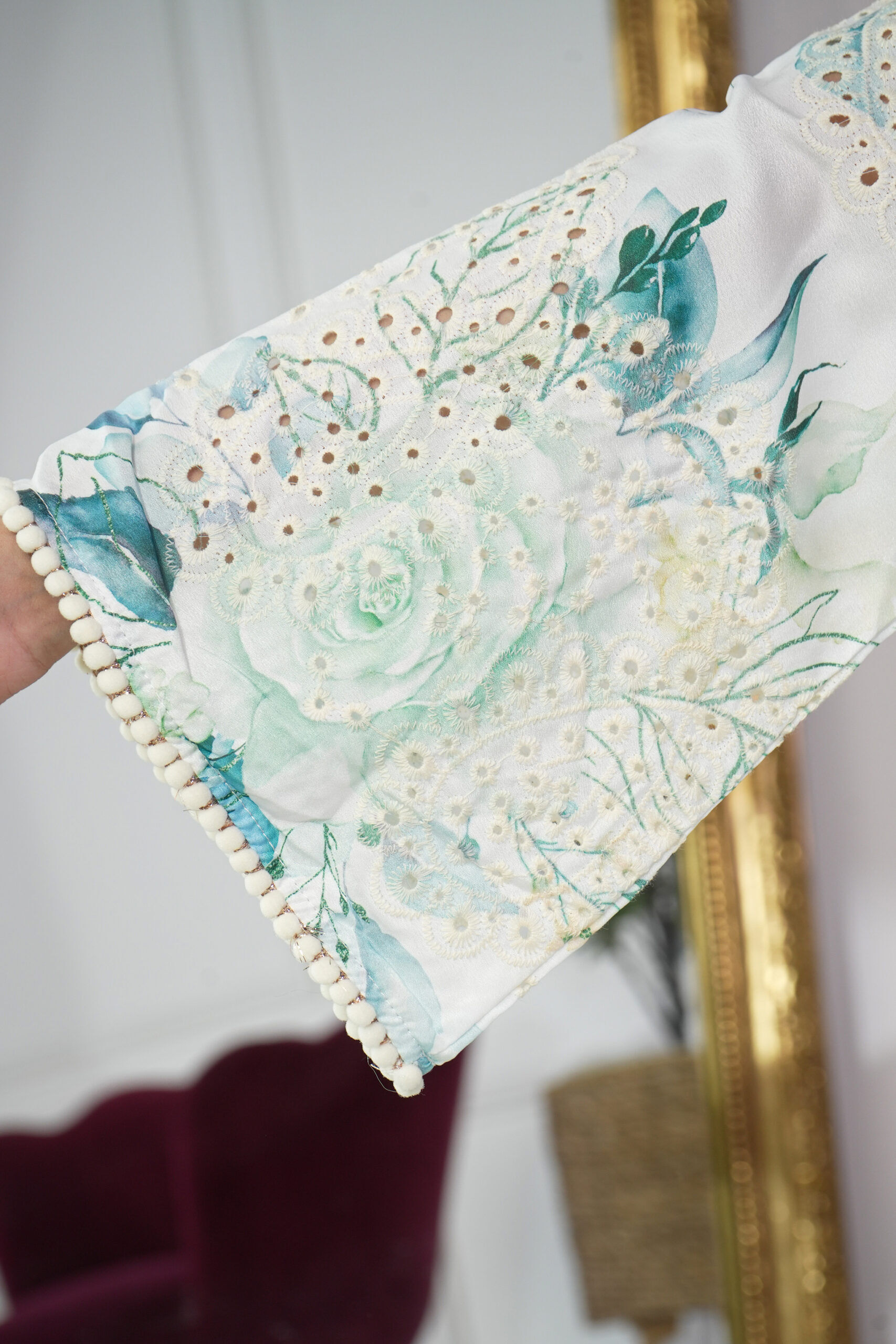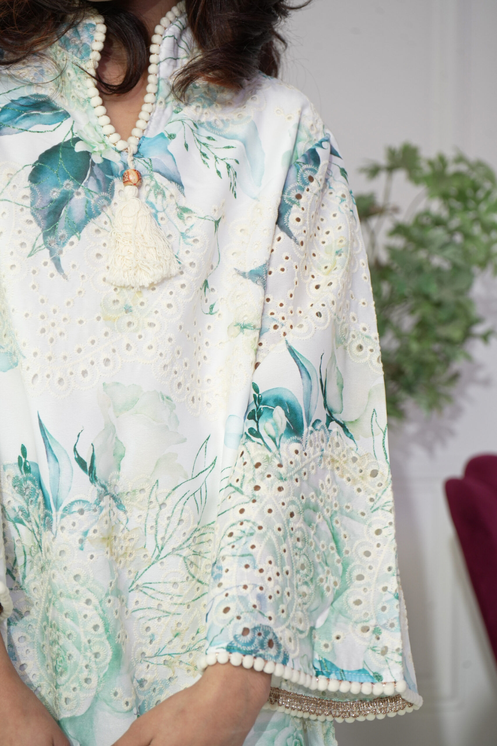 نسجت بورود الناعم ومن خامة لينينن عالي الجودة، صممت بياقة ناعمة حول الرقبة مع فتحة صدر قصيرة ومزينة بكلفة ابيض،مع الاكمام، تتسع من منتصف الذراع بقصة عليها حواف ، والاكمام وسيع عند المعصم.