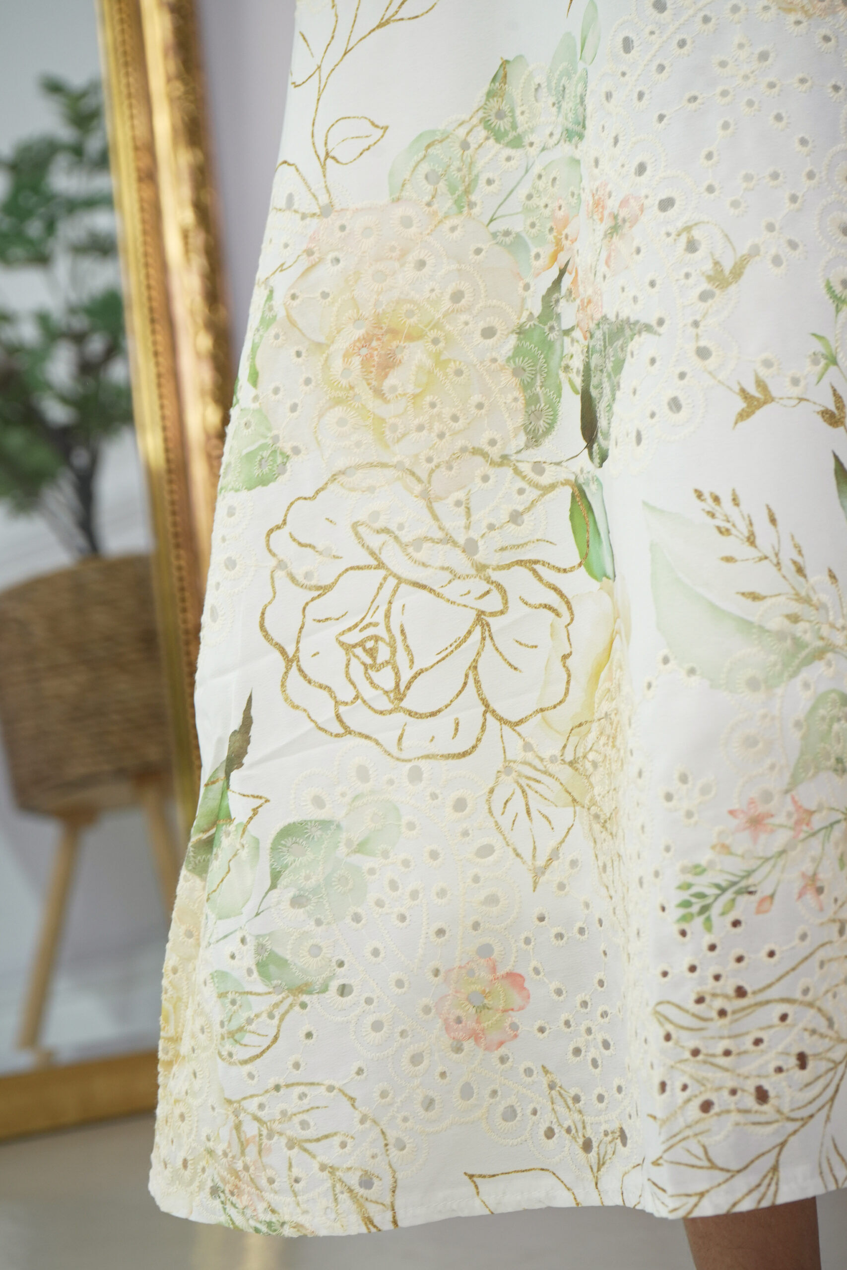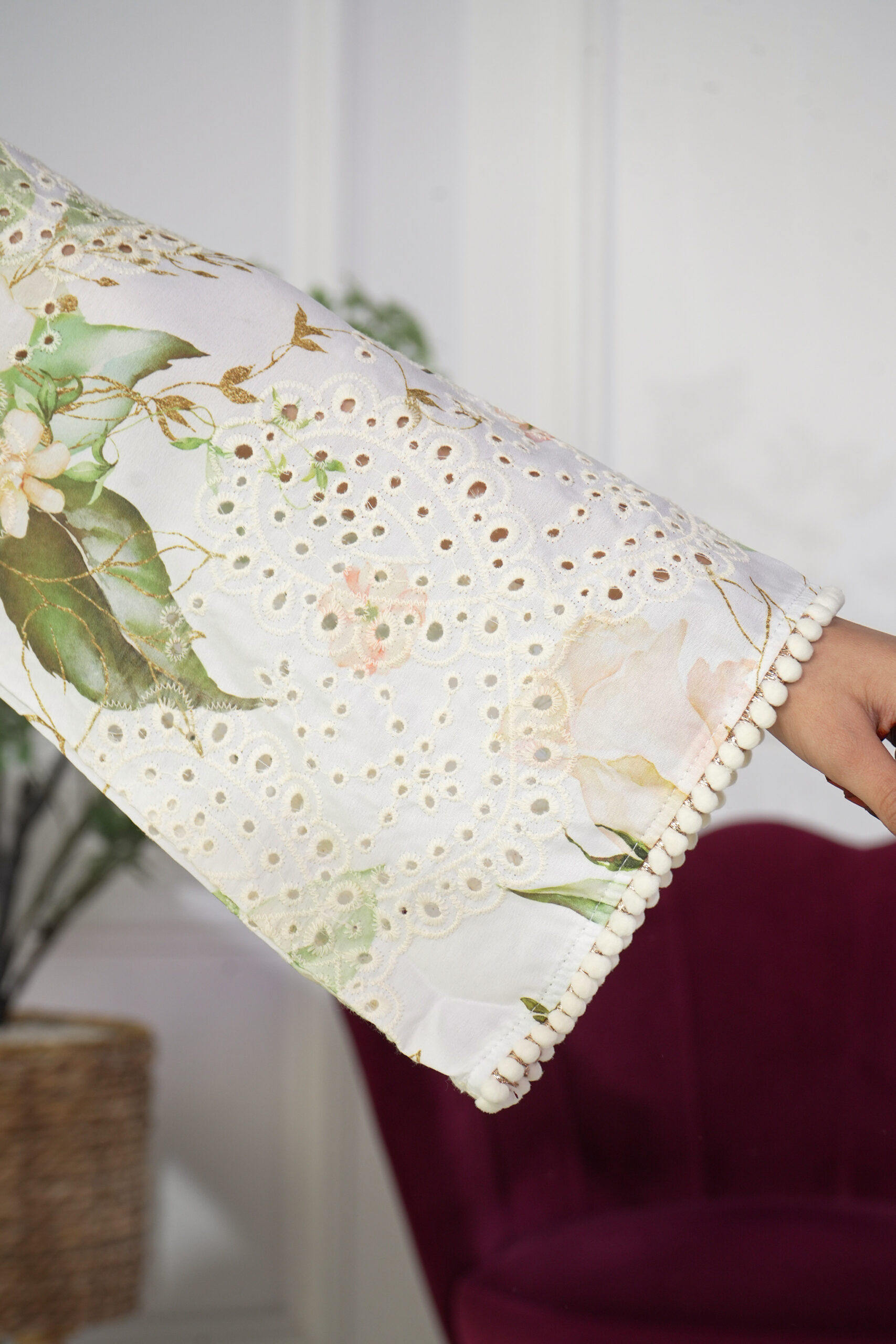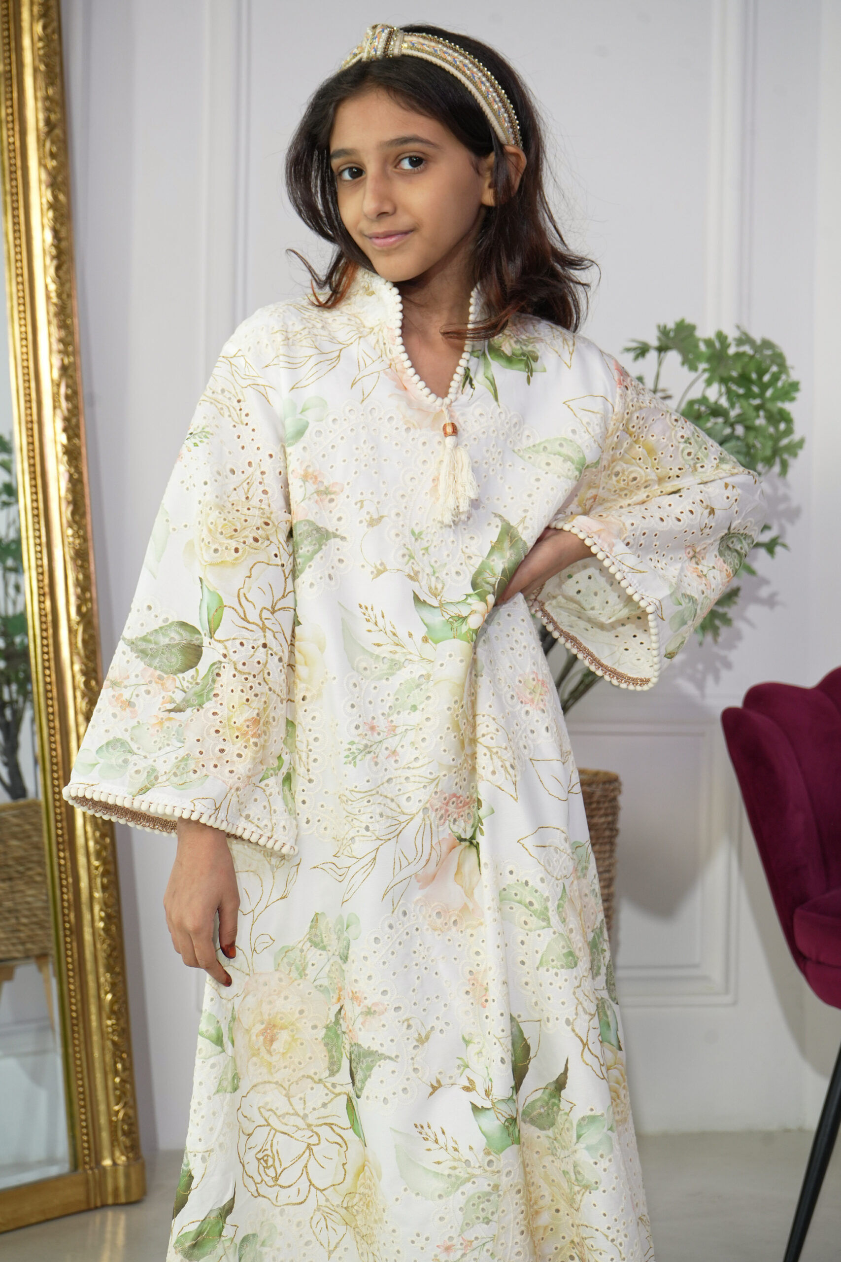 نسجت بورود الناعم ومن خامة لينينن عالي الجودة، صممت بياقة ناعمة حول الرقبة مع فتحة صدر قصيرة ومزينة بكلفة ابيض،مع الاكمام، تتسع من منتصف الذراع بقصة عليها حواف ، والاكمام وسيع عند المعصم.
