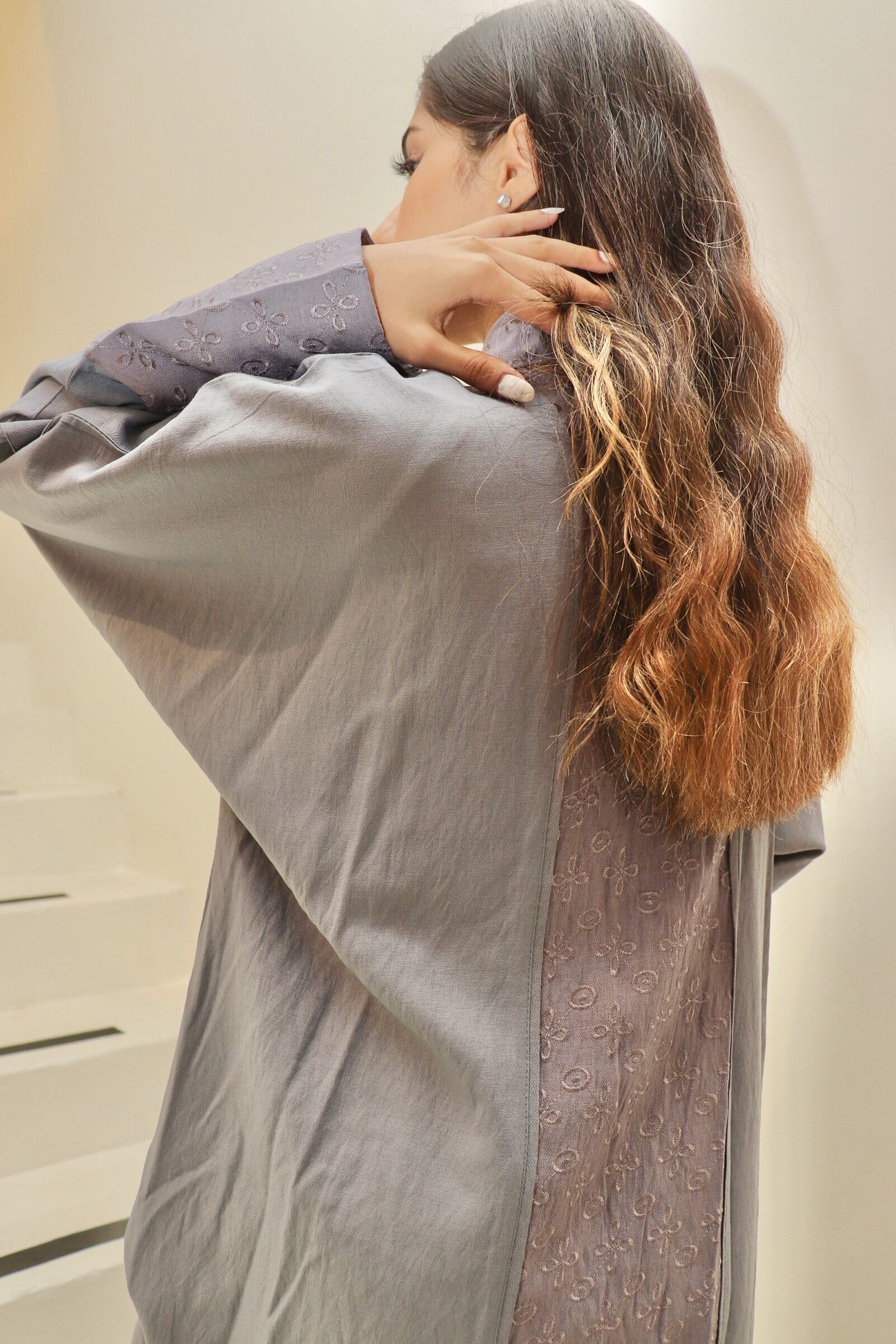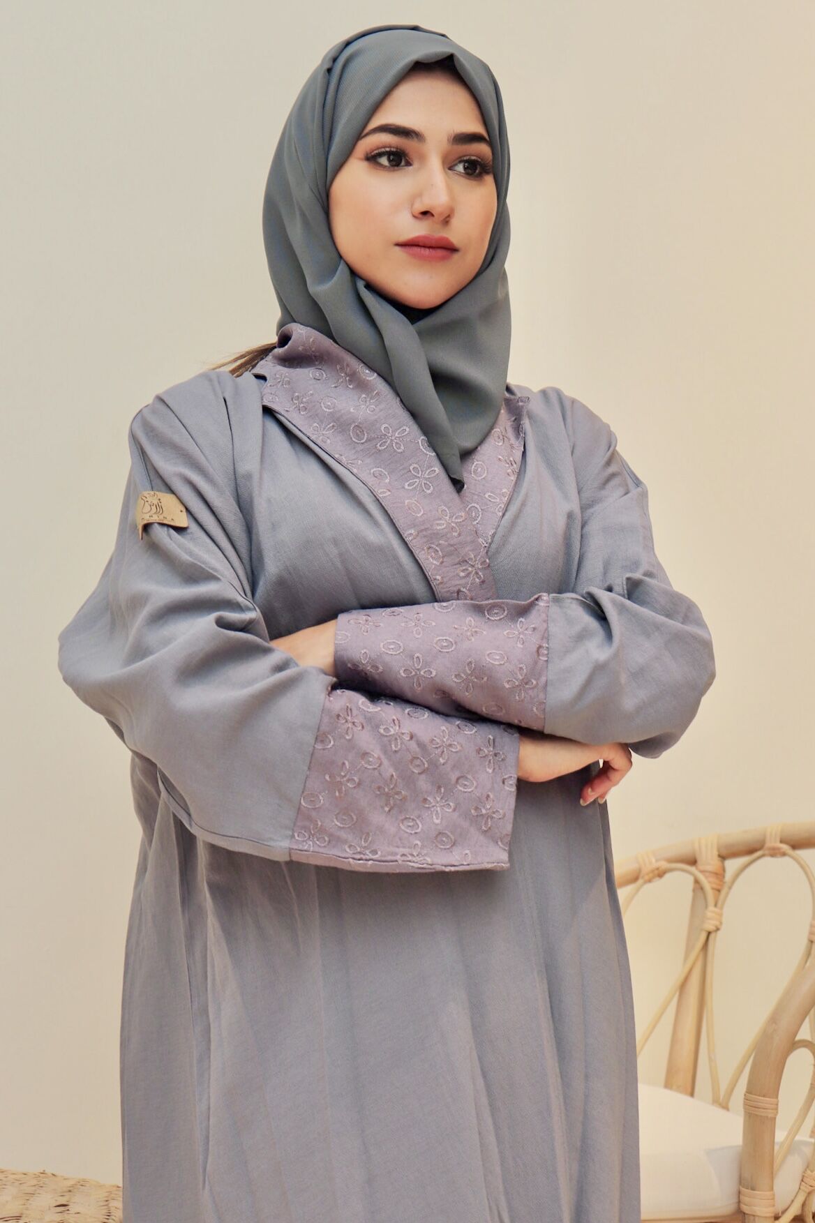 عباية رمادي لف ، مصممة من قماش الكريب السعودي بقصة كلاسيك وبطابع عصري أنيق , تأتي الاكمام ذكية ويفصلها تحديد مطرز من الكتان والكريب المتناسقة مع موديل الاكمام , تزيدك نعومة وأناقة عند ارتدائها في خرجاتك.