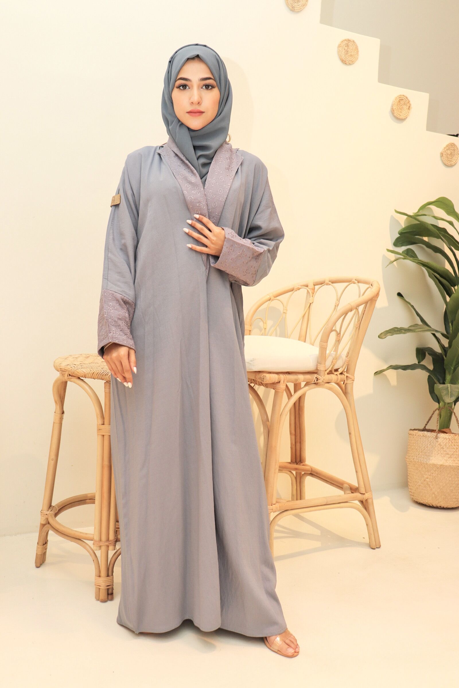 مواصفات عبايه كريب بياقة وكتان رمادي: