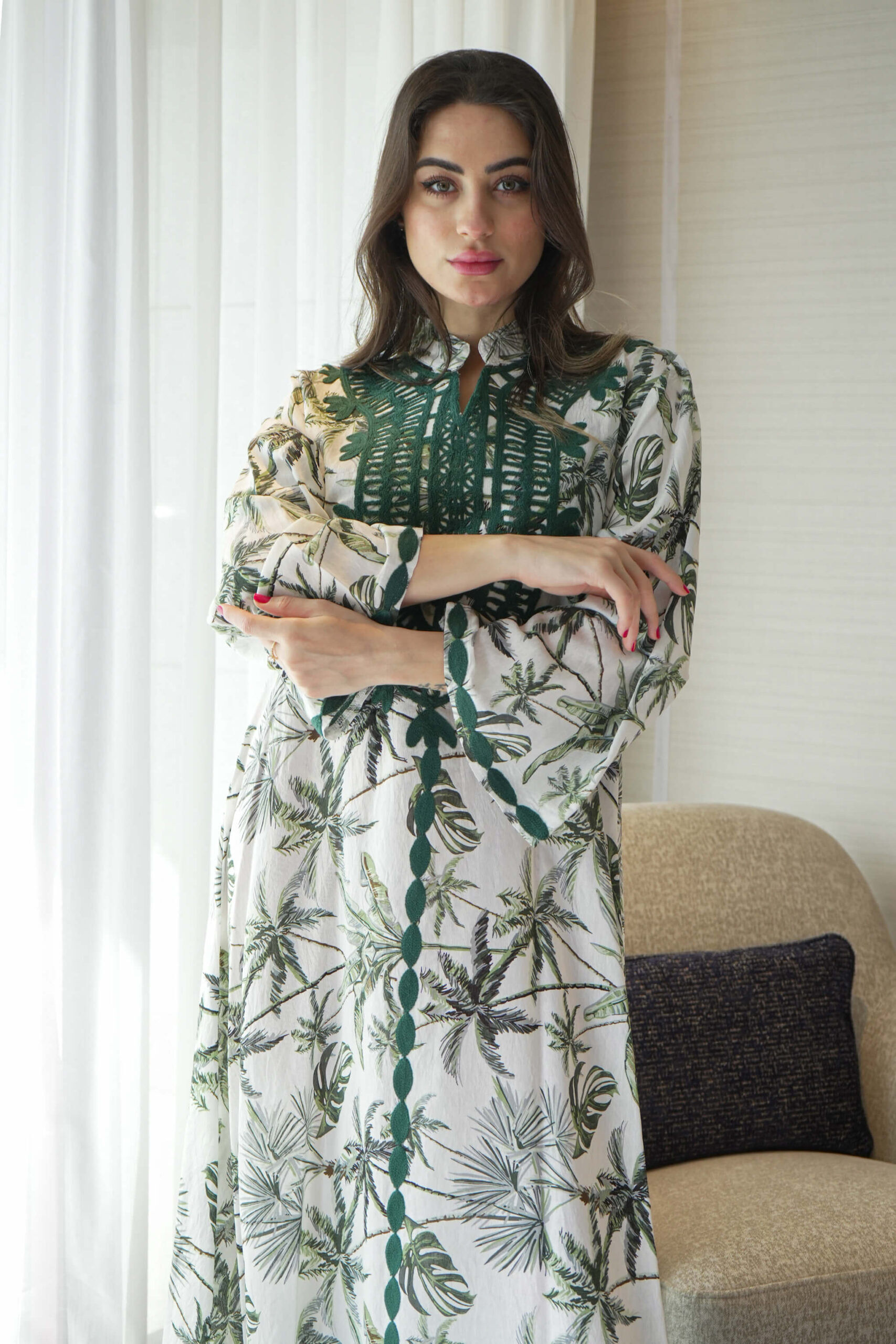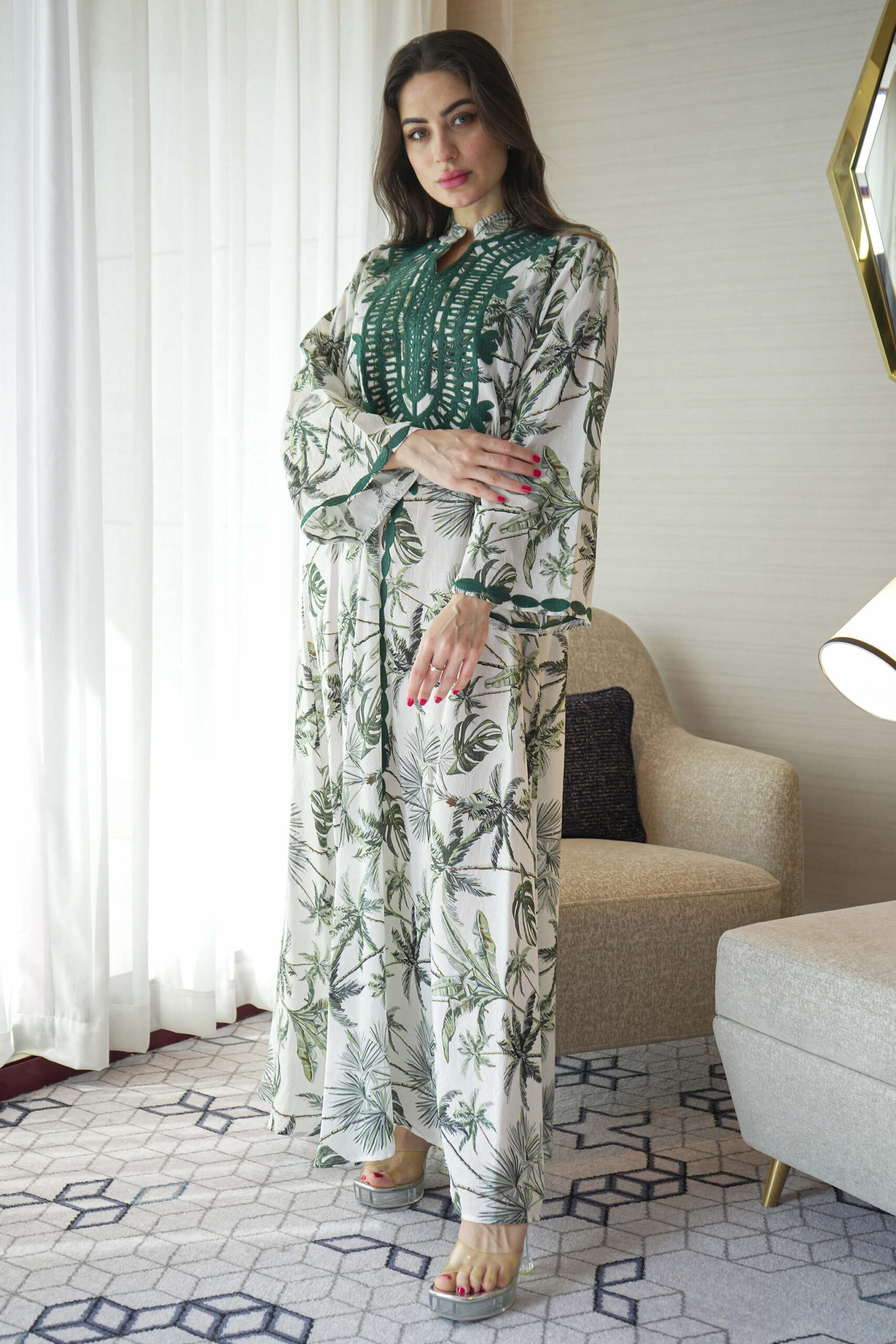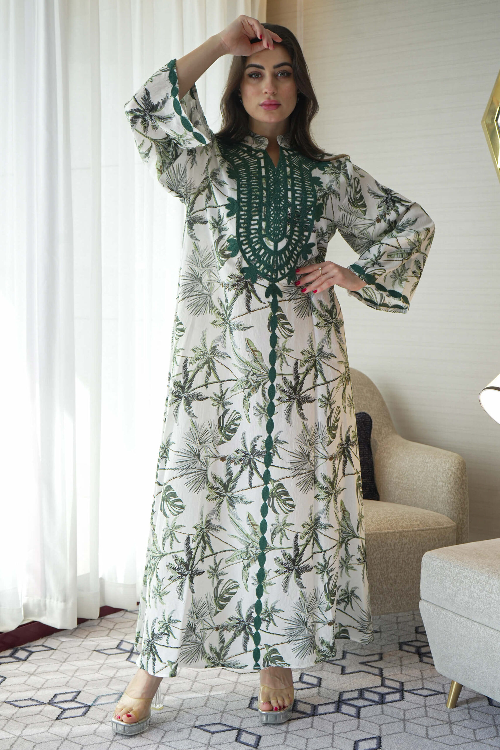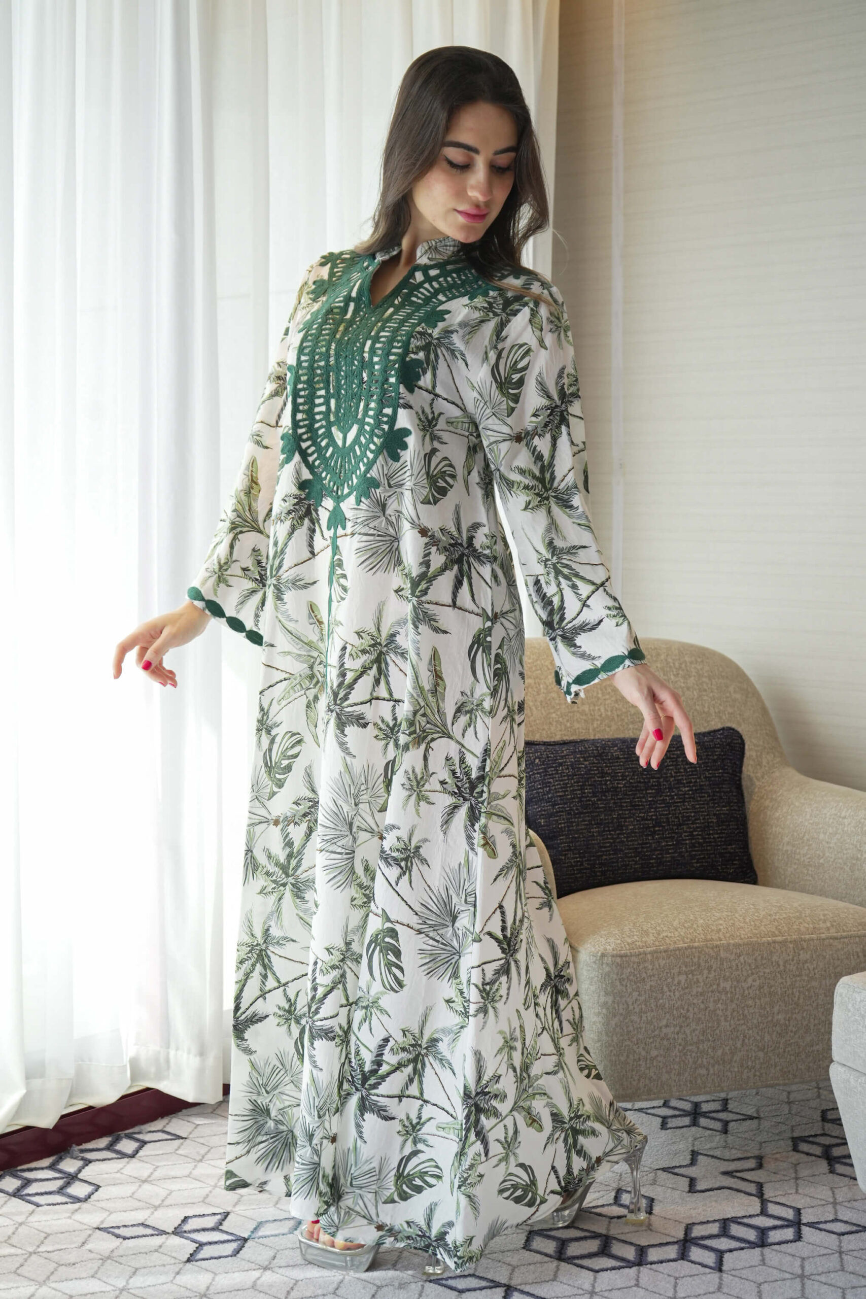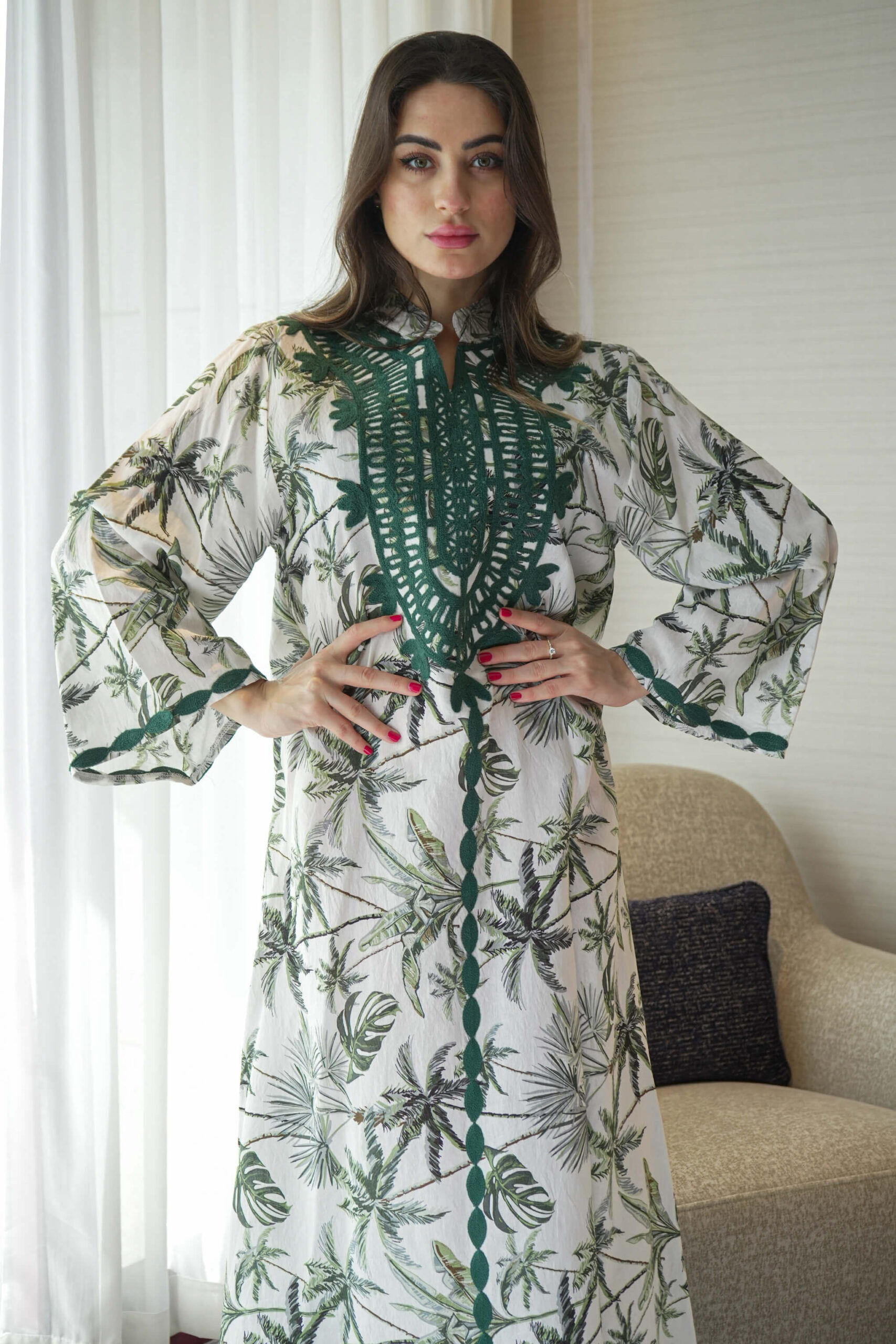 جلابية بلون اخضر ساترة و محتشمة بتطريز على الصدر بدقات وعلى الاكمام عندك مناسبة مهمة !؟ لا تتردين في إختيارها :