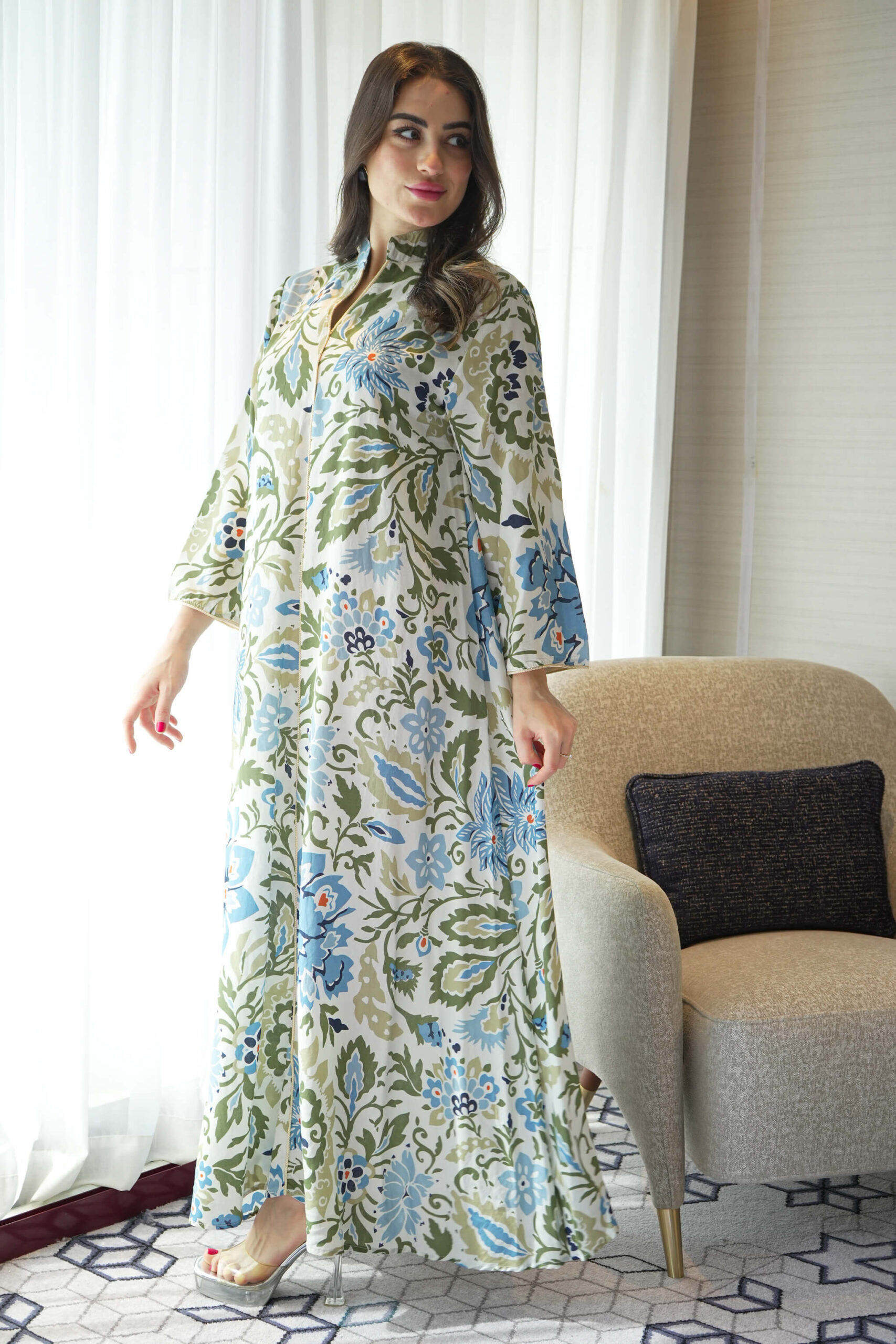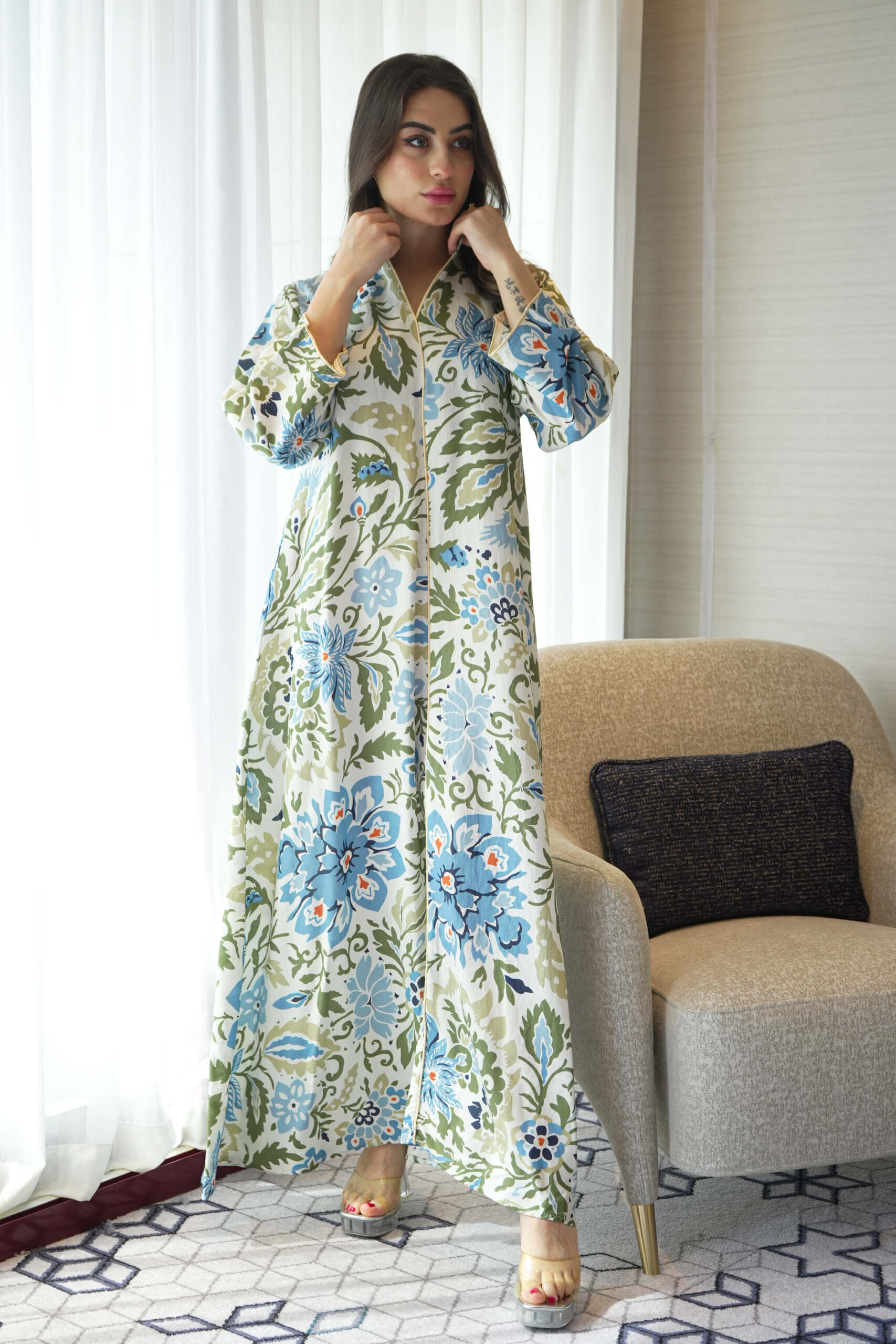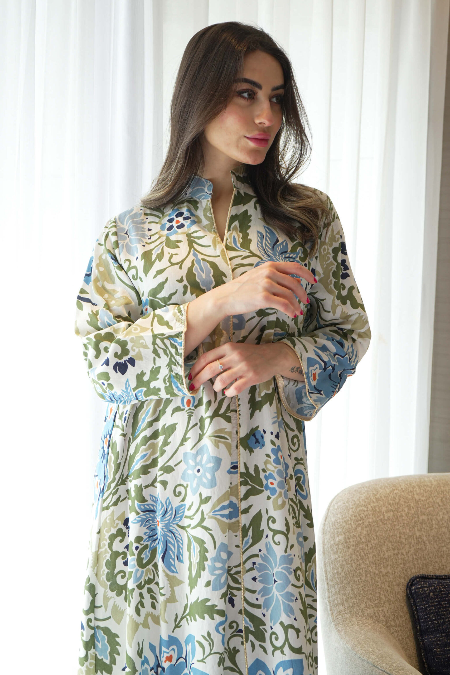 جلابيه تيفاني بقماش مشجر من نفسه بكم مطاط