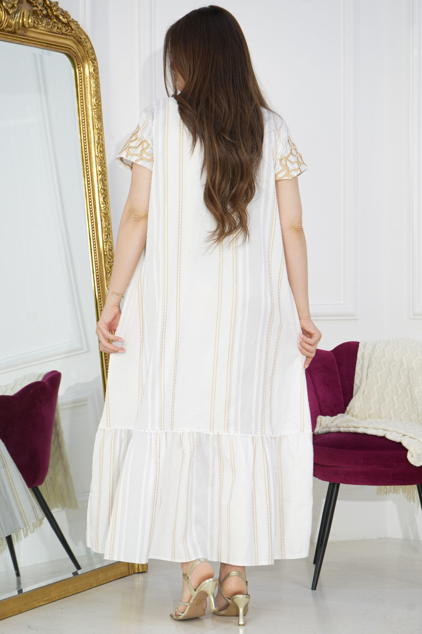 جلابية بقماش مخطط رمادي وأبيض ومطرزه من الأمام بالذهبي