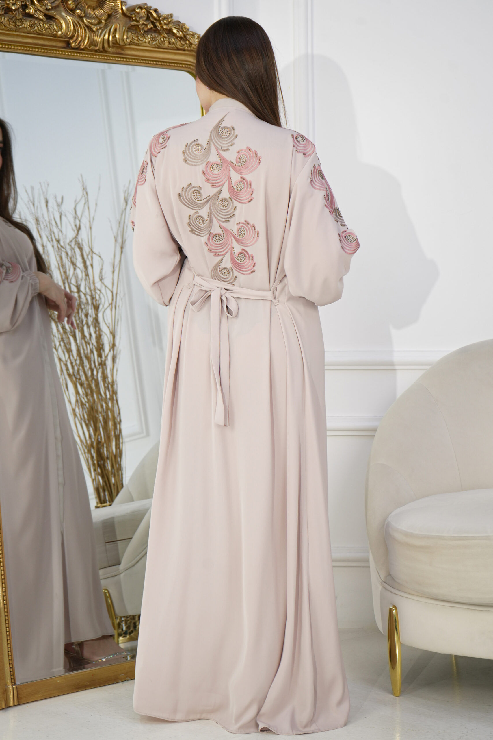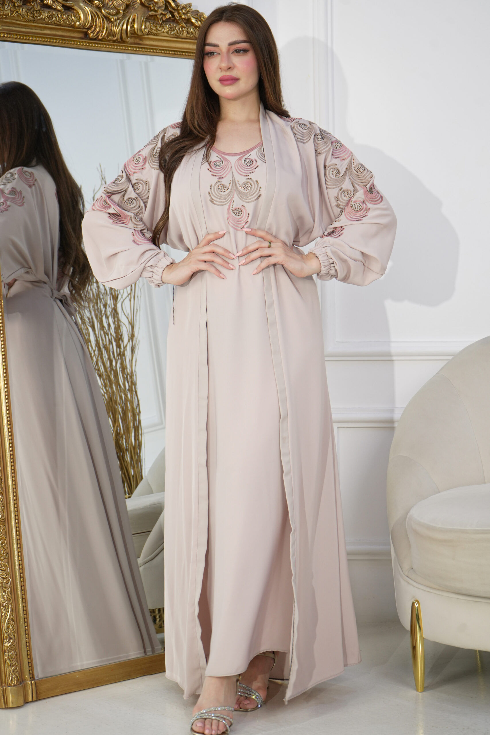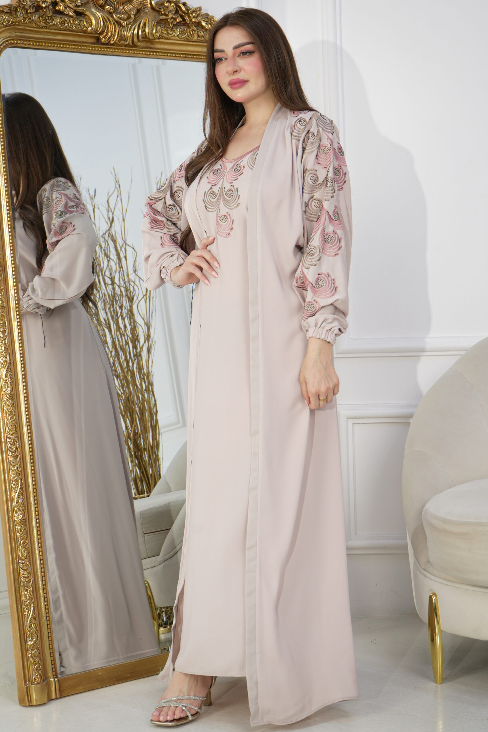 جلابيه بيج بطبقه داخليه و تطريز من الصدر ممتده على اكتاف