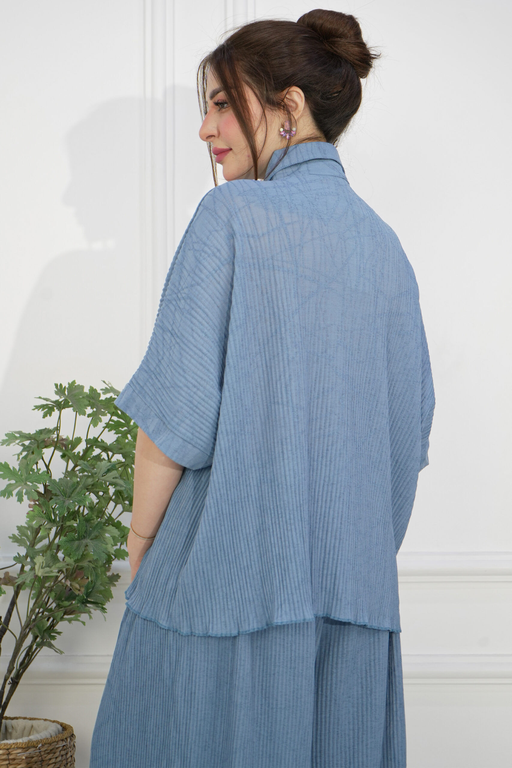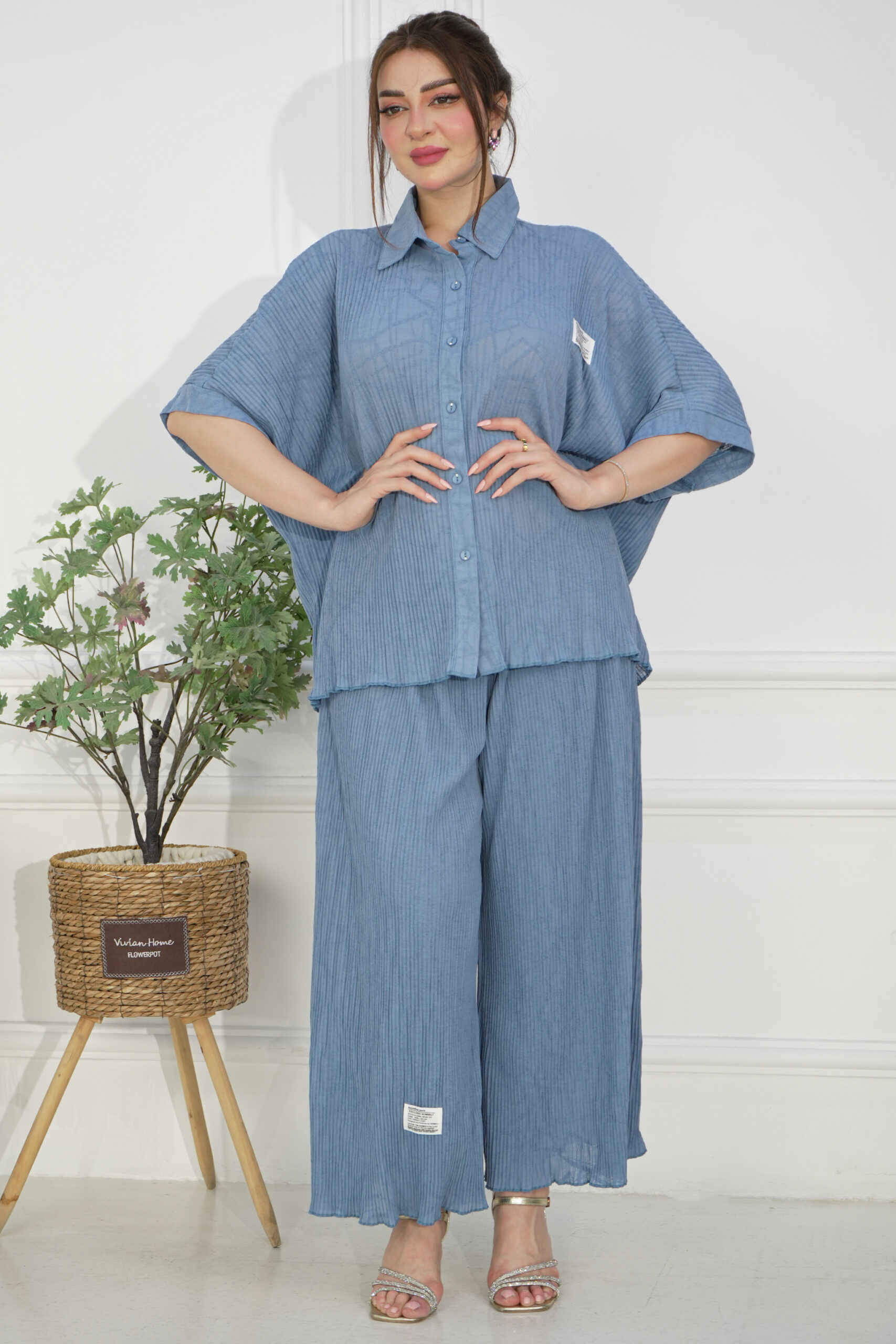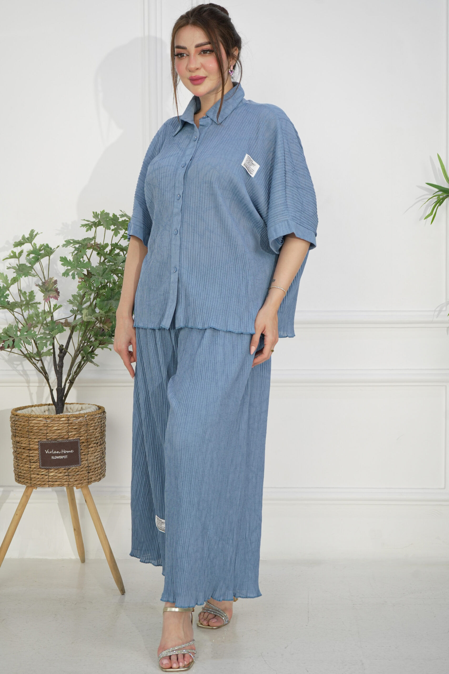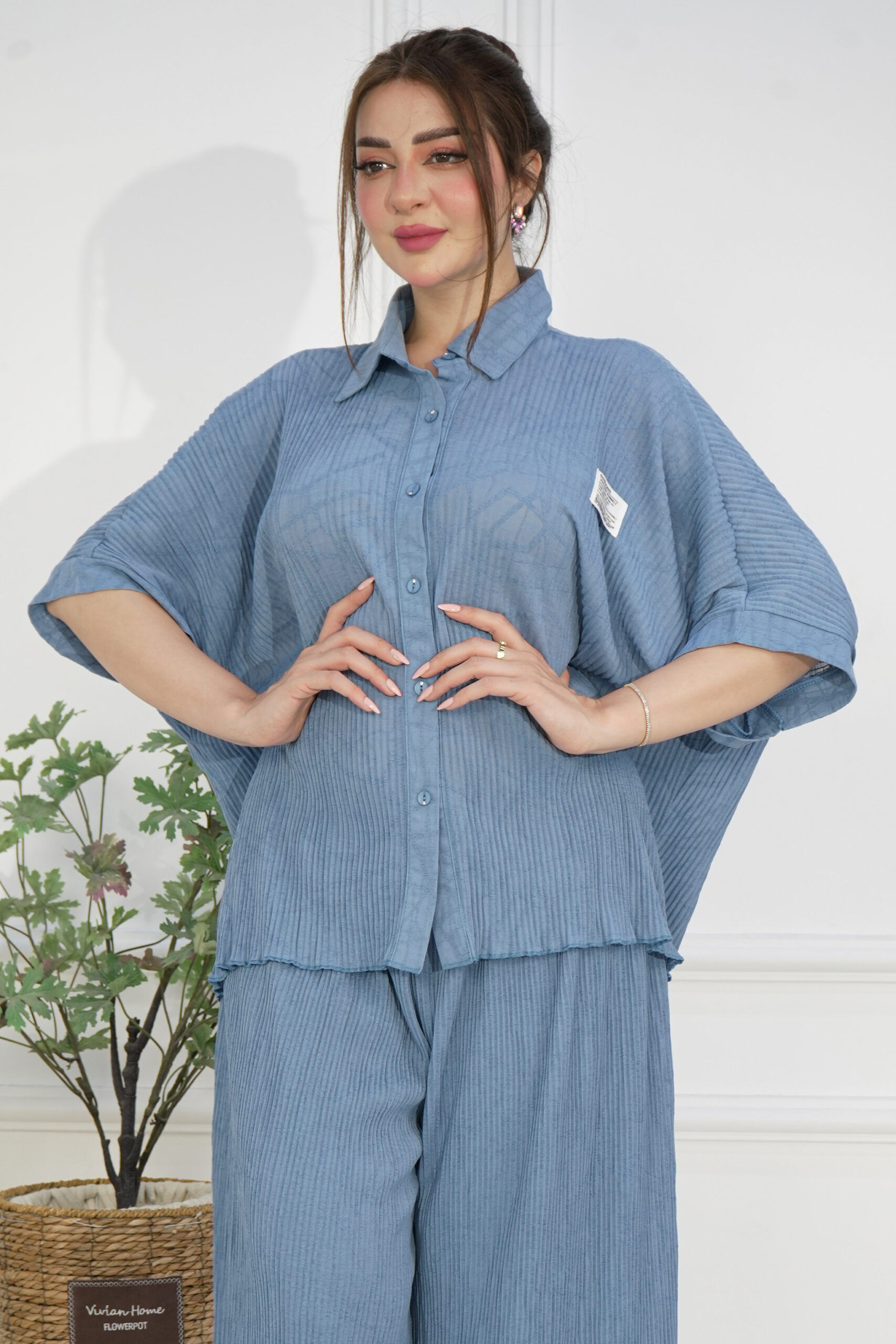 طقم قميص وبنطلون بلون سماوي مصمم بقماش مكسر ، اخترنا له خامة لينن مكسر بيج من افضل الخامات العملية للبس اليومي.