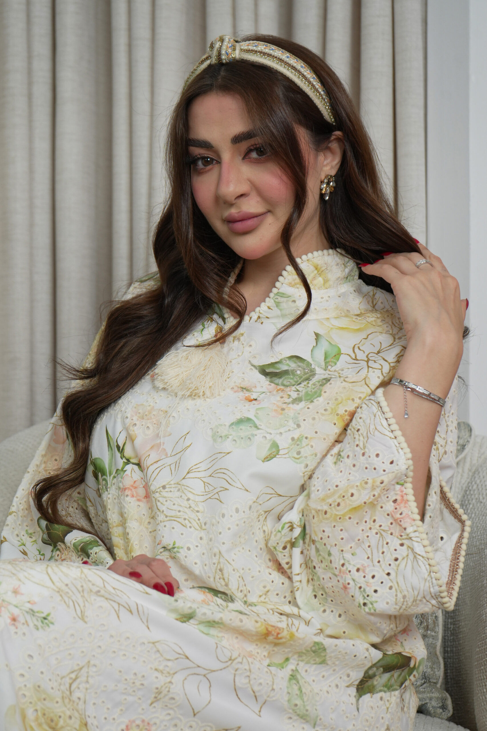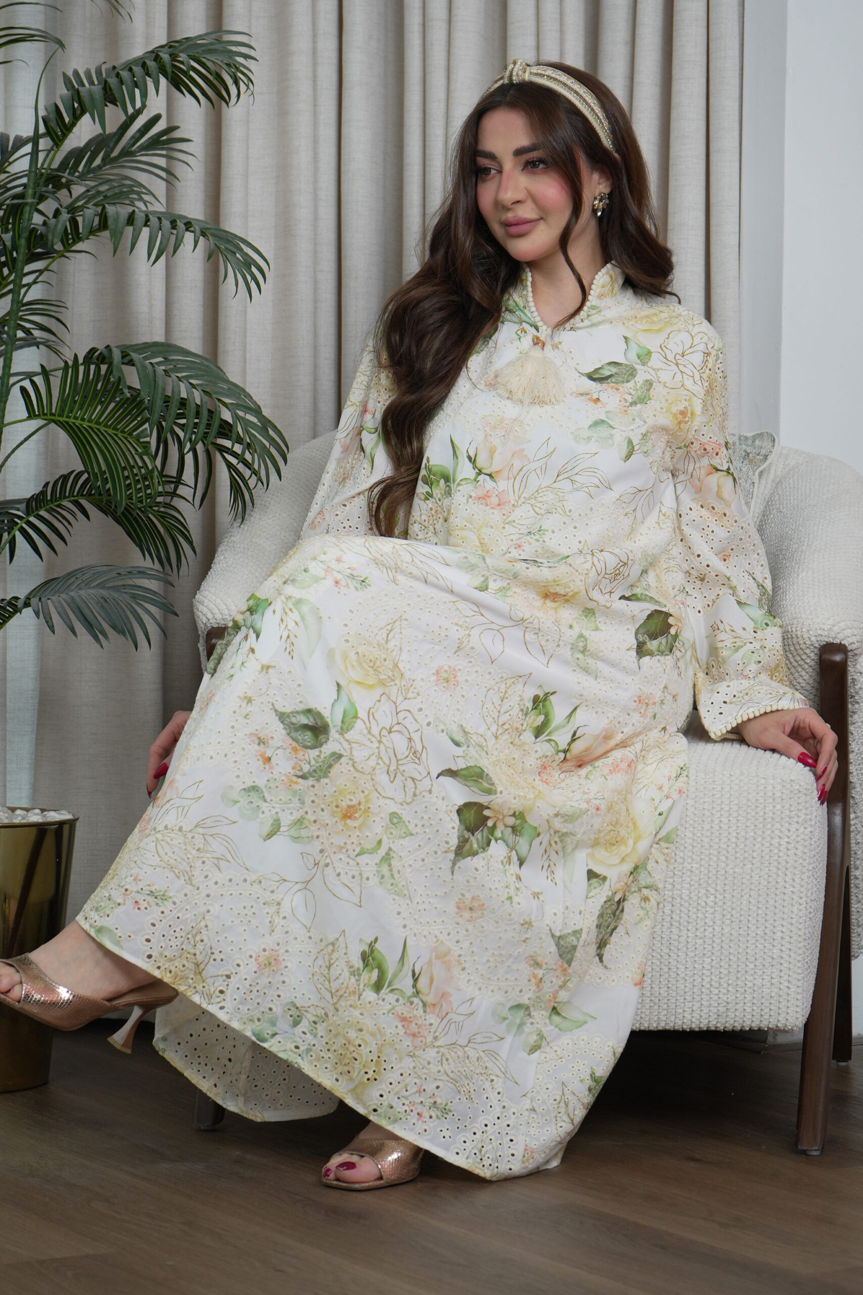 نسجت بورود الناعم ومن خامة لينينن عالي الجودة، صممت بياقة ناعمة حول الرقبة مع فتحة صدر قصيرة ومزينة بكلفة ابيض،مع الاكمام، تتسع من منتصف الذراع بقصة عليها حواف ، والاكمام وسيع عند المعصم.