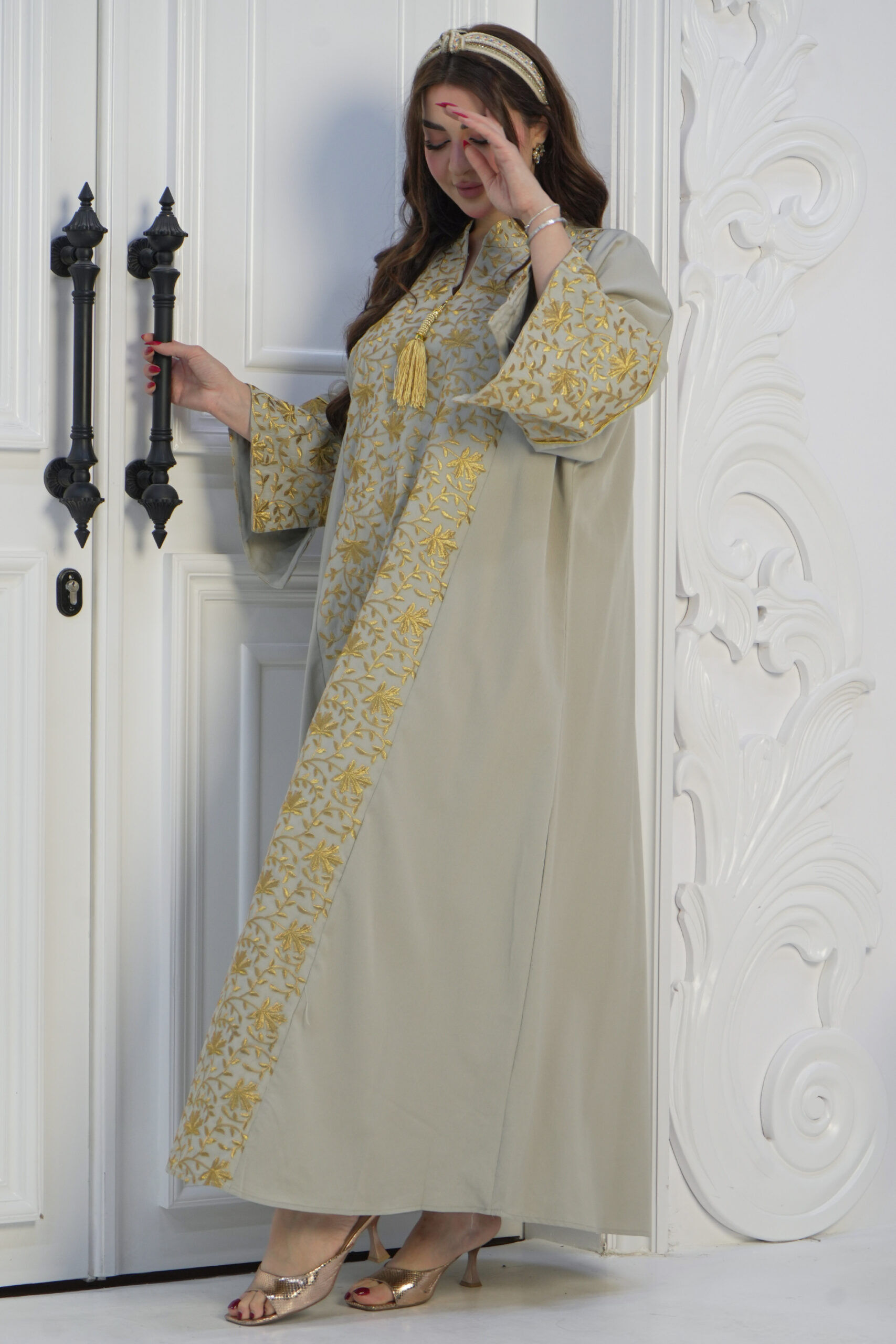 جلابية بيج مطرزة بذهبي فخمة تميز وجودك بين الحضور