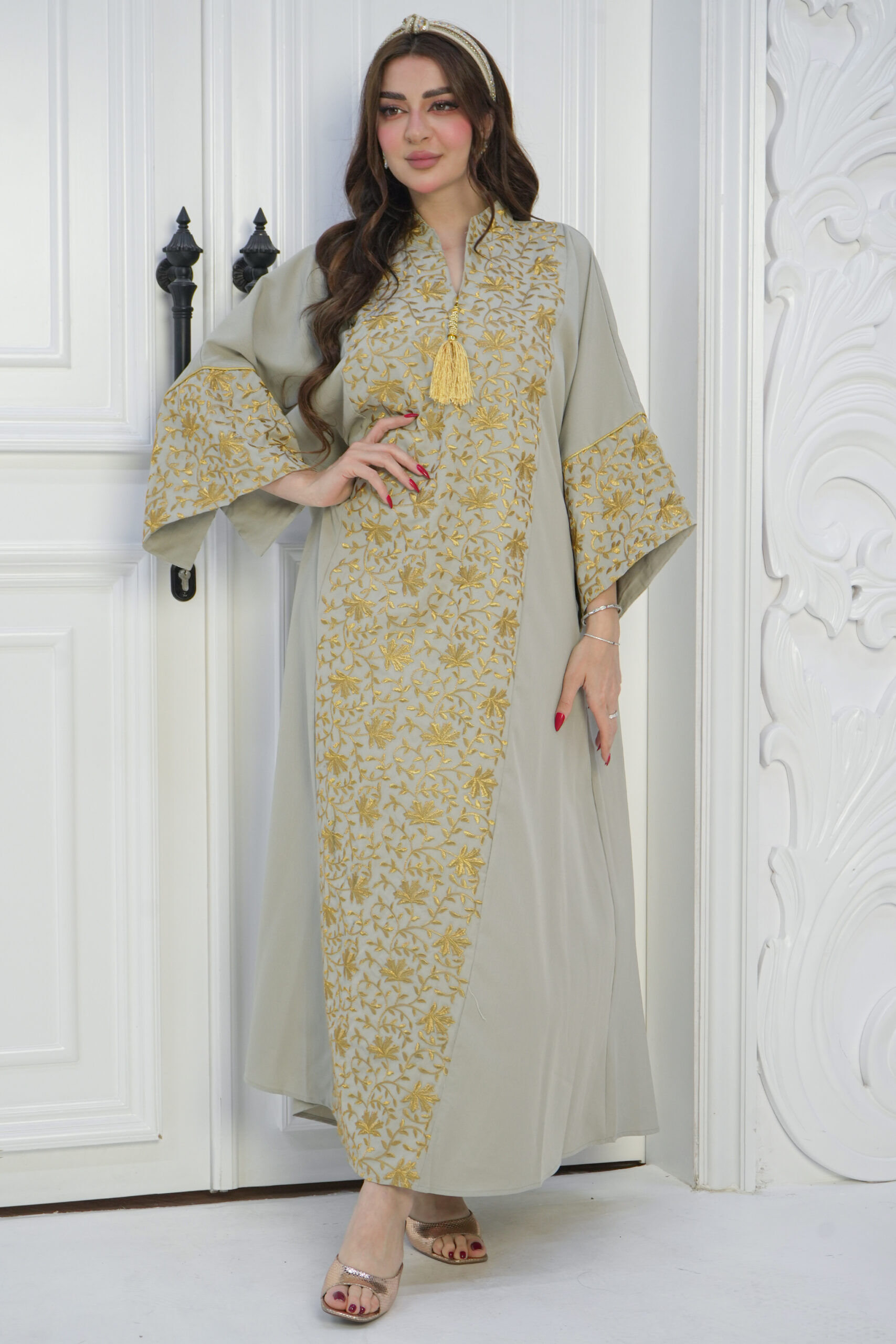 جلابية تيفاني مطرزة بذهبي فخمة تميز وجودك بين الحضور، خليها بخزانتك للمناسبات والجمعات العائلية.