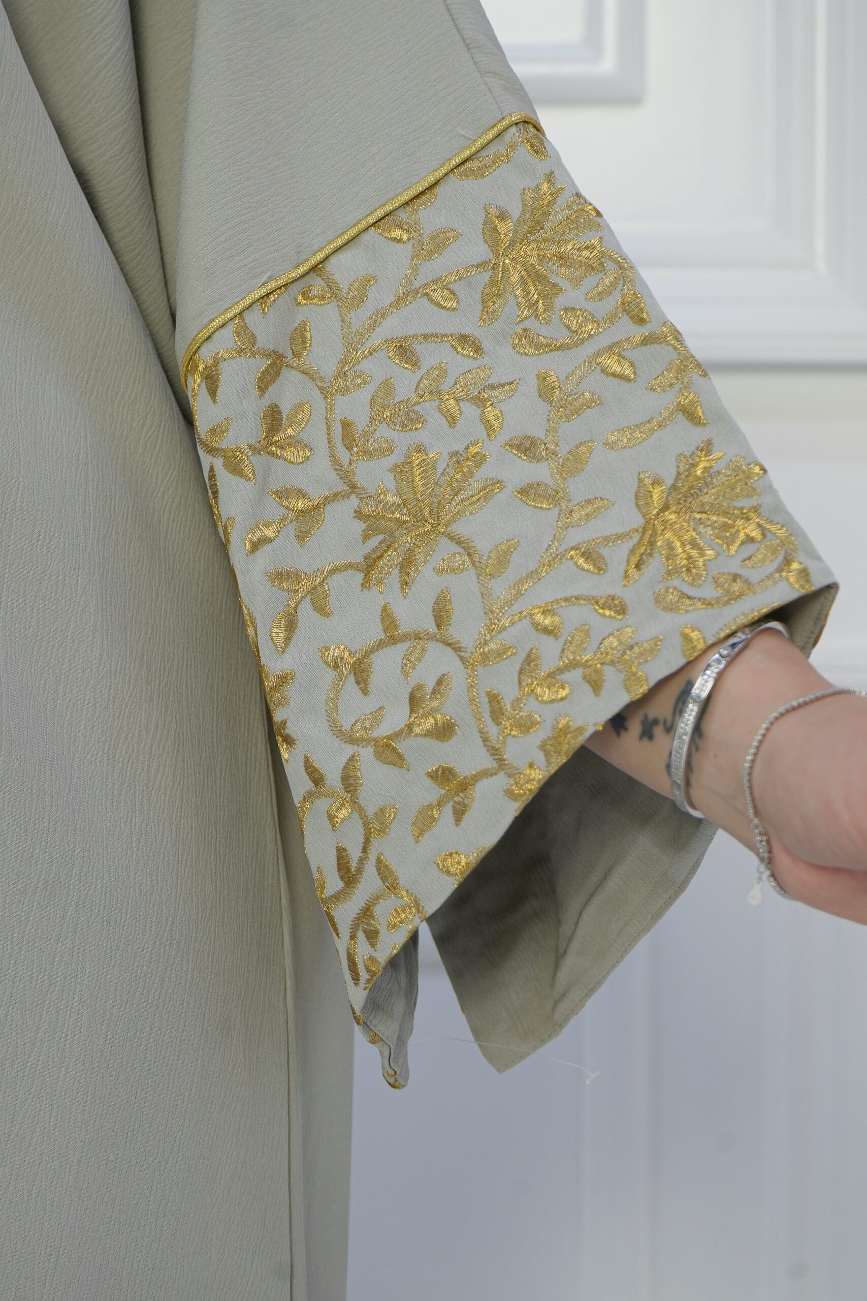 الجلابية نسجت من خامة قطن مطرز بذهبي مع خام كريب فيسكوز على الظهر، صممت بتطريز بلون ذهبي وباكمام كلوش لتمنحك إطلالة تستحقينها.