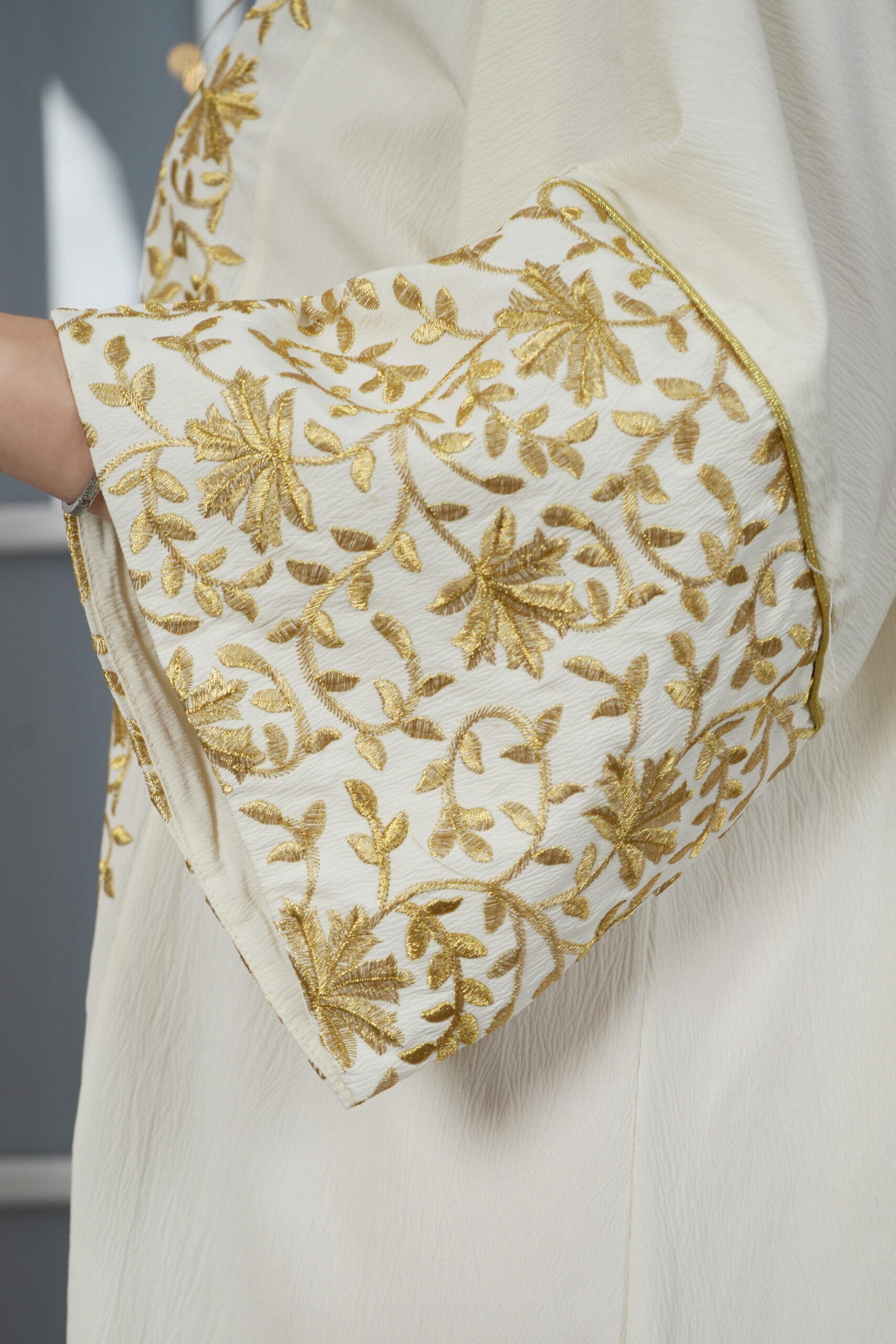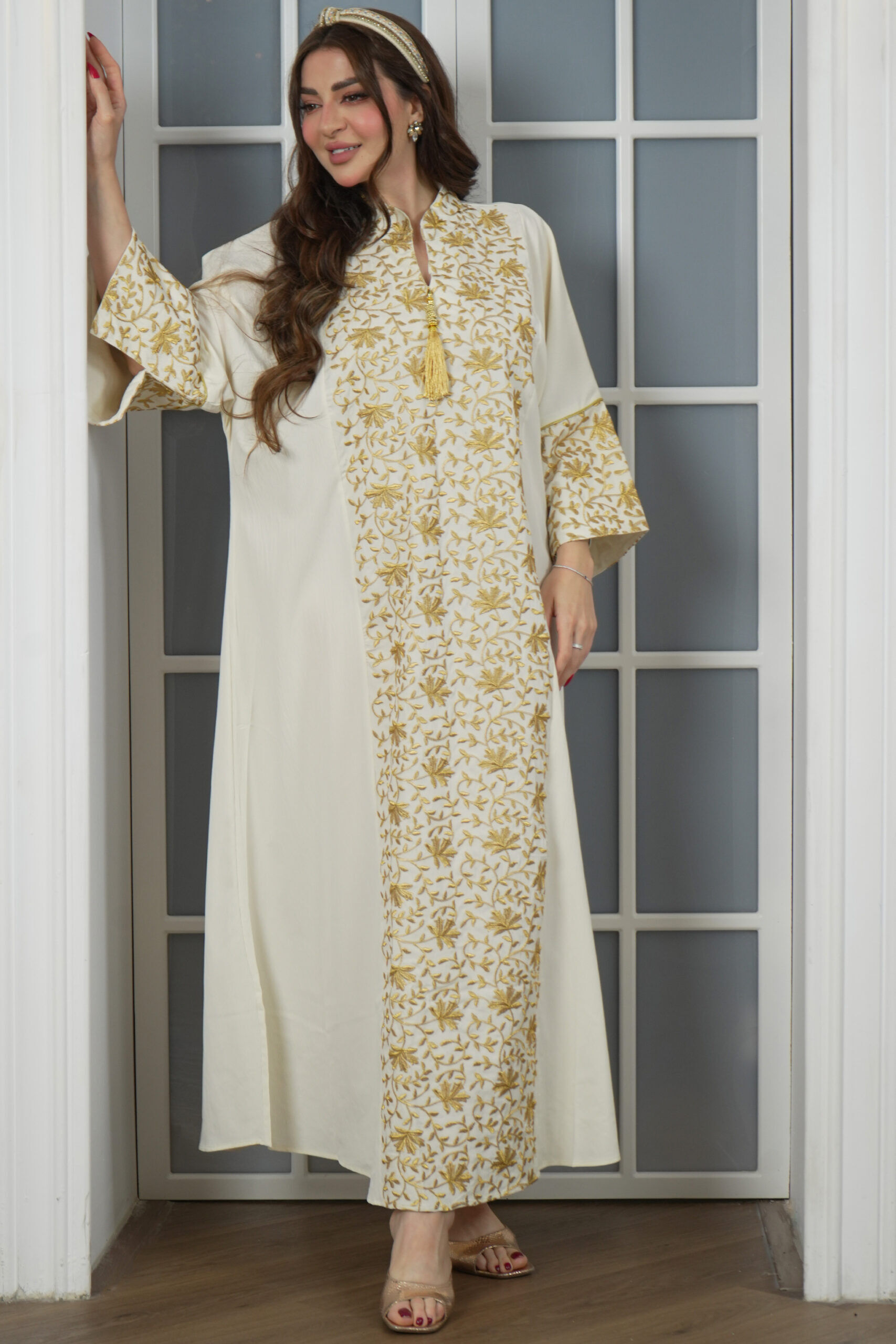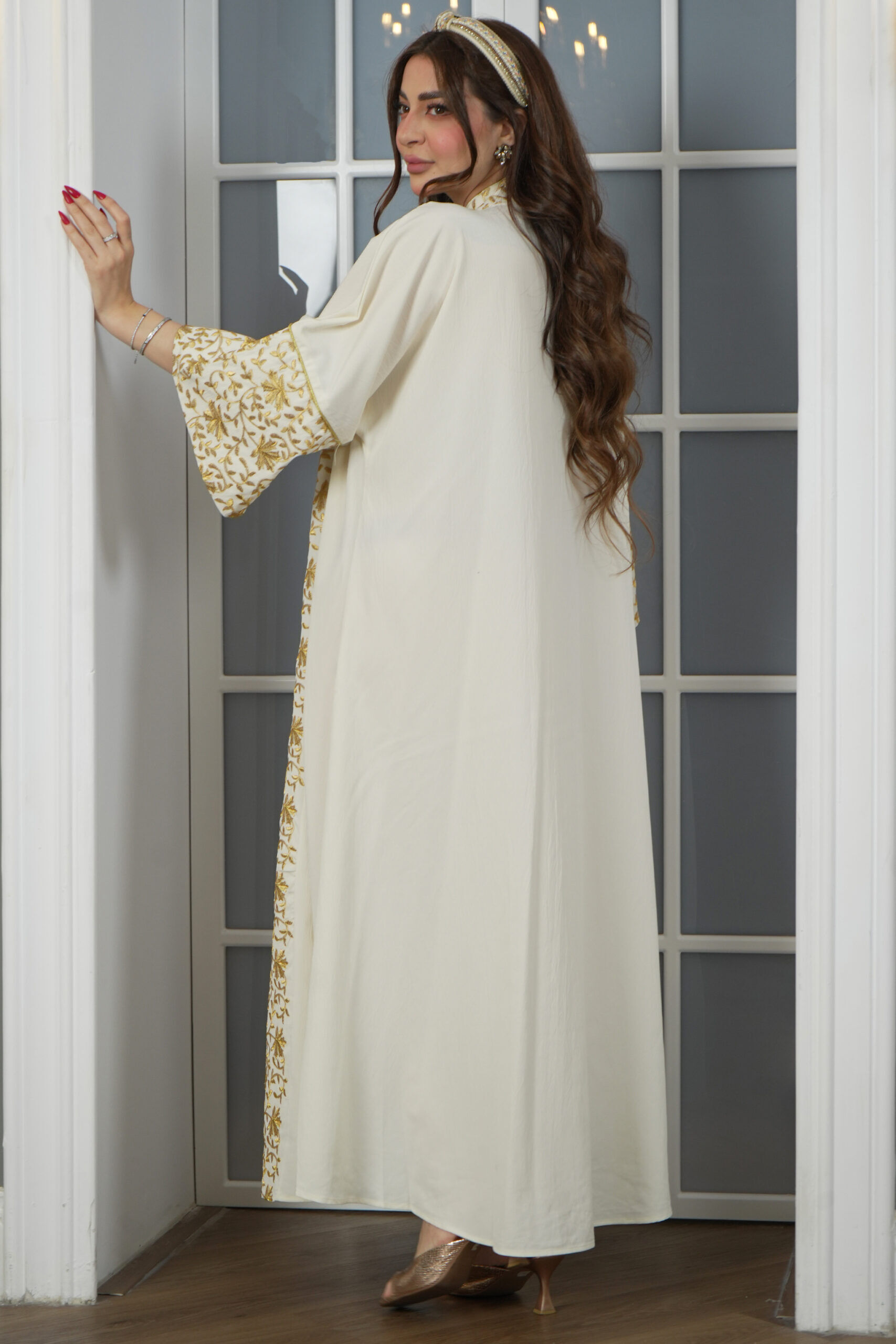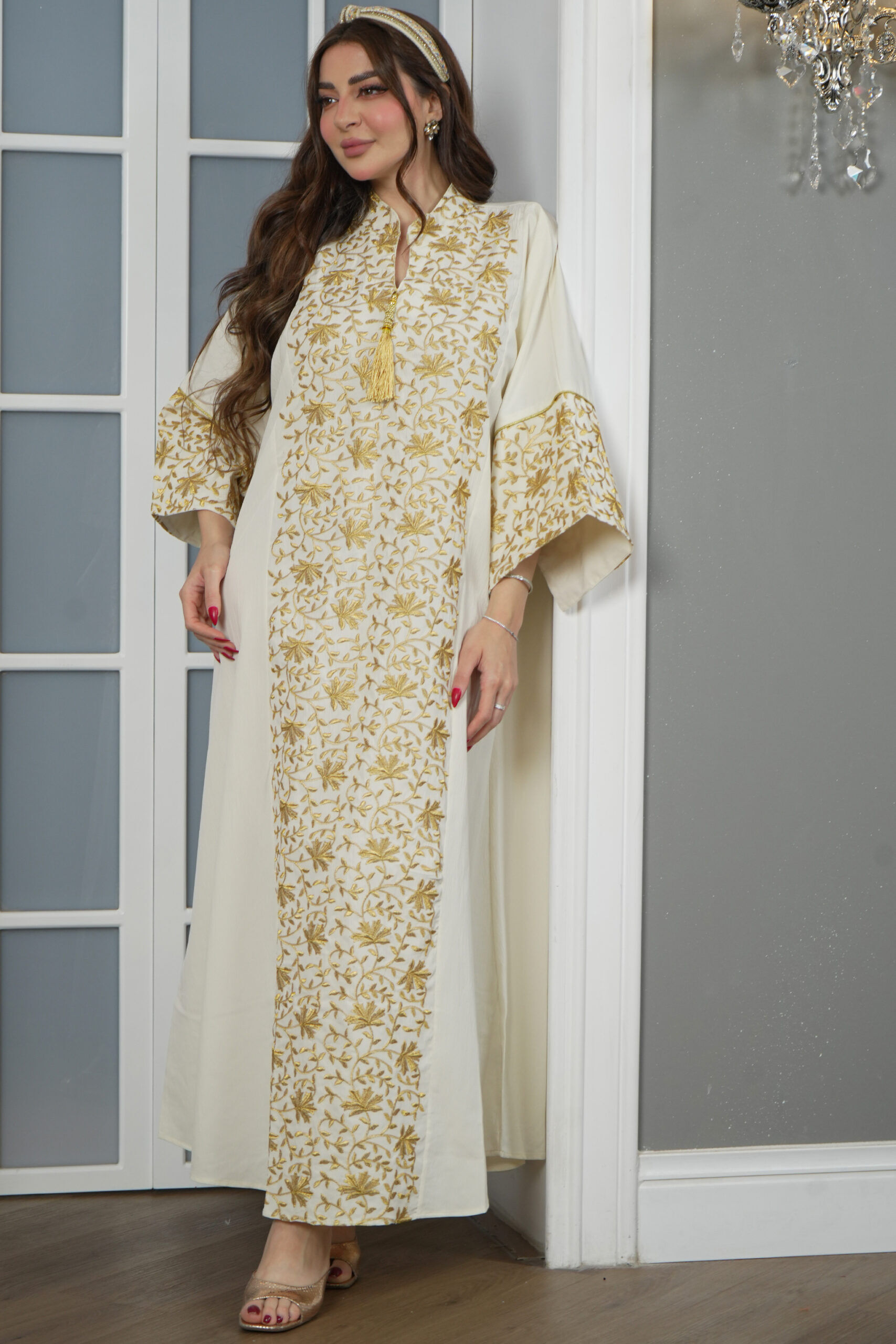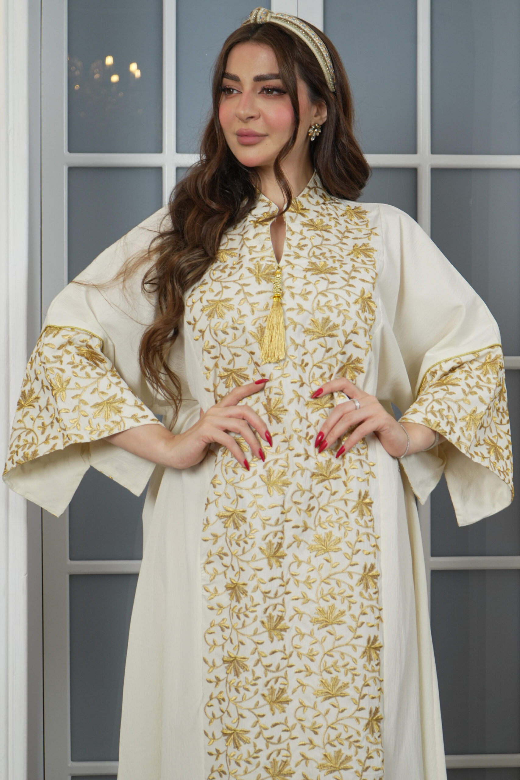 جلابية بيج مطرزة بذهبي فخمة تميز وجودك بين الحضور