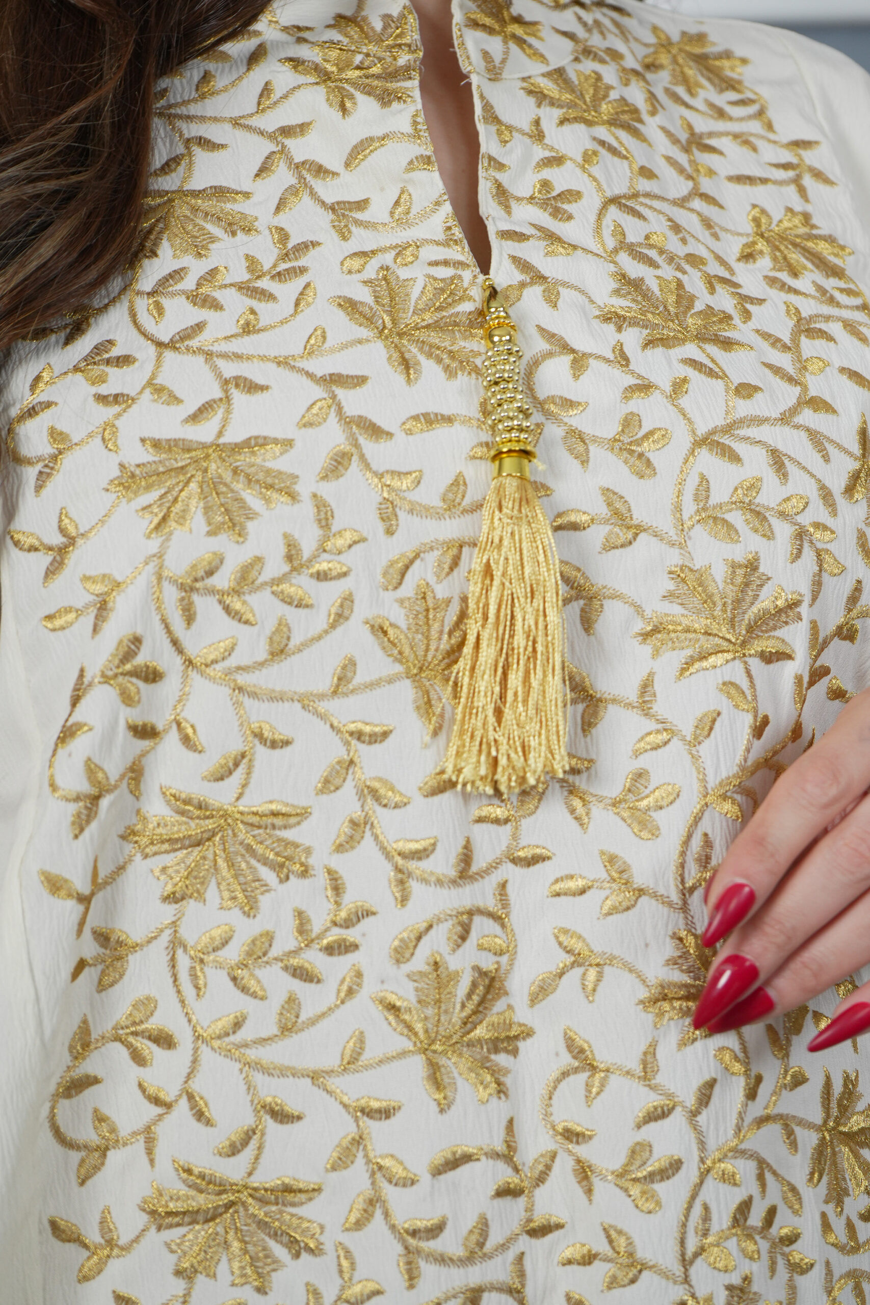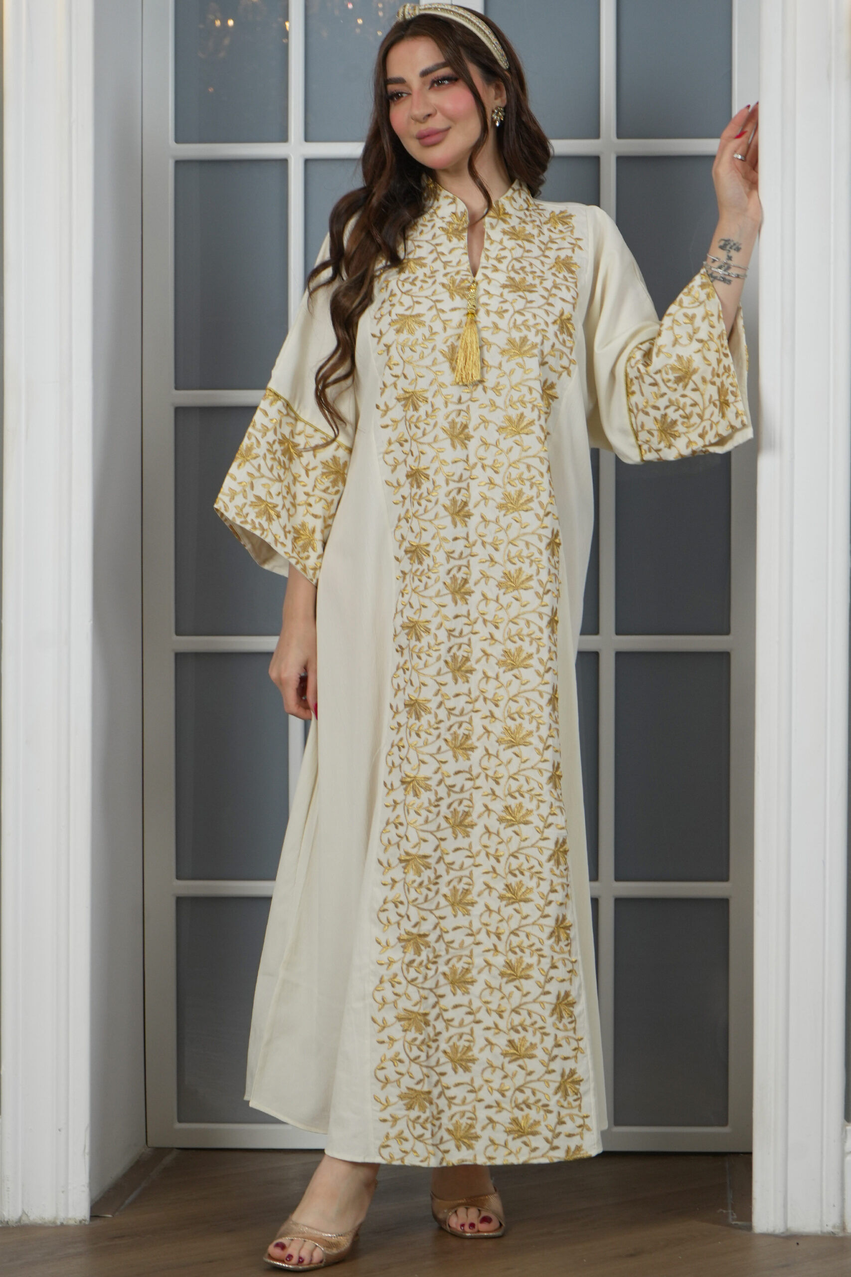 الجلابية نسجت من خامة قطن مطرز بذهبي مع خام كريب فيسكوز على الظهر، صممت بتطريز بلون ذهبي وباكمام كلوش لتمنحك إطلالة تستحقينها.