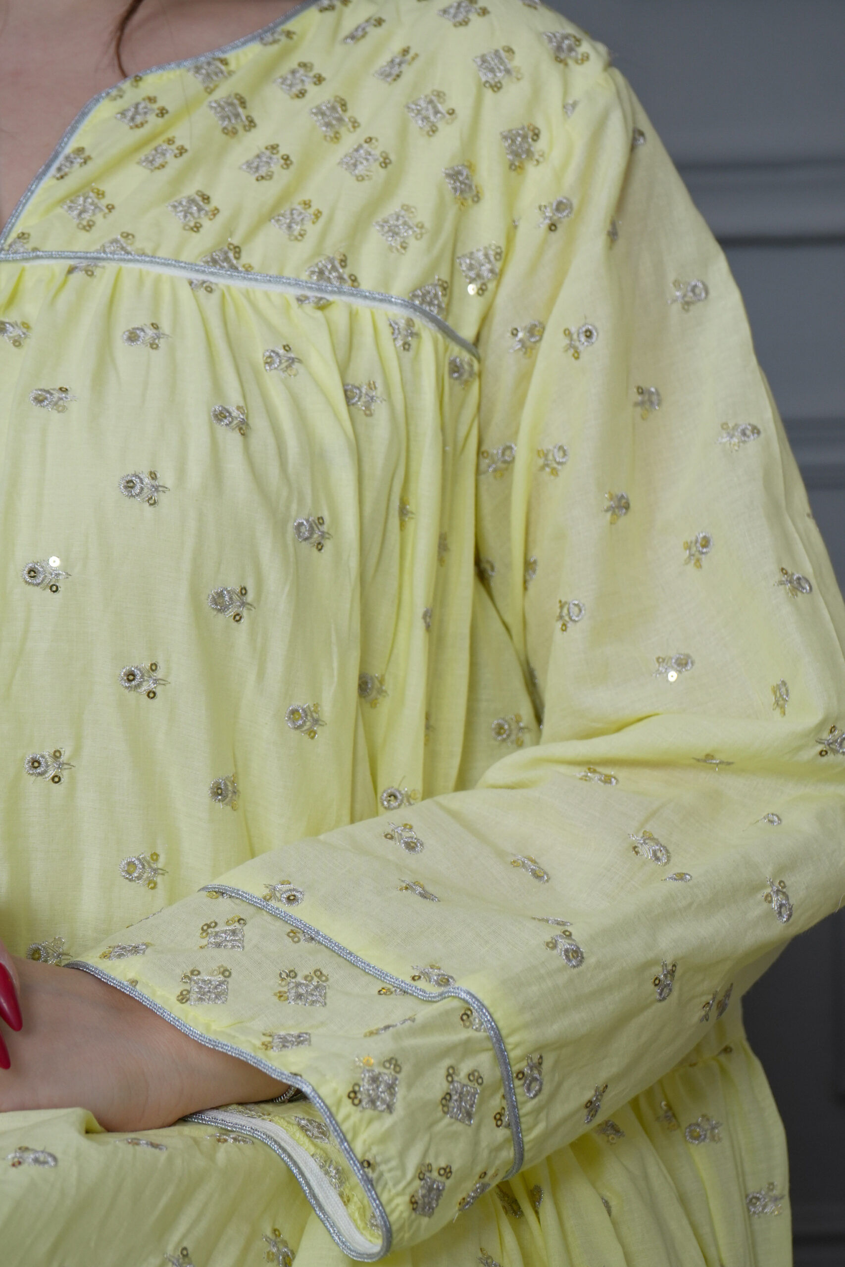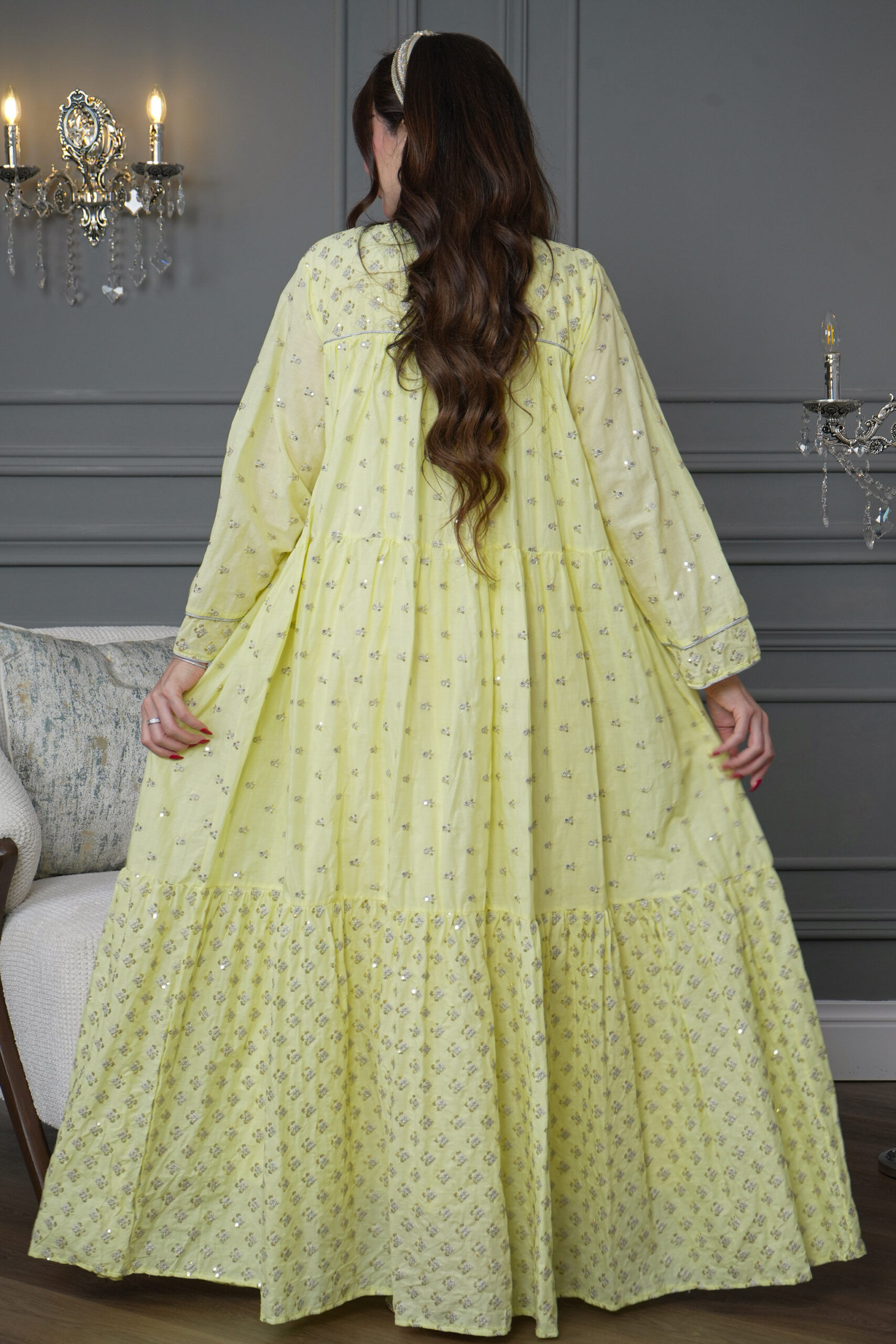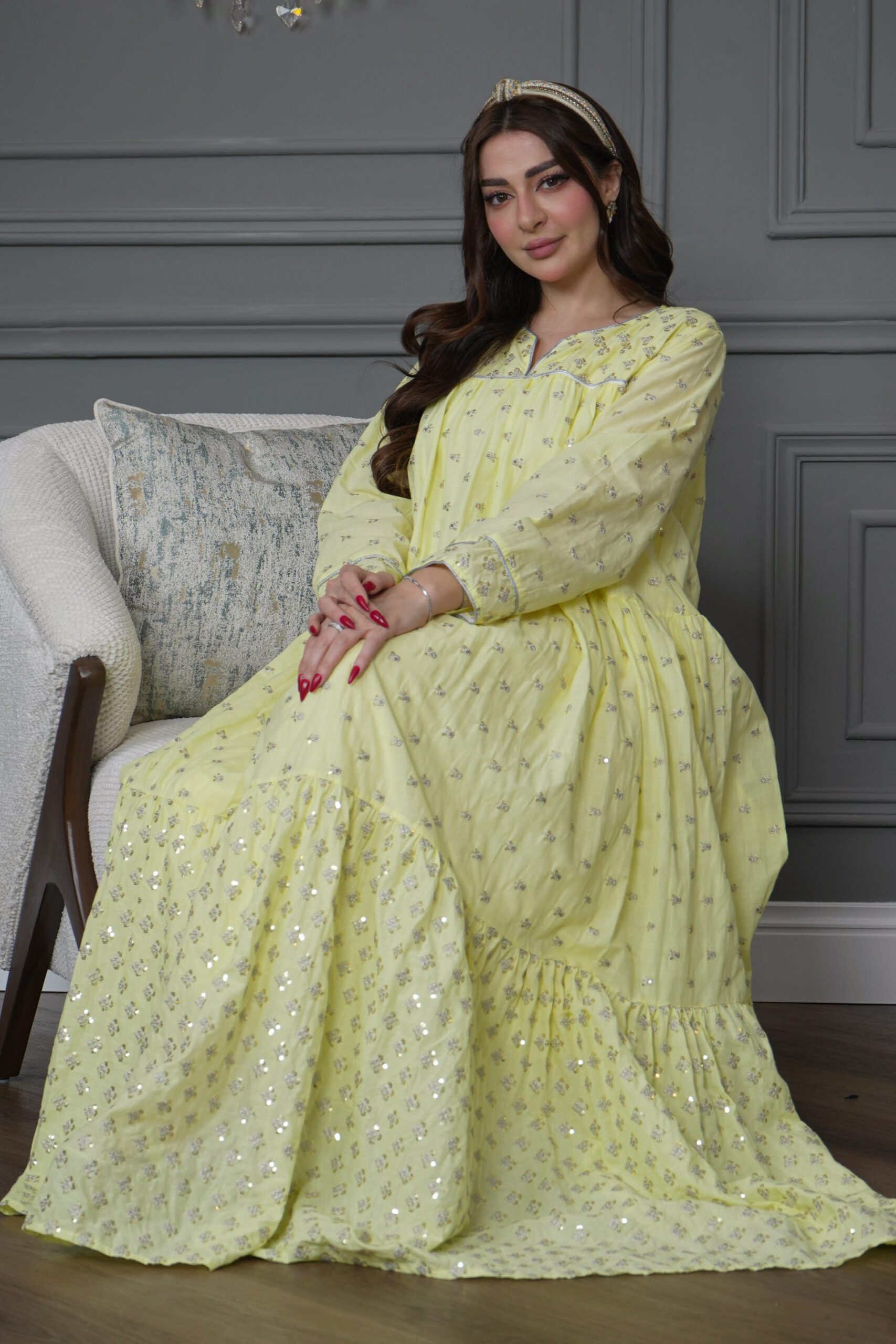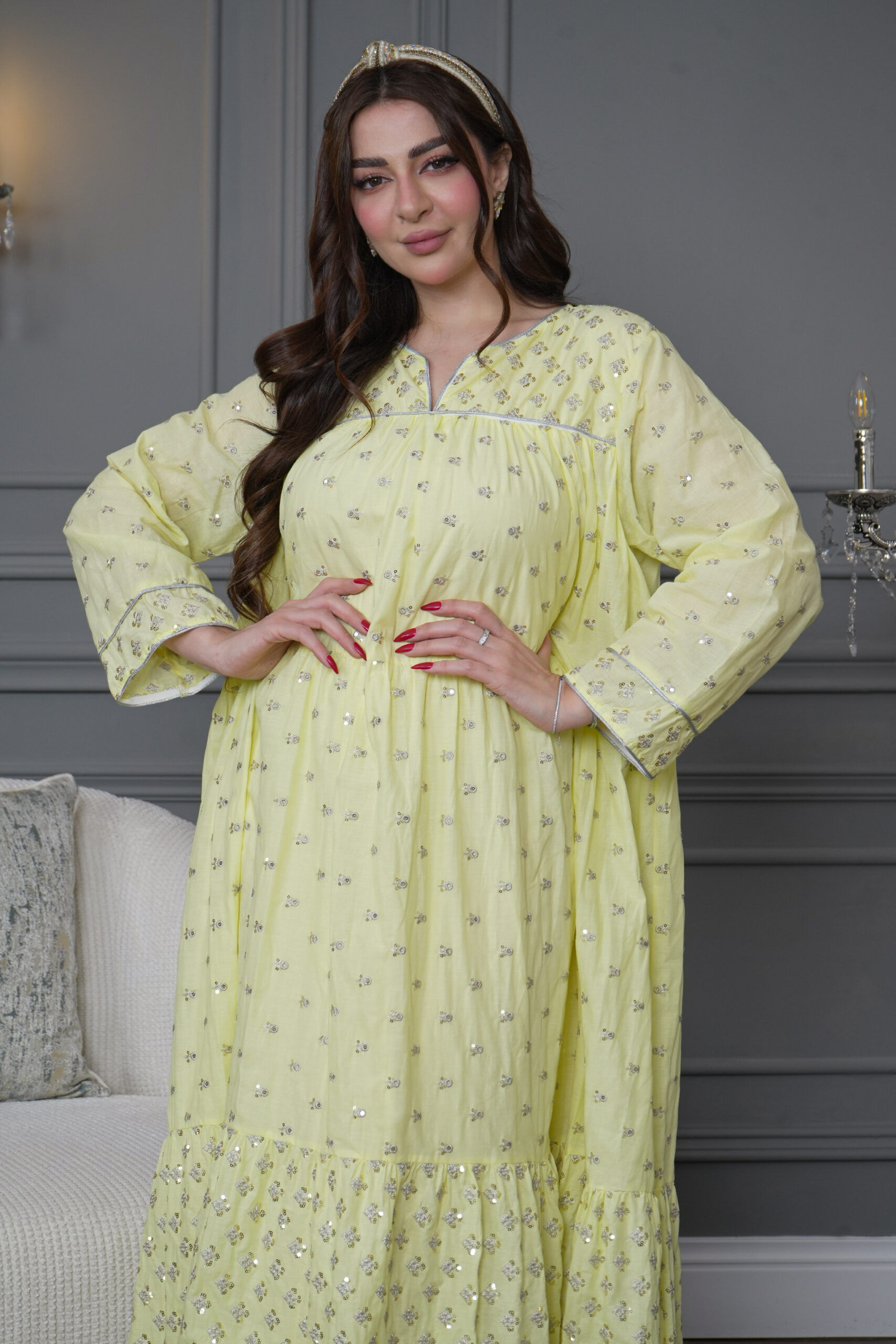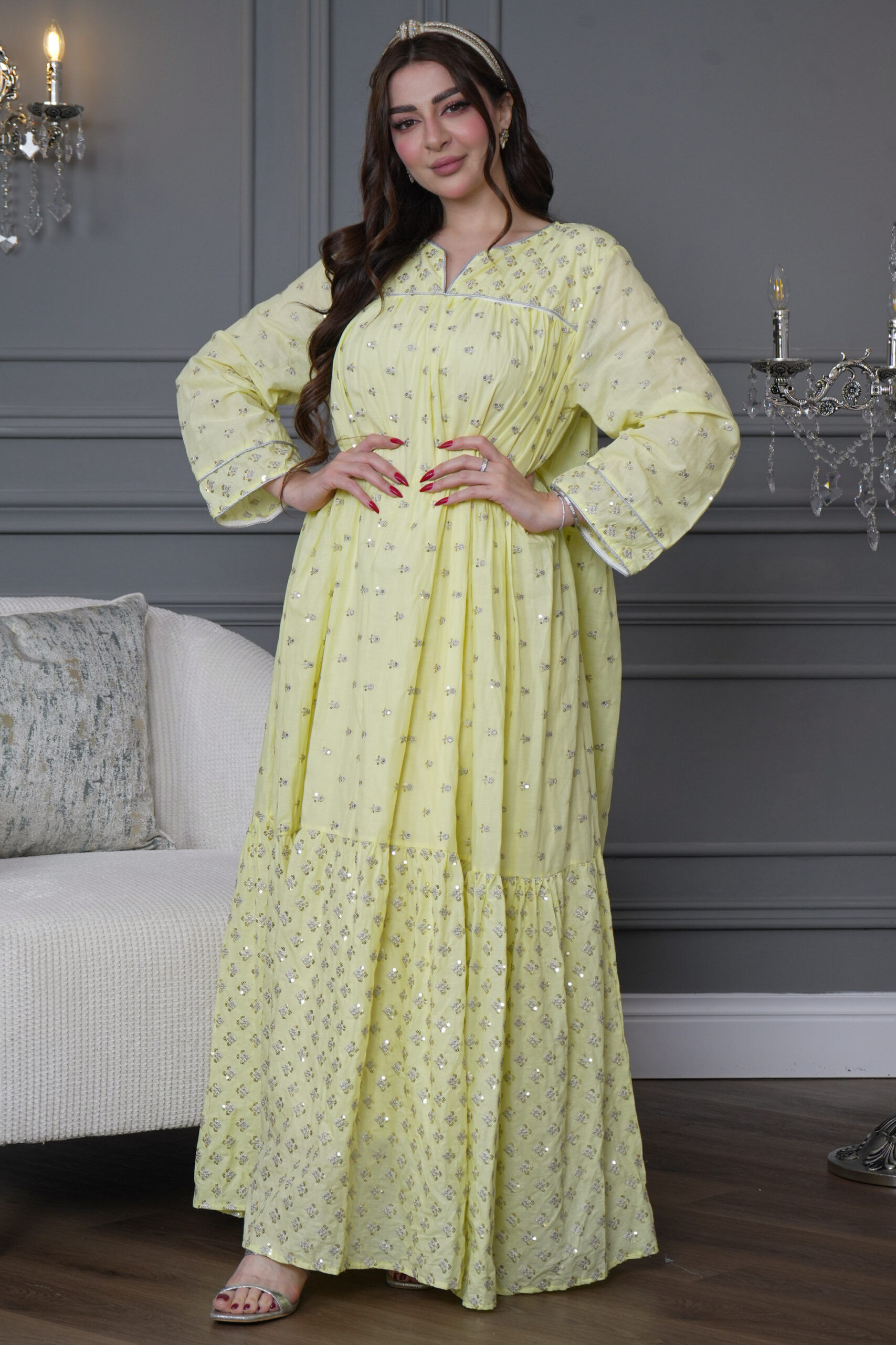 - اسم المنتج : جلابيه اصفر مطرزه بترتر على شكل ورود صغير