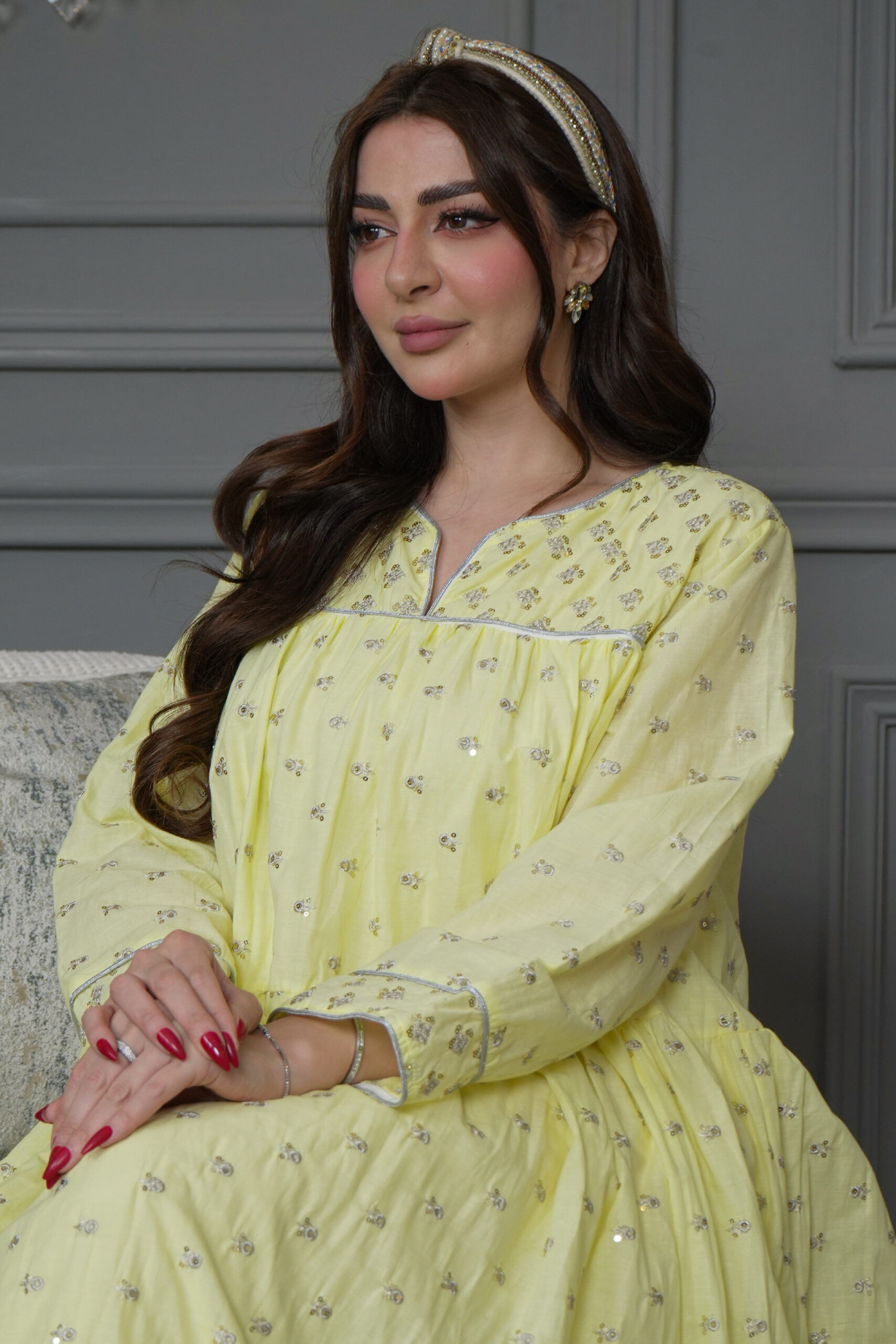 جلابيه اصفر بكلوش صغير و ترتر كامل على شكل ورود صغير