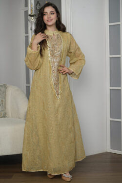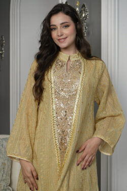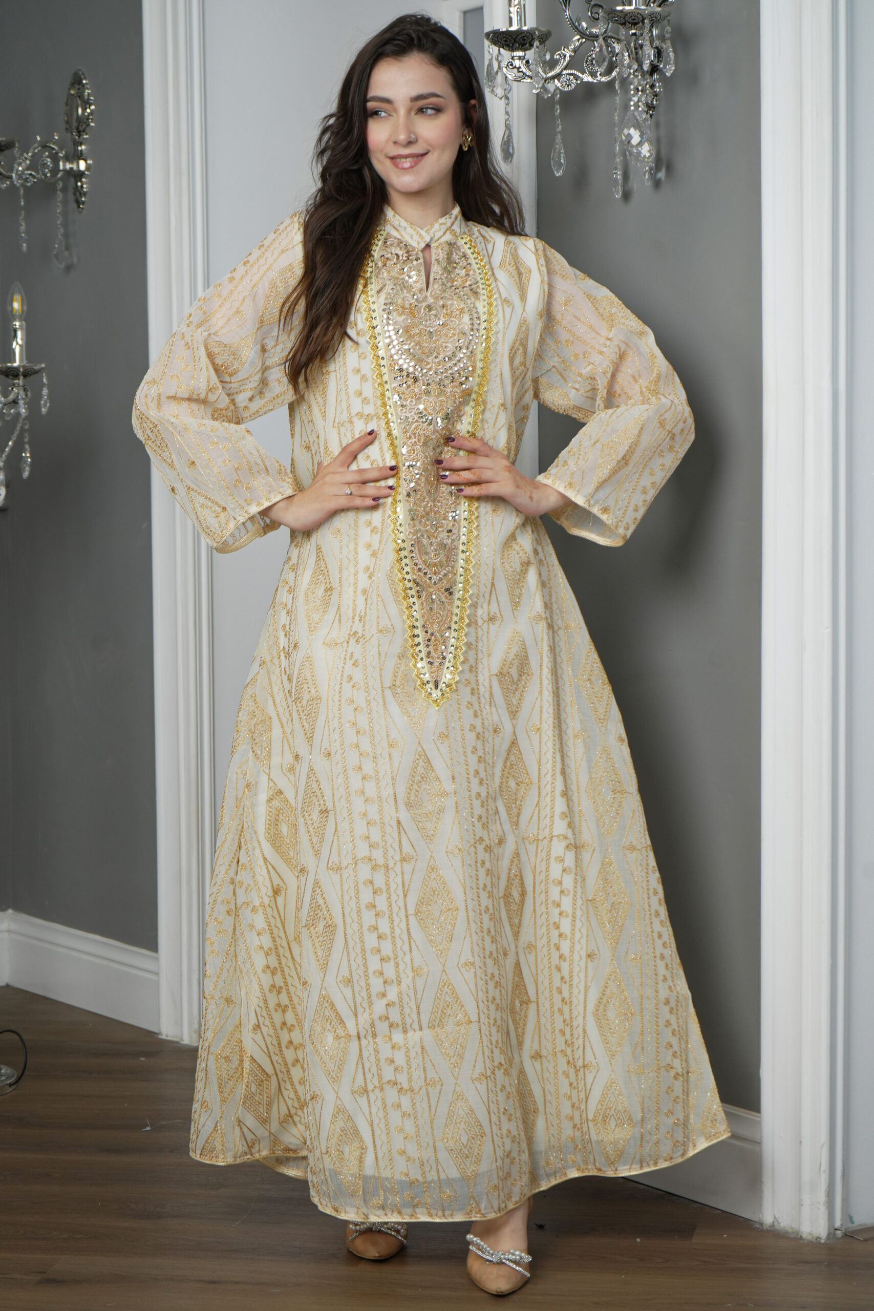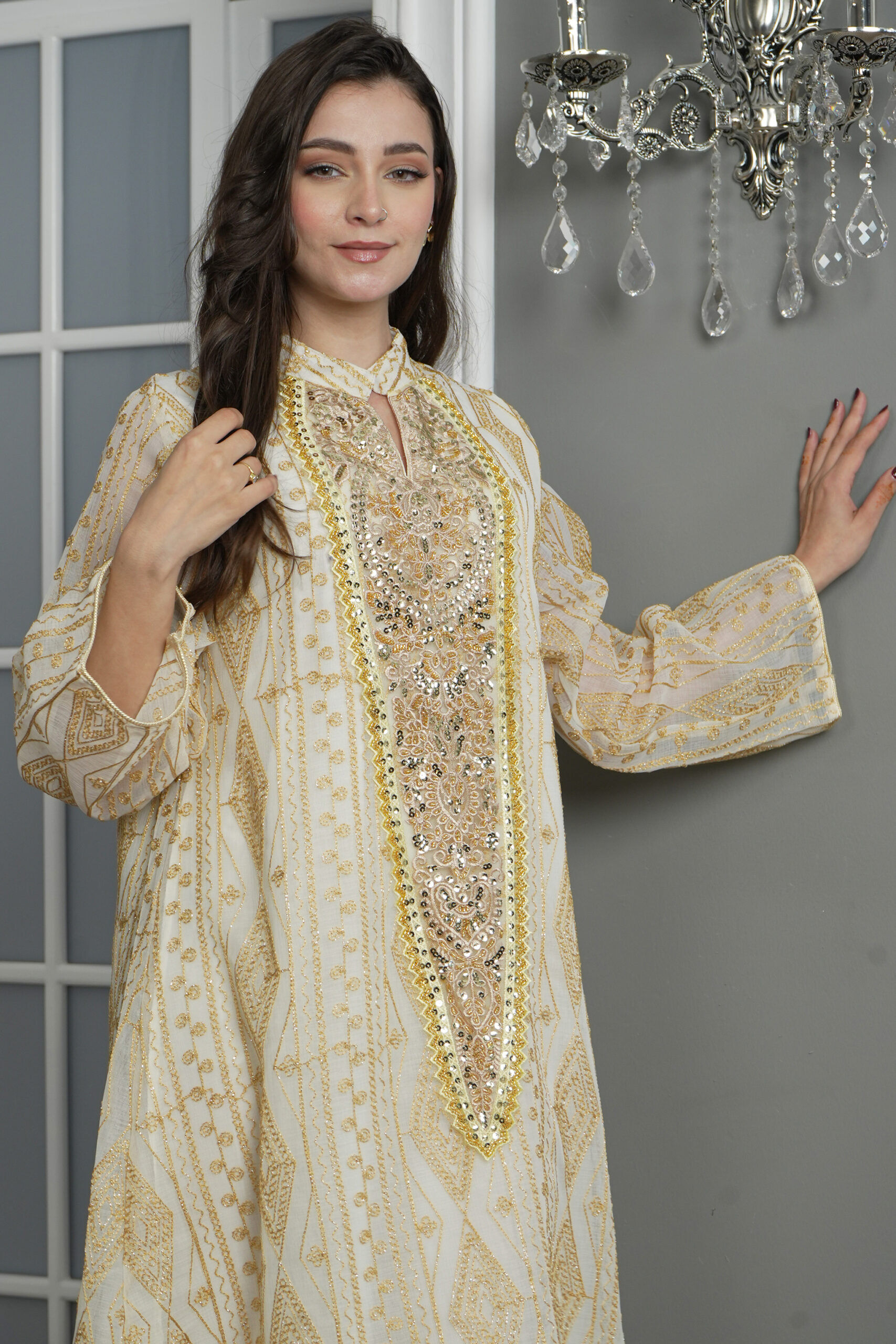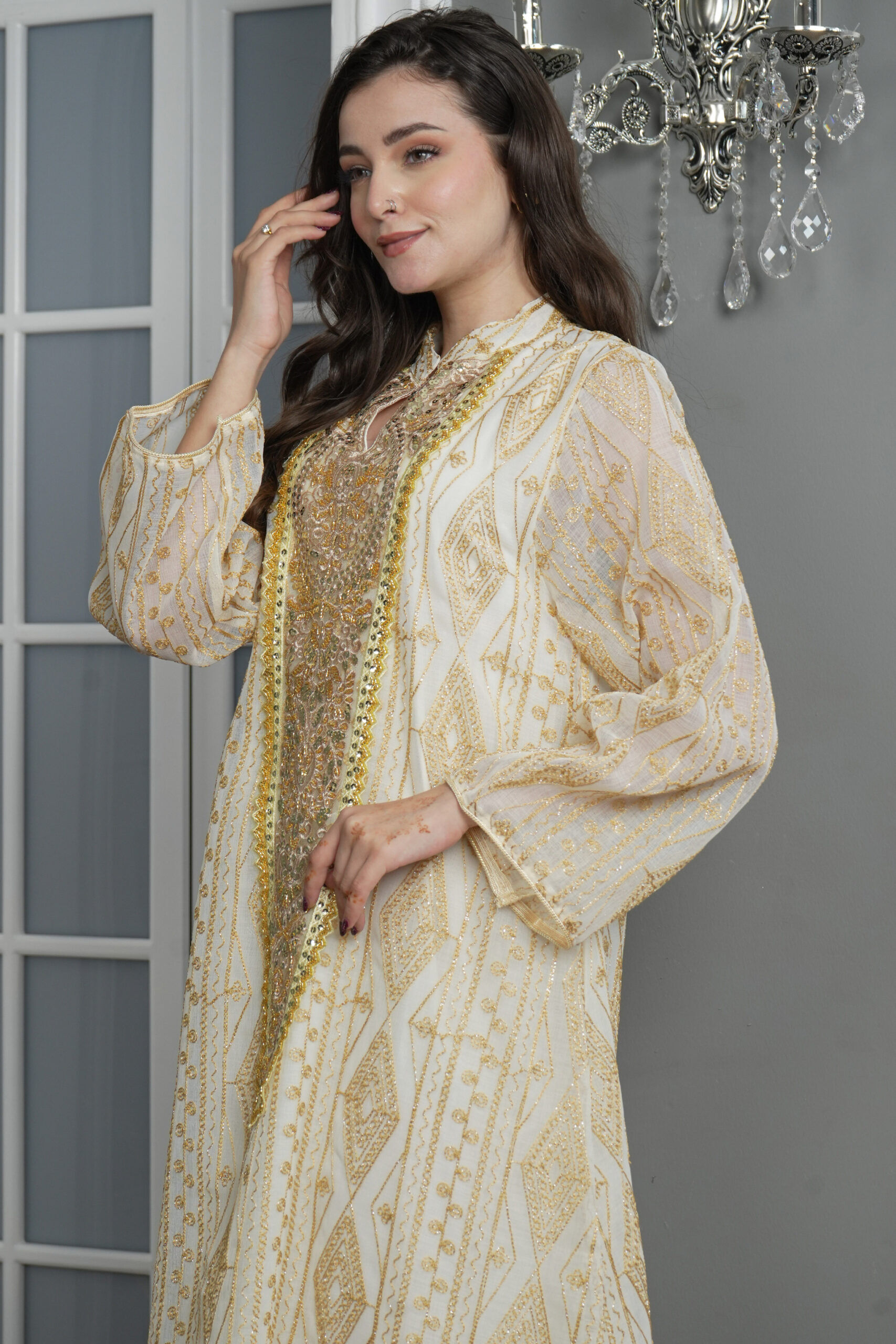 - الموديل: جلابية مطرزة بذهبي فخمة