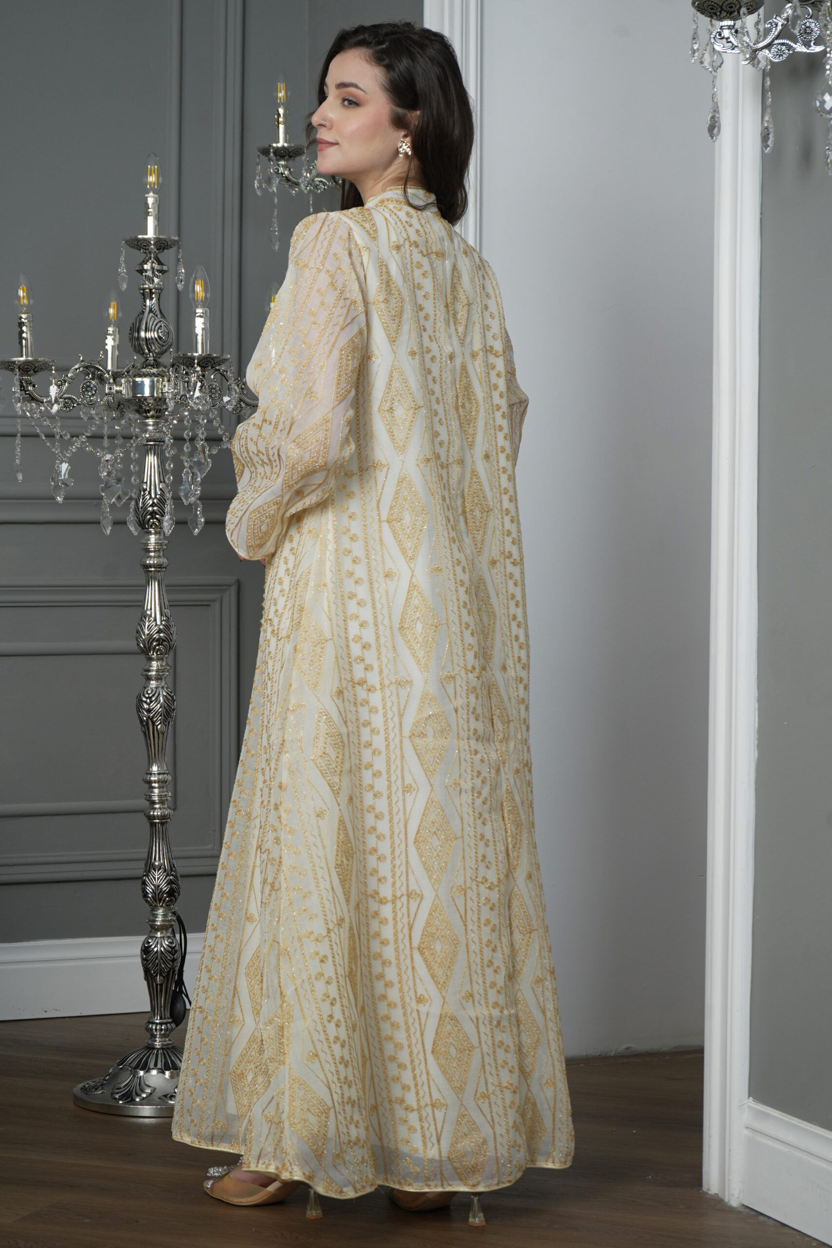 جلابية بيج مطرزة بذهبي فخمة تميز وجودك بين الحضور، خليها بخزانتك للمناسبات والجمعات العائلية.