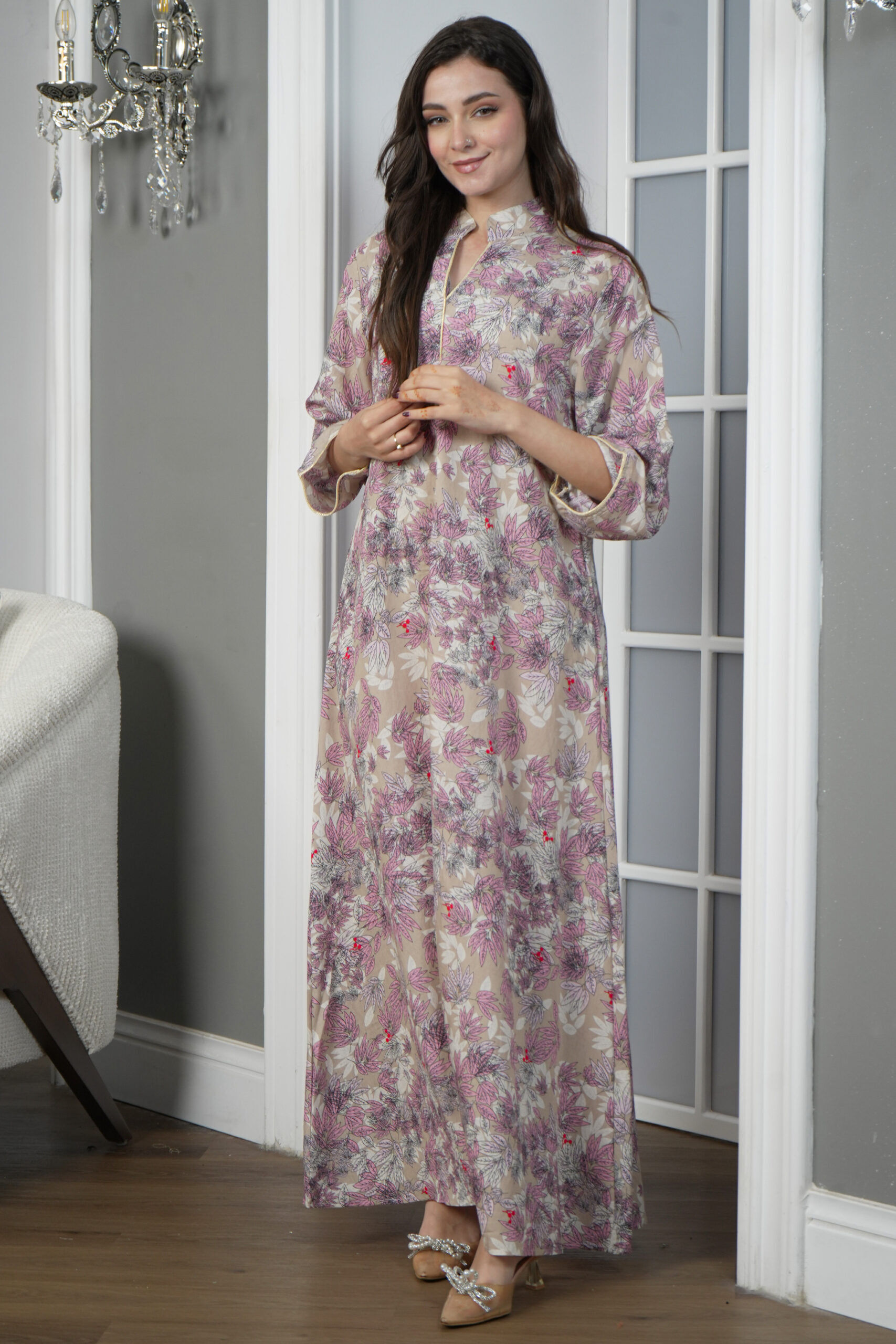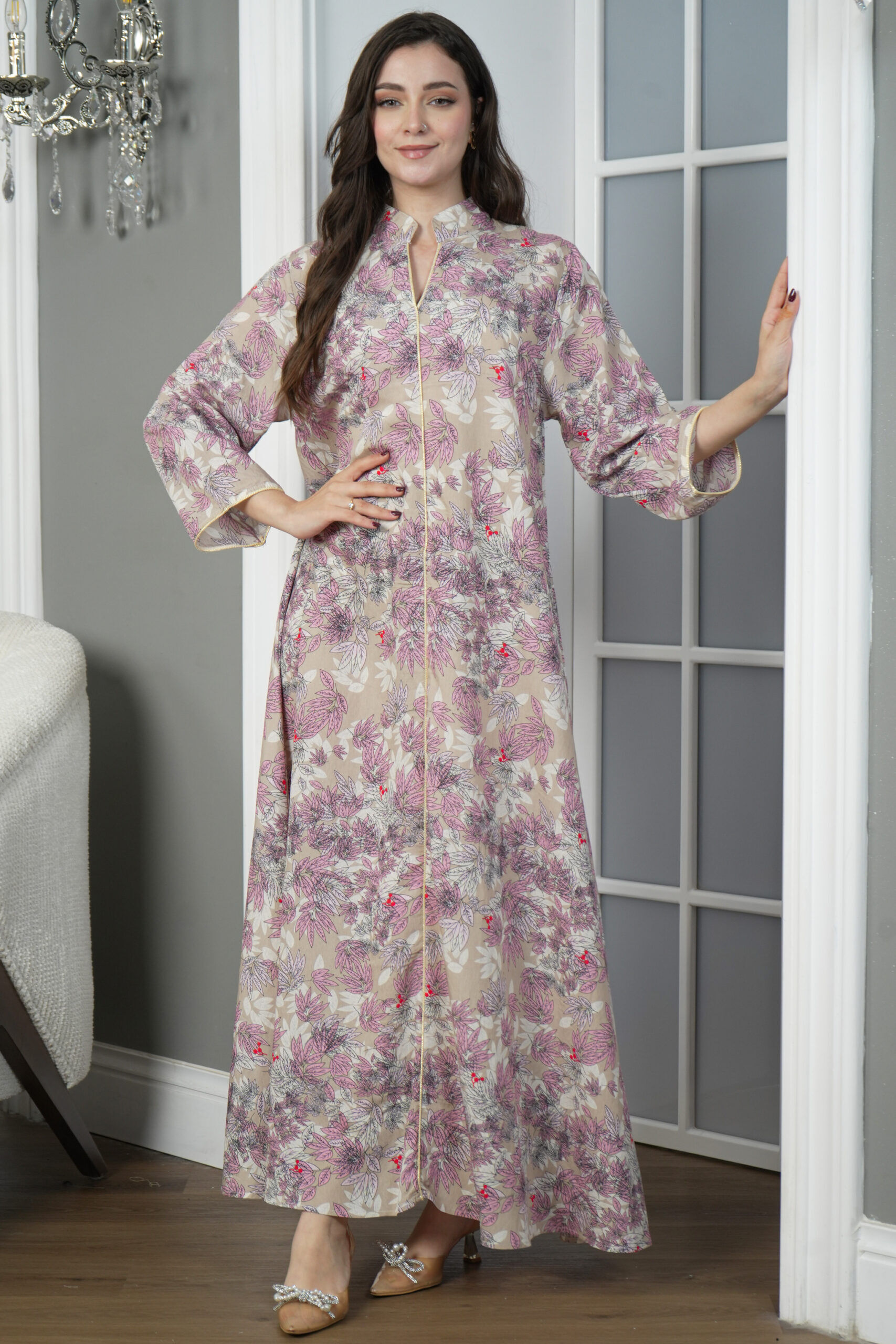 جلابيه بيج قطن بلياقه مشجره بورود زهريه (4)