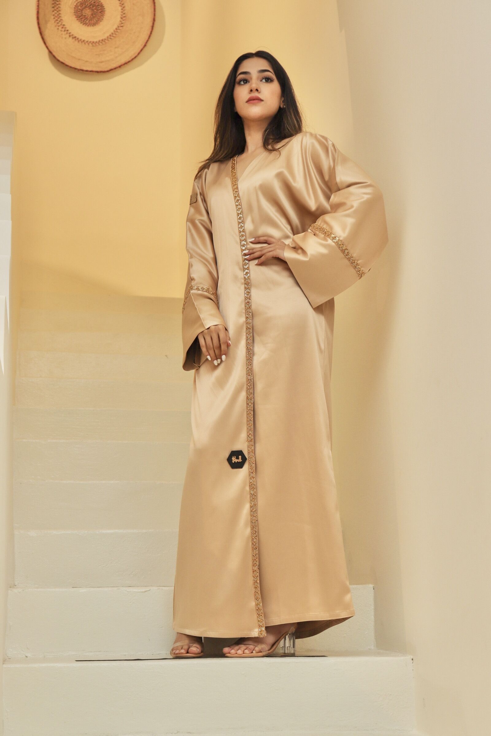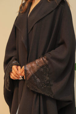عباية لف أنيقة، مصممة من قماش الحرير المقلد من الطبيعي وثقيل وبميزة السترتش، ويميز العباية تدخيلة الجازار ذات اللمعه الطبيعية الهادئة على شكل حبيبات فصوص اللامعه على الأكمام تضيف لمسات ساحرة على شكل وأناقة العباية
