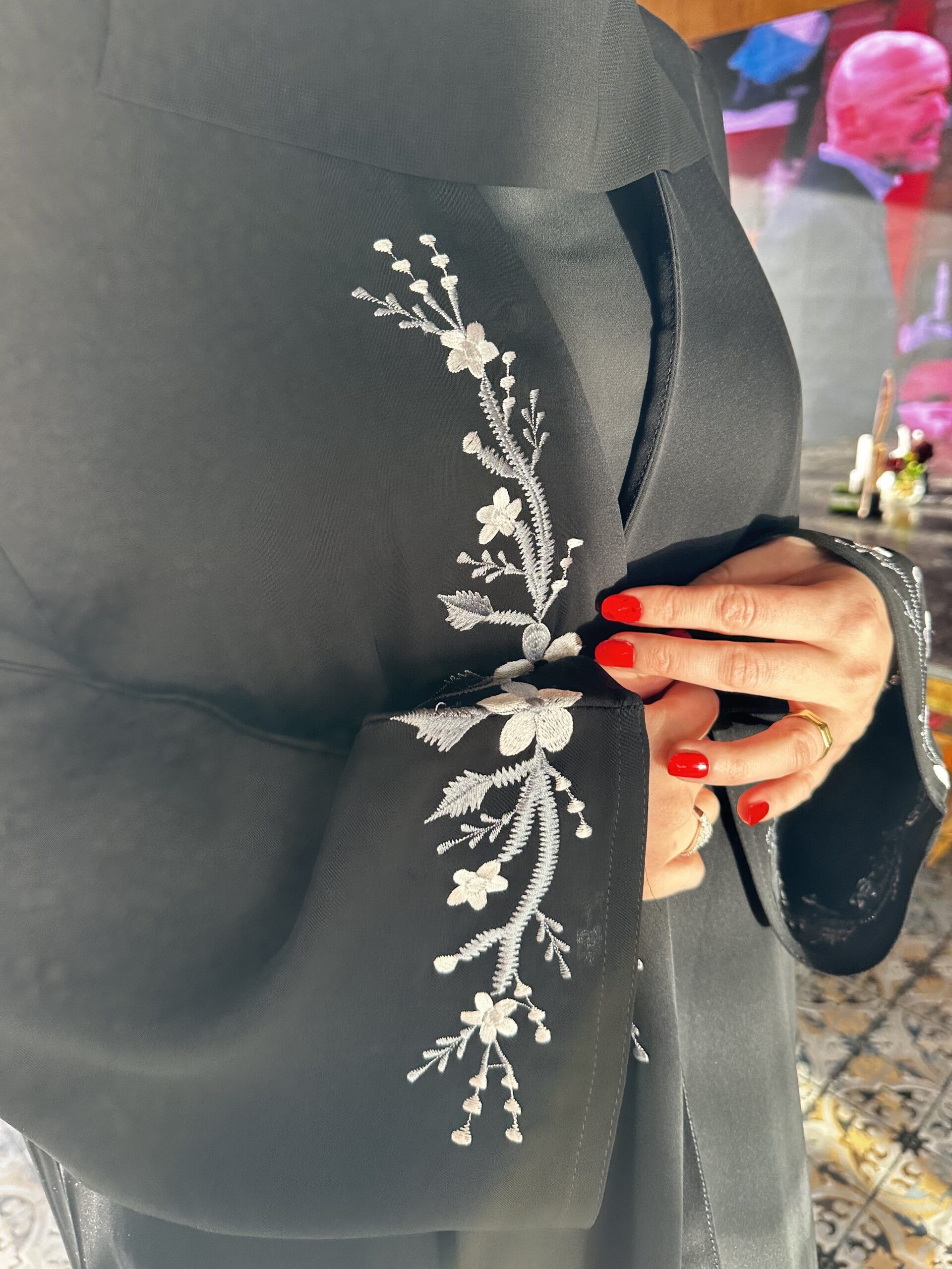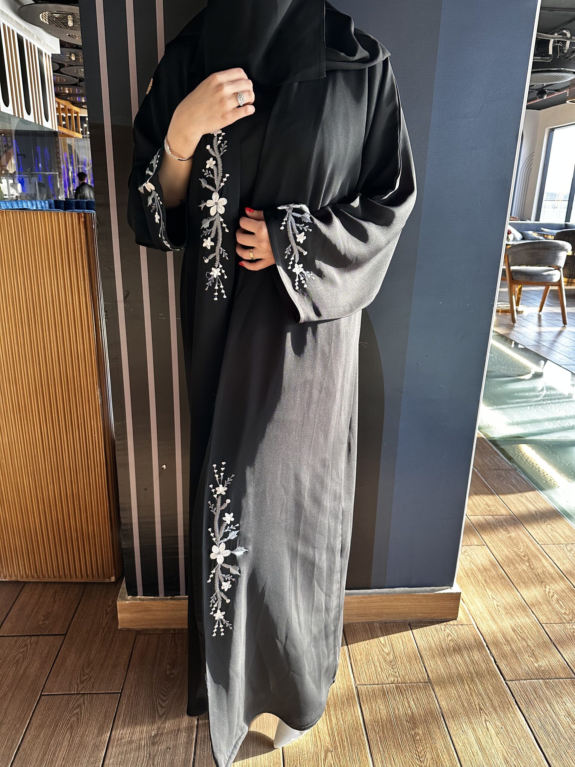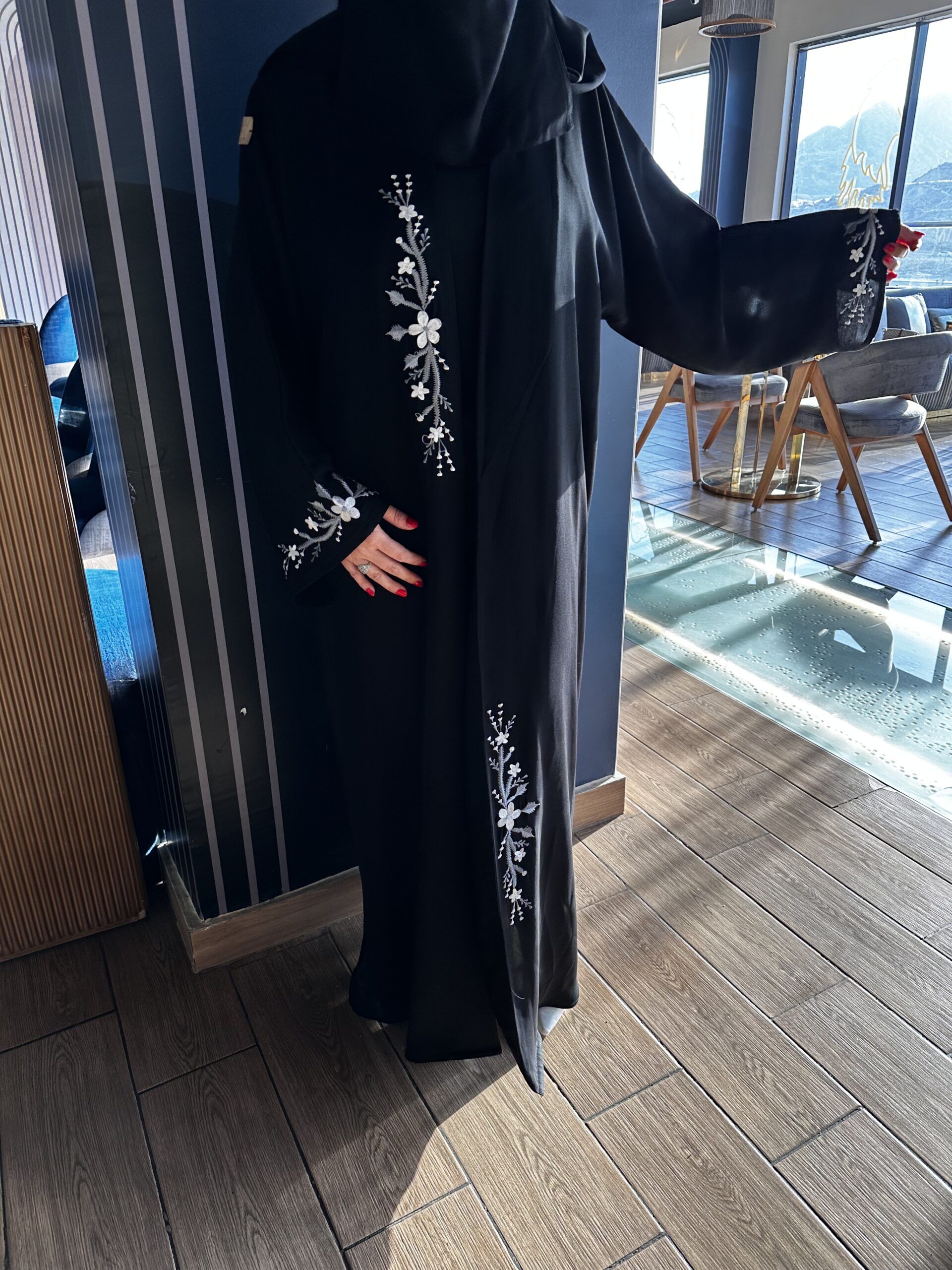عباية سوداء مطرزه بشك فضي ( تطريز 1 )