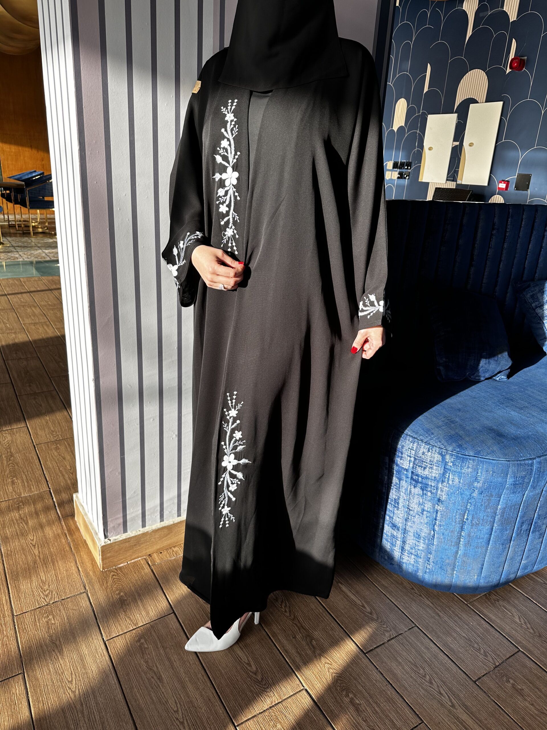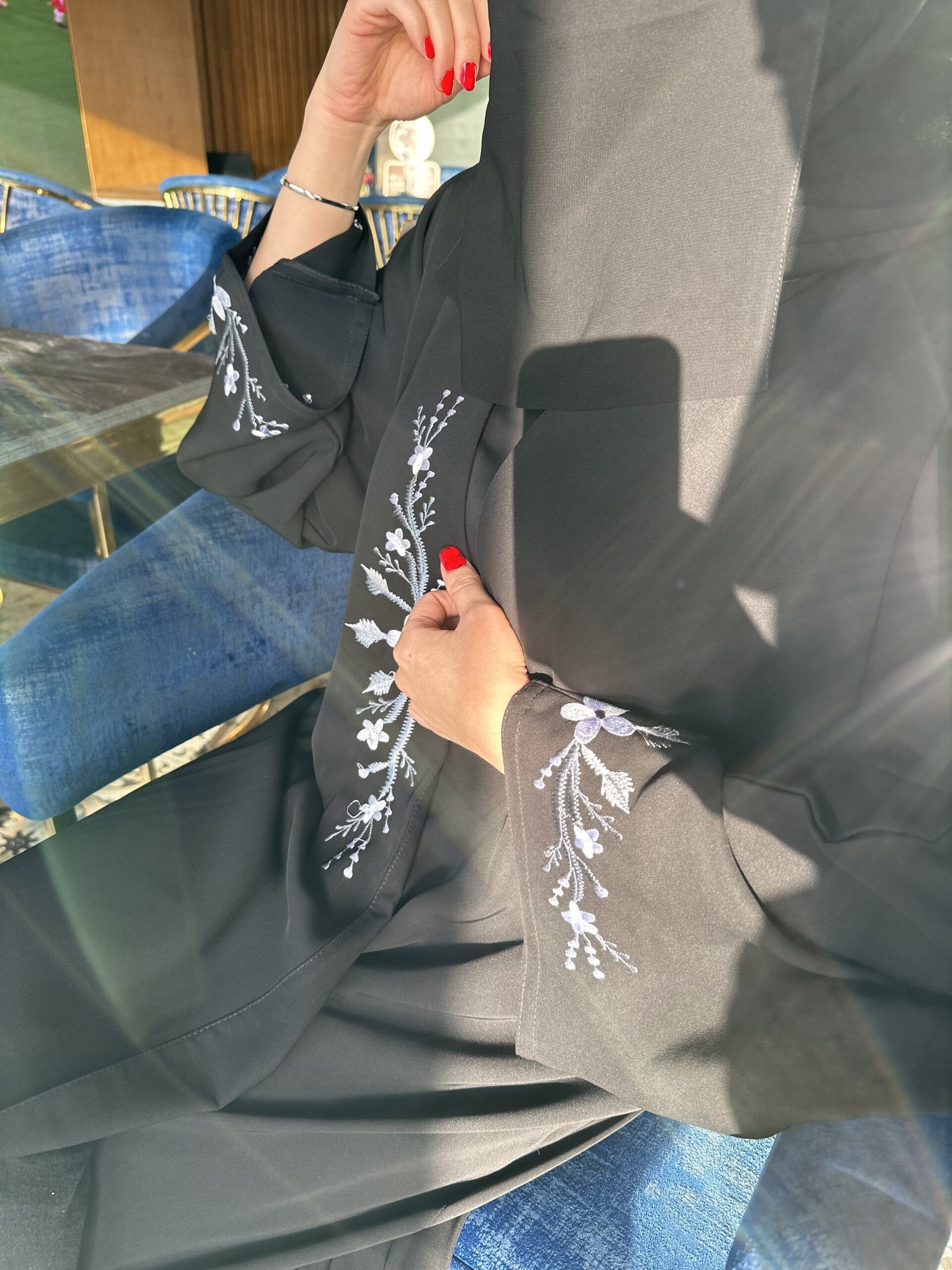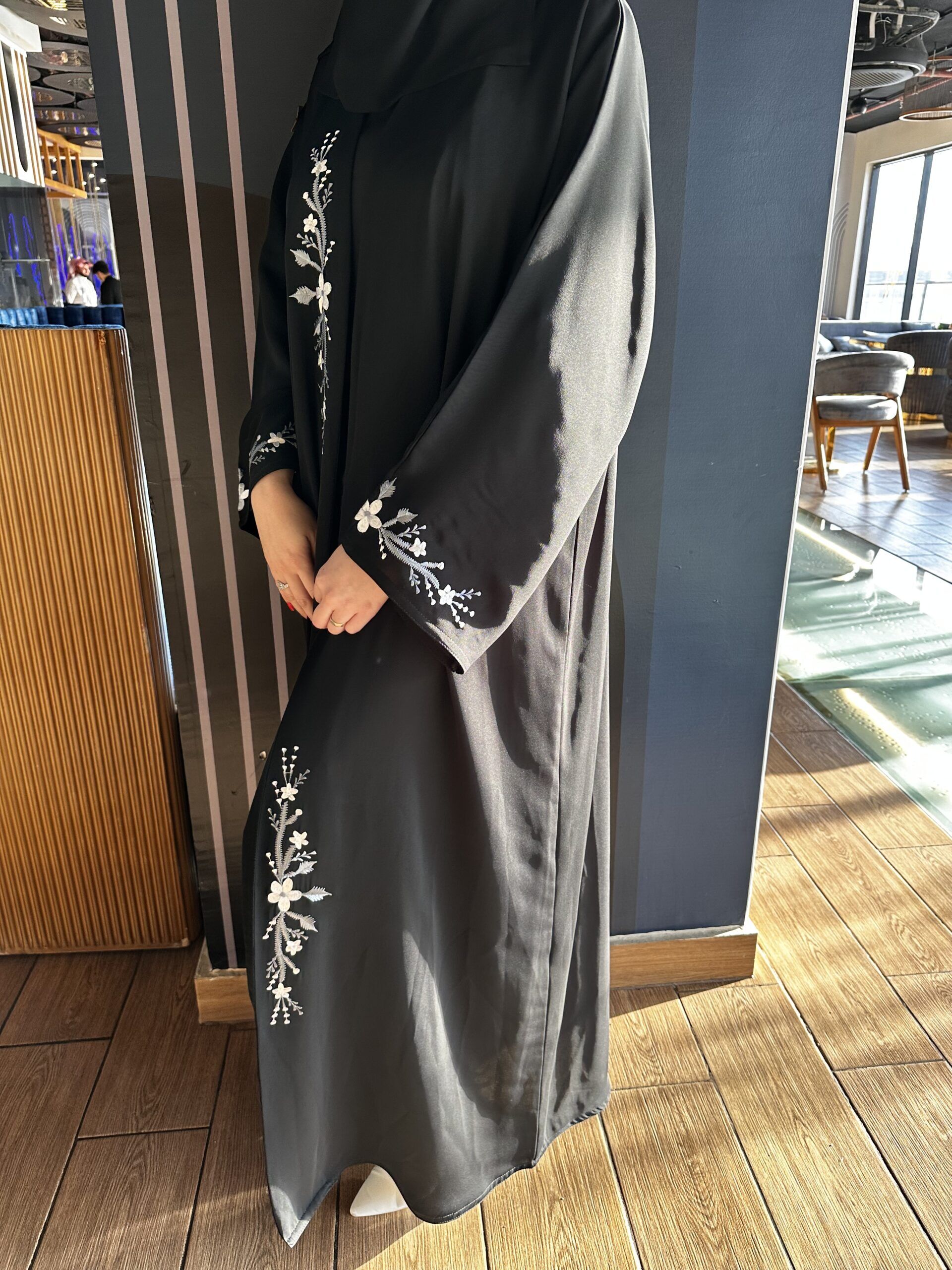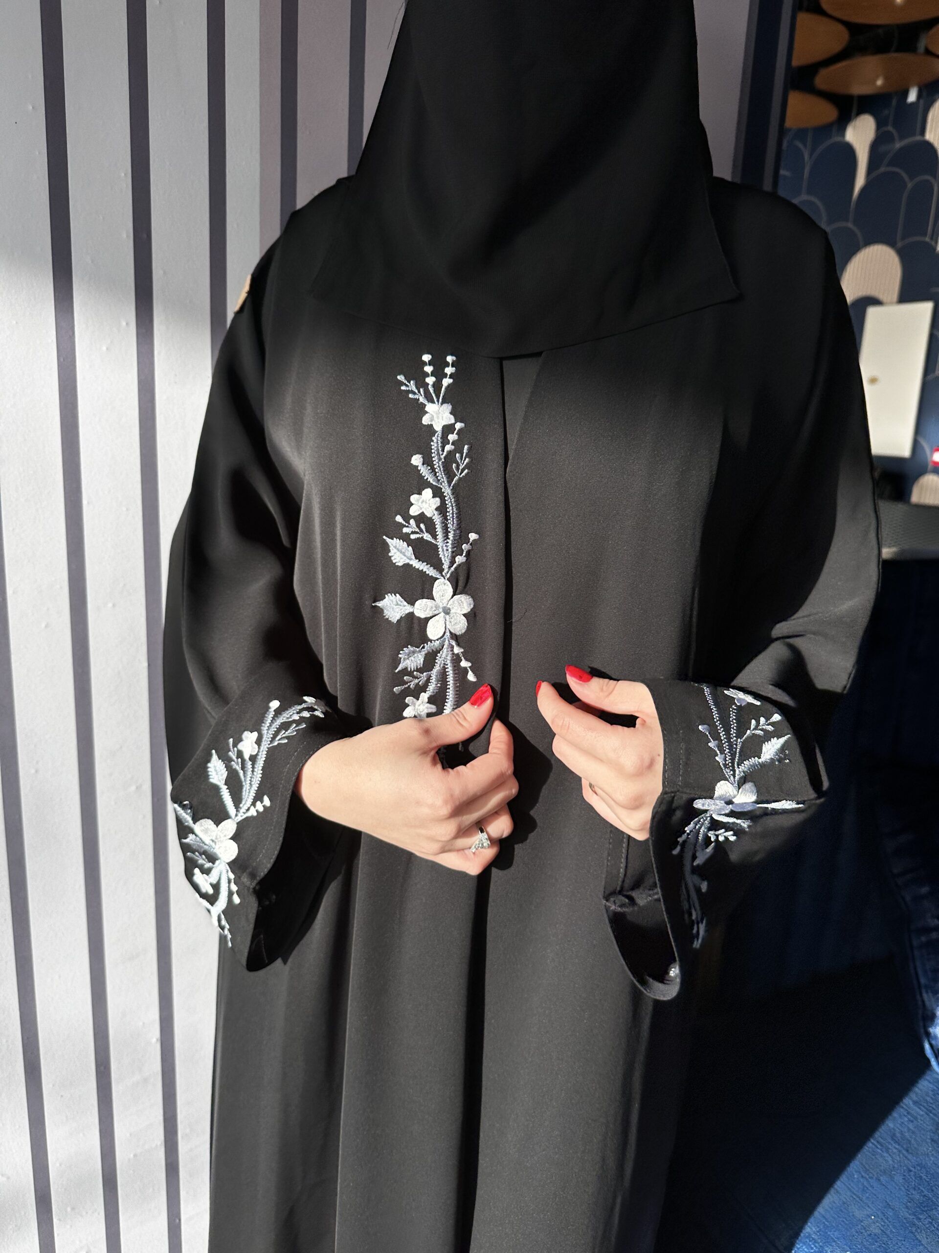 عباية سوداء مطرزه بشك فضي ( تطريز 1 )