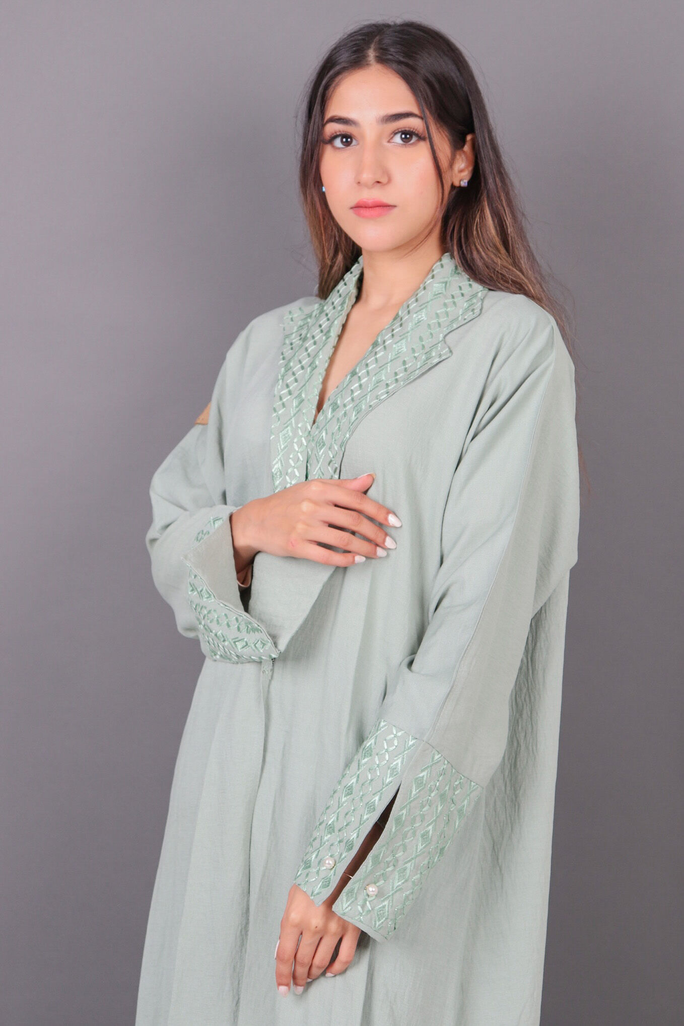 | الإضافات المميزة: | محددة بتطريز الاكمام والياقة |