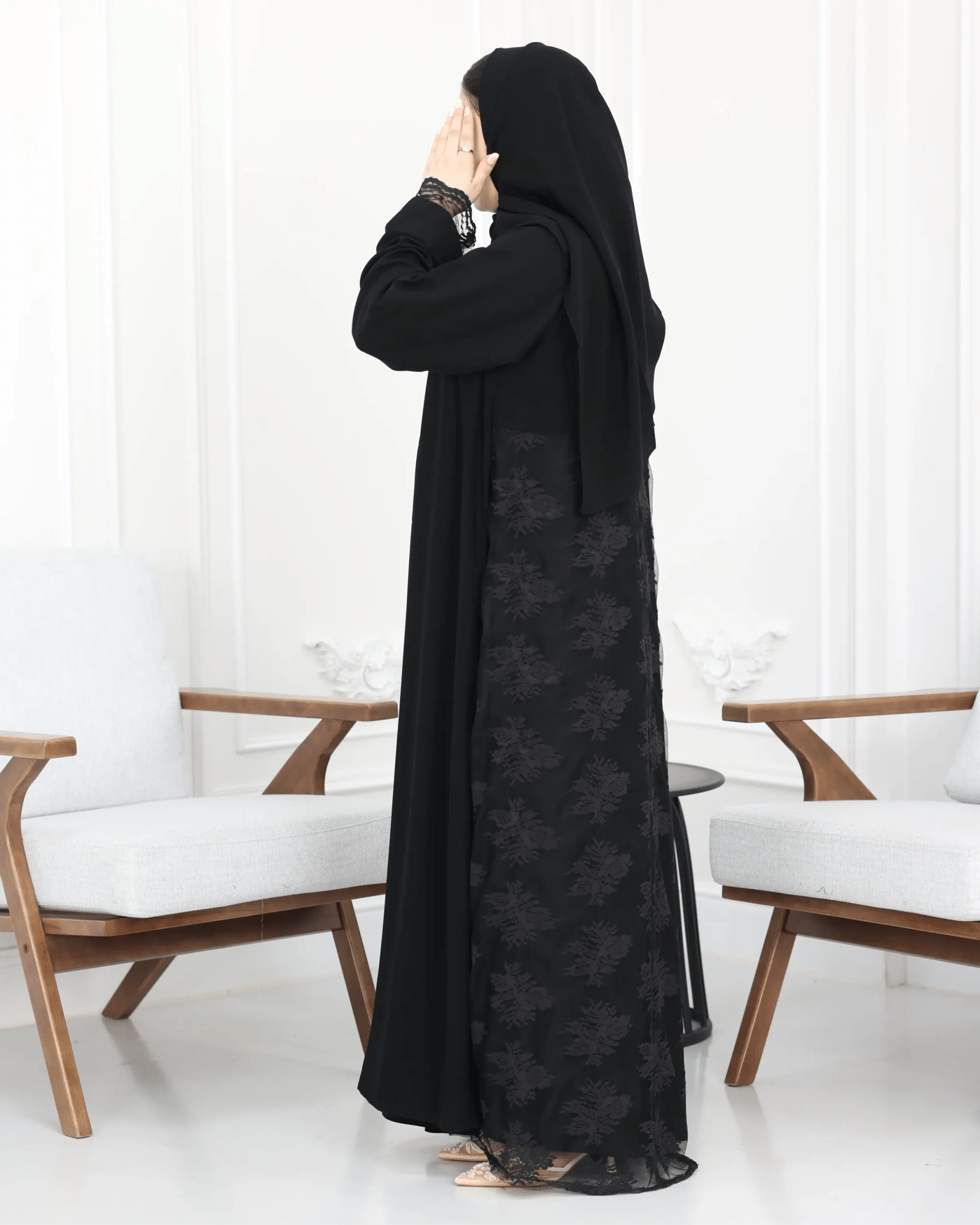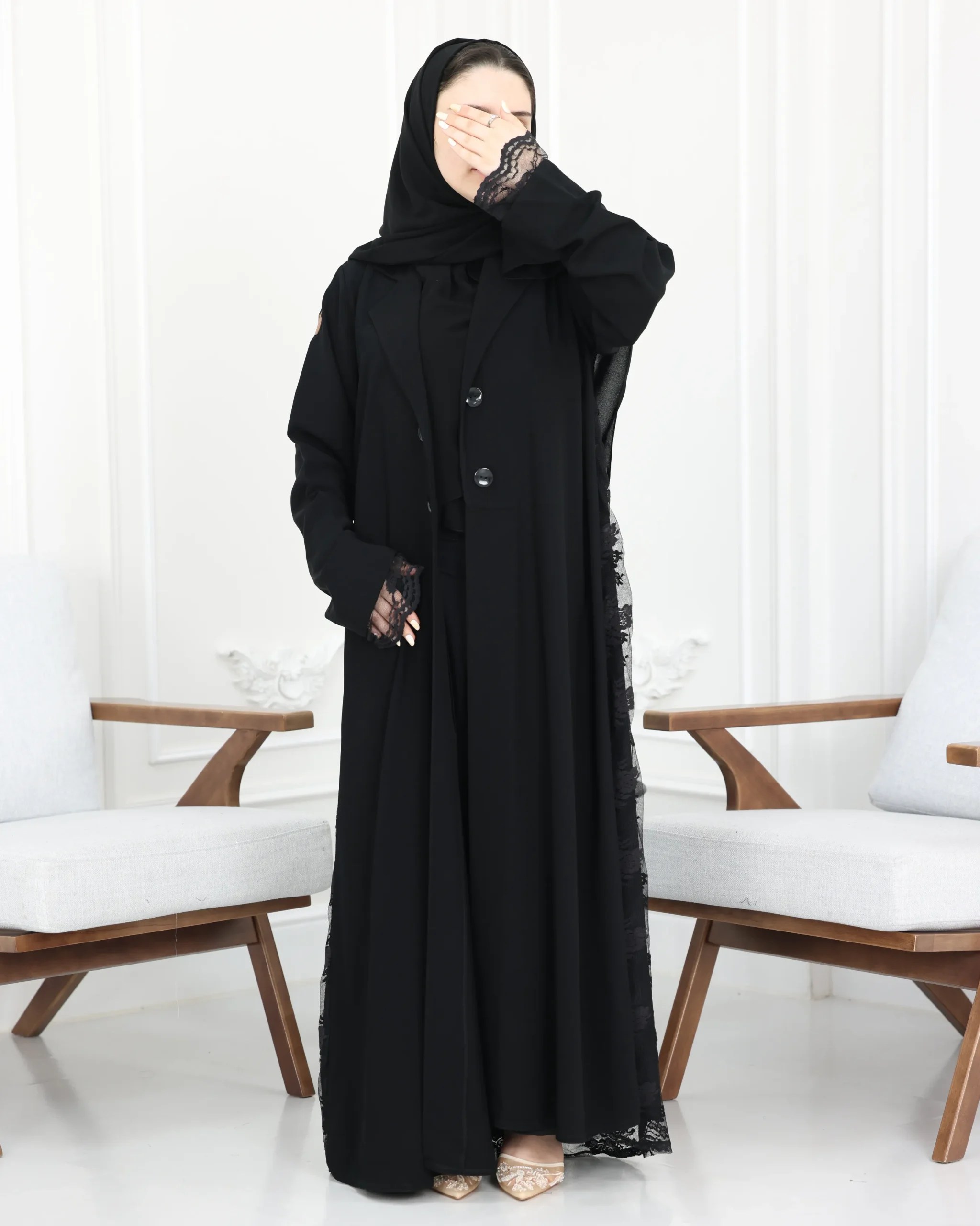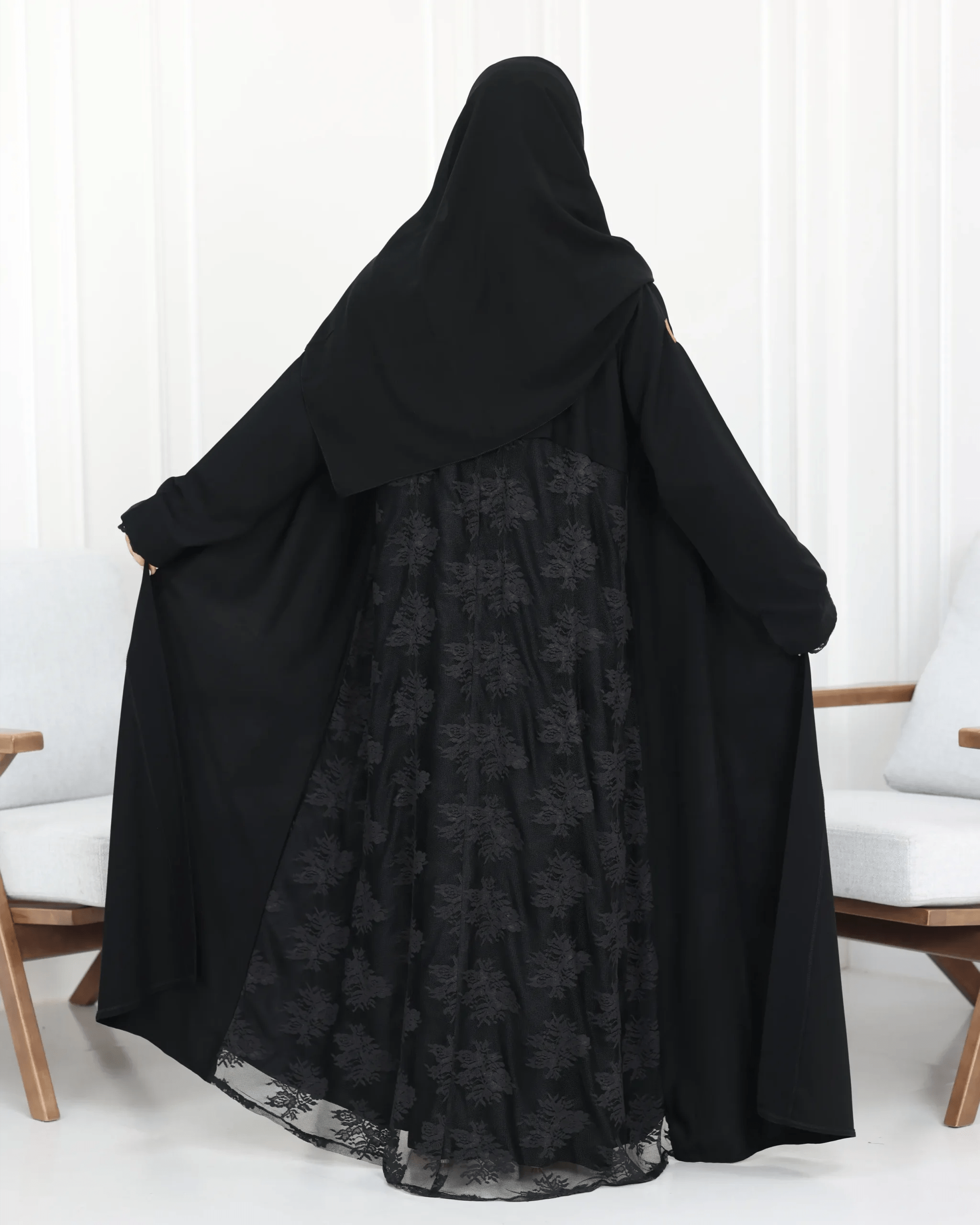 الإضافات المميزة: | دانتيل من اطراف الكم و خلف العباية |