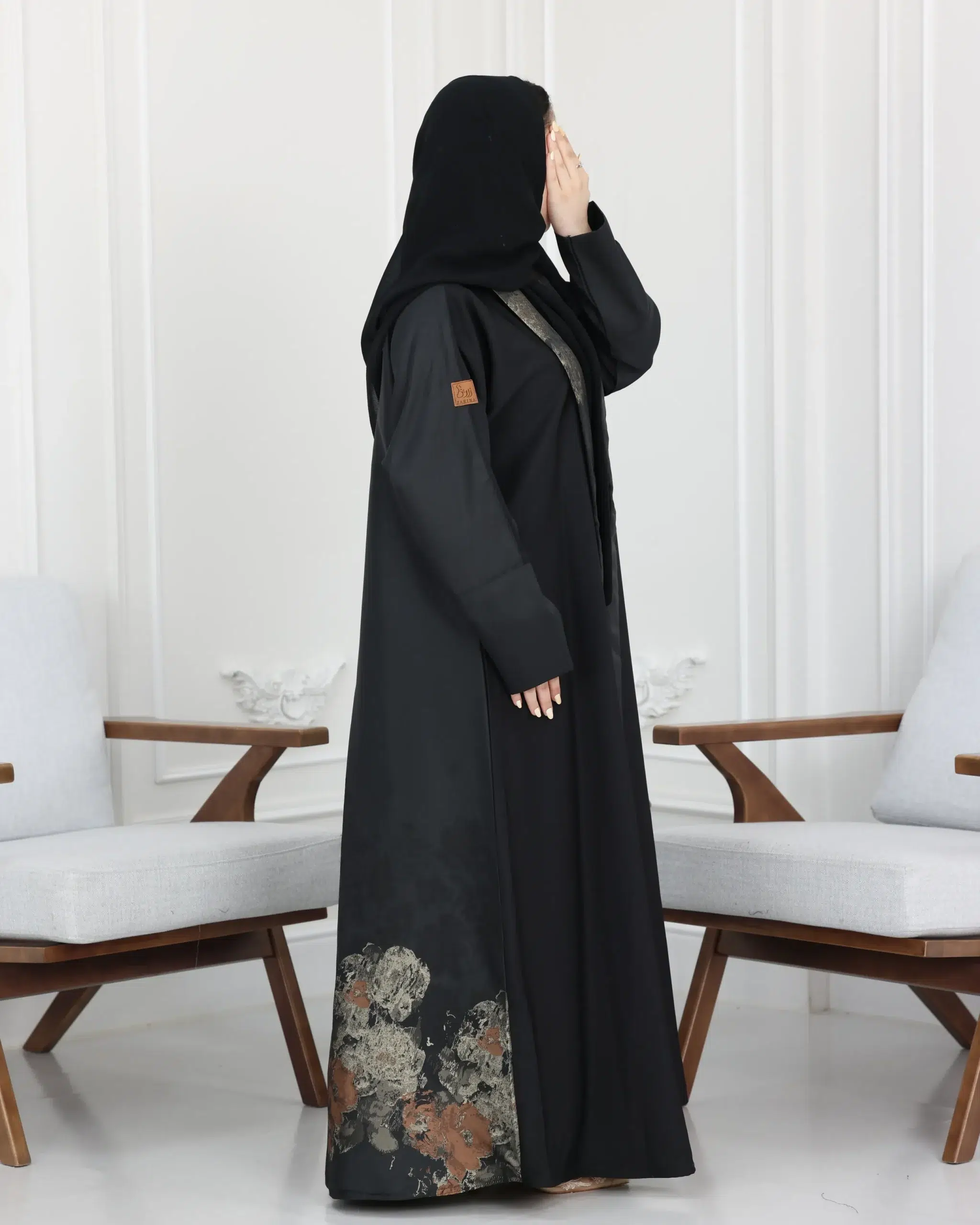 عباية كلاسيكية سوداء نصف كلوش. العباية مصممة باللون الأسود بالكامل بخامة سراميك الناعم بتطريزات على شكل وردات من الخلف و امام محددة بنفس القماش