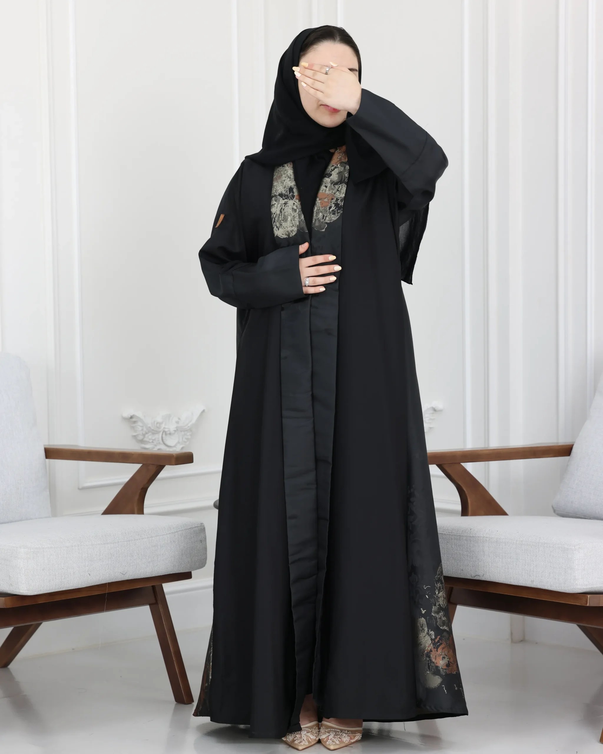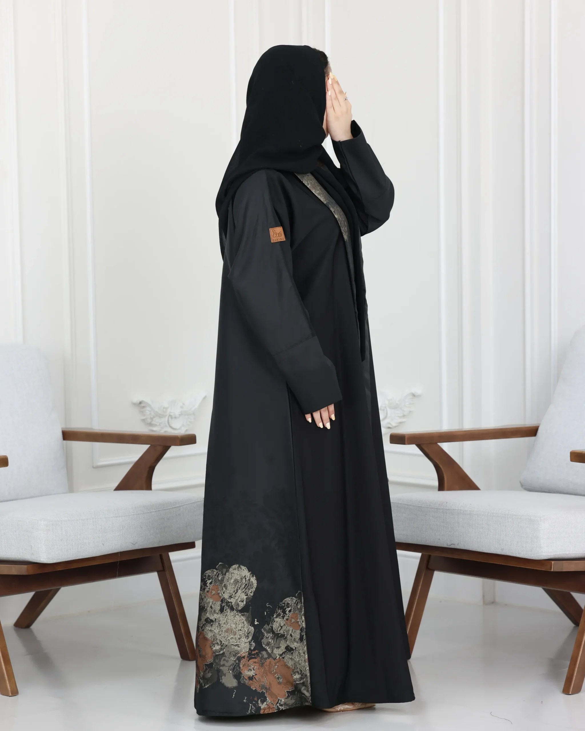 عباية لميس جاكار اسود من الخلف مرسومة بورود