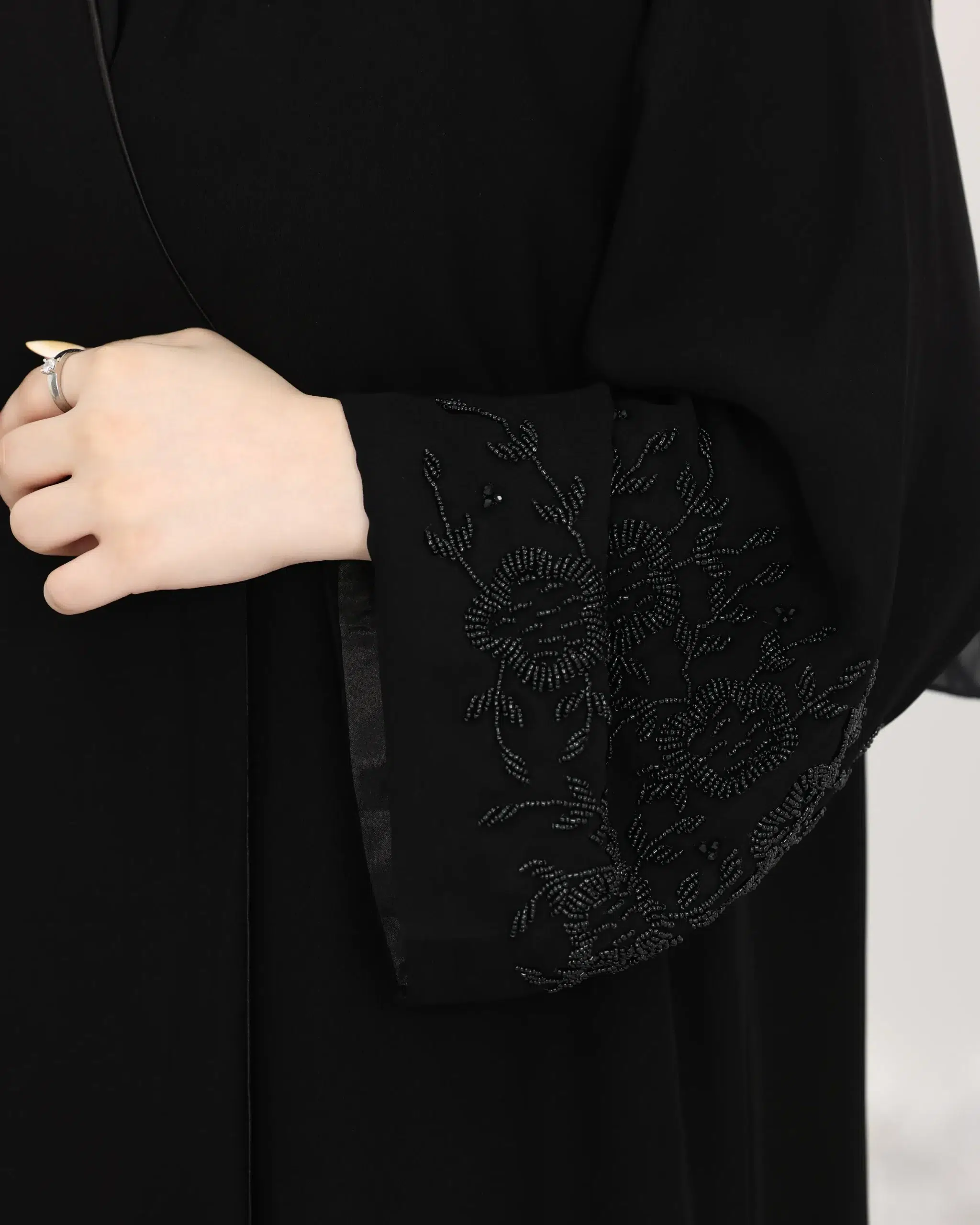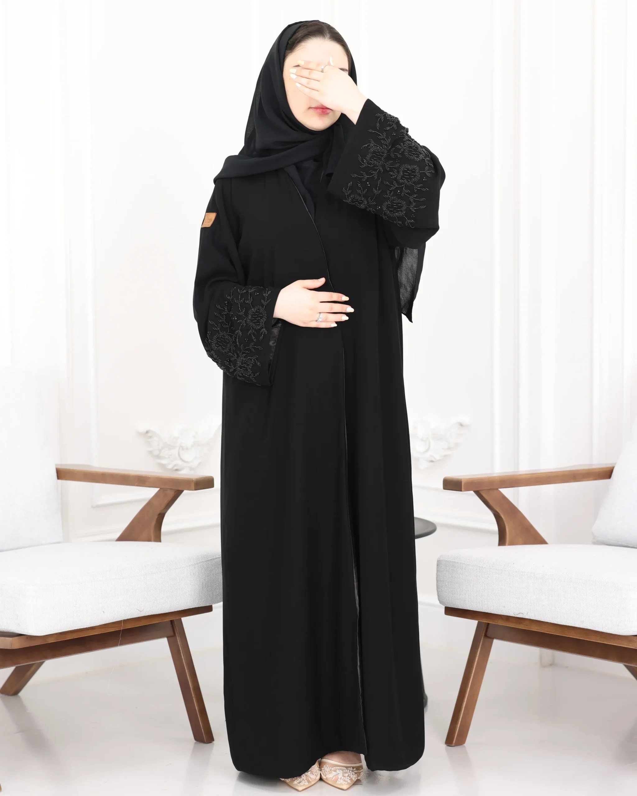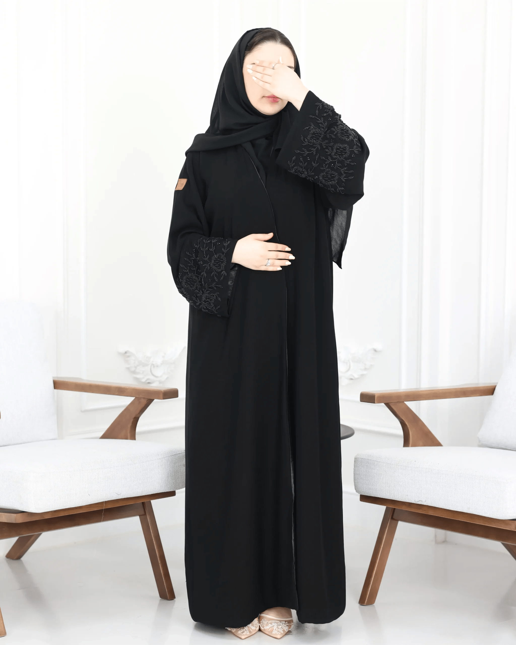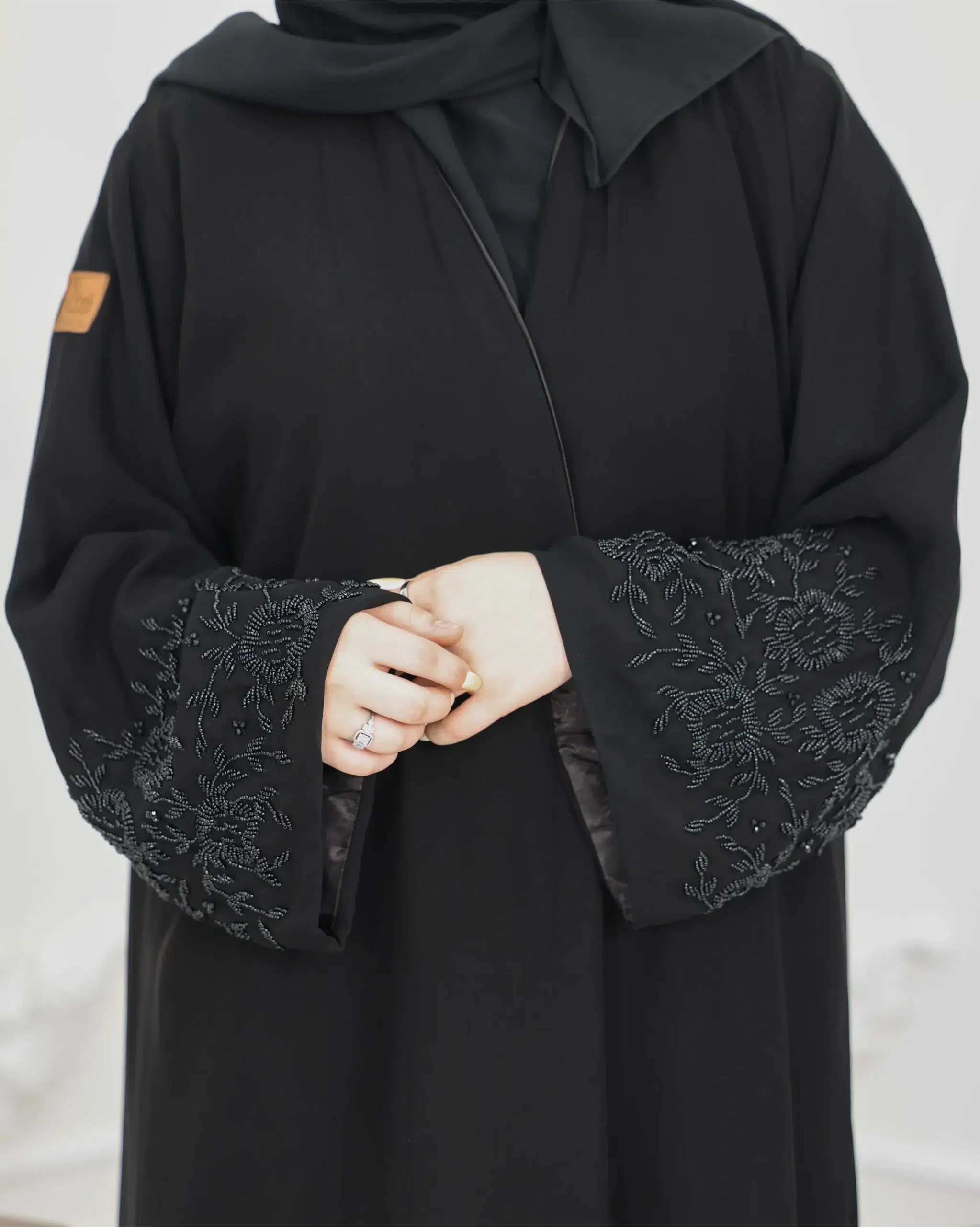 العباية راقية تشبهك اخترنا لها خامة ( انترنت ) من افضل الخامات العملية والشديدة السواد، تم تصميمها بشك على الاكمام بلون اسود