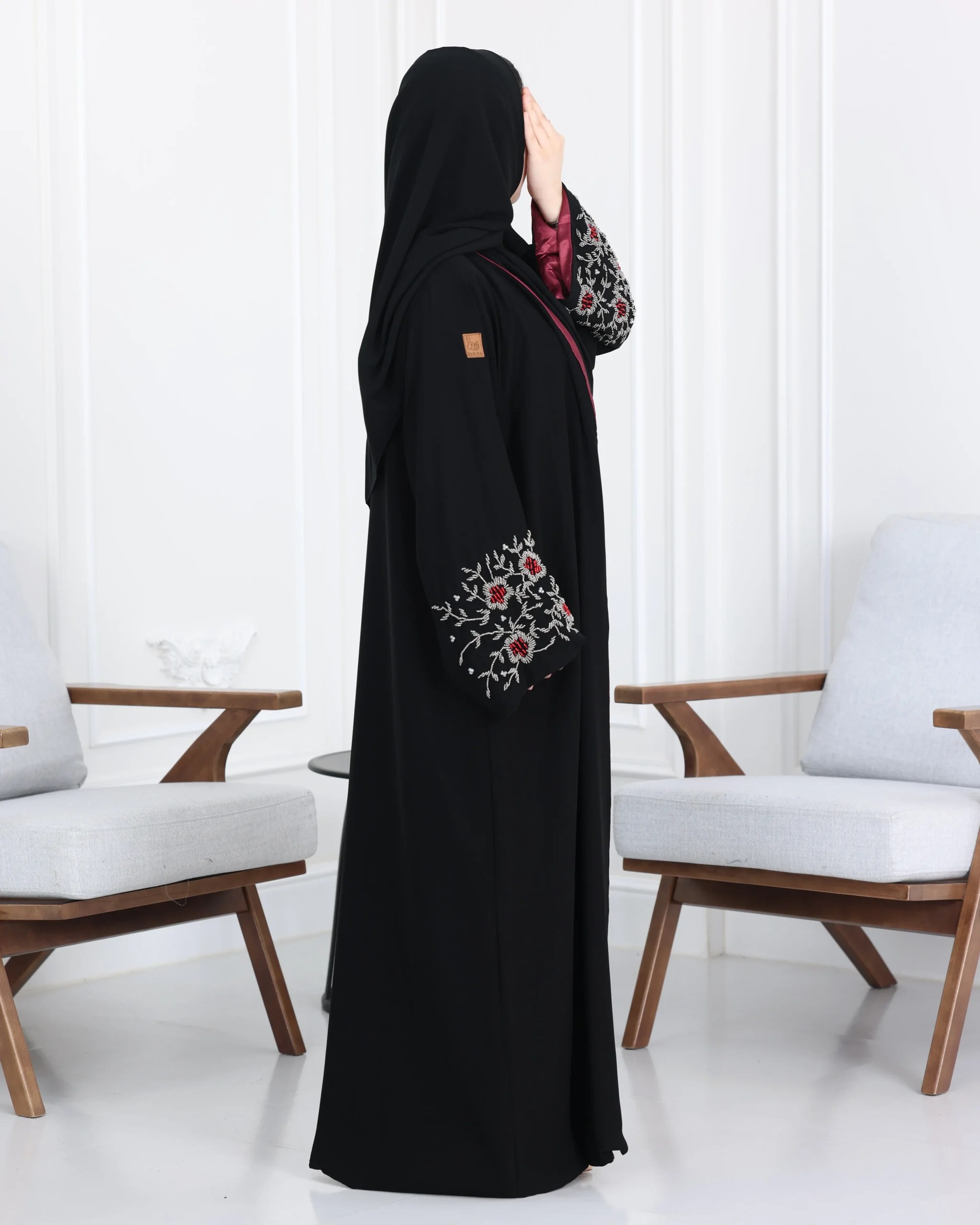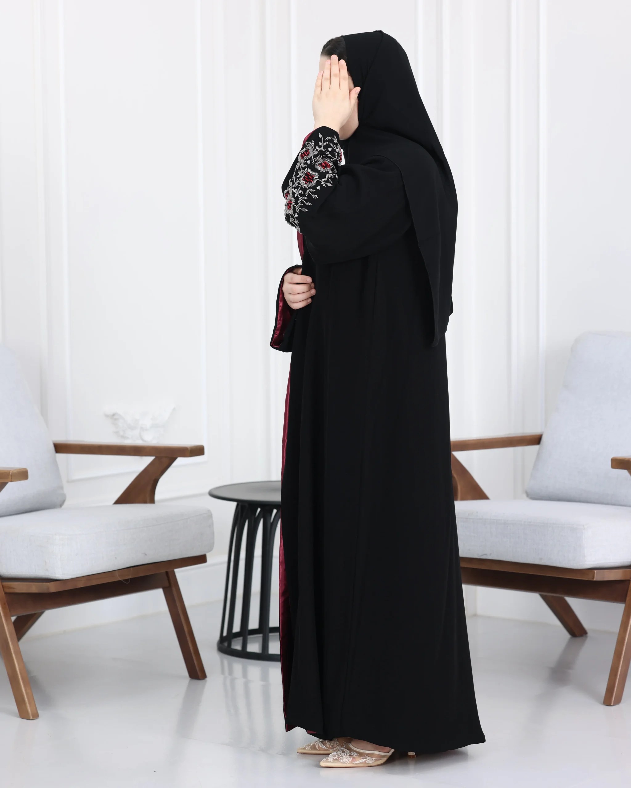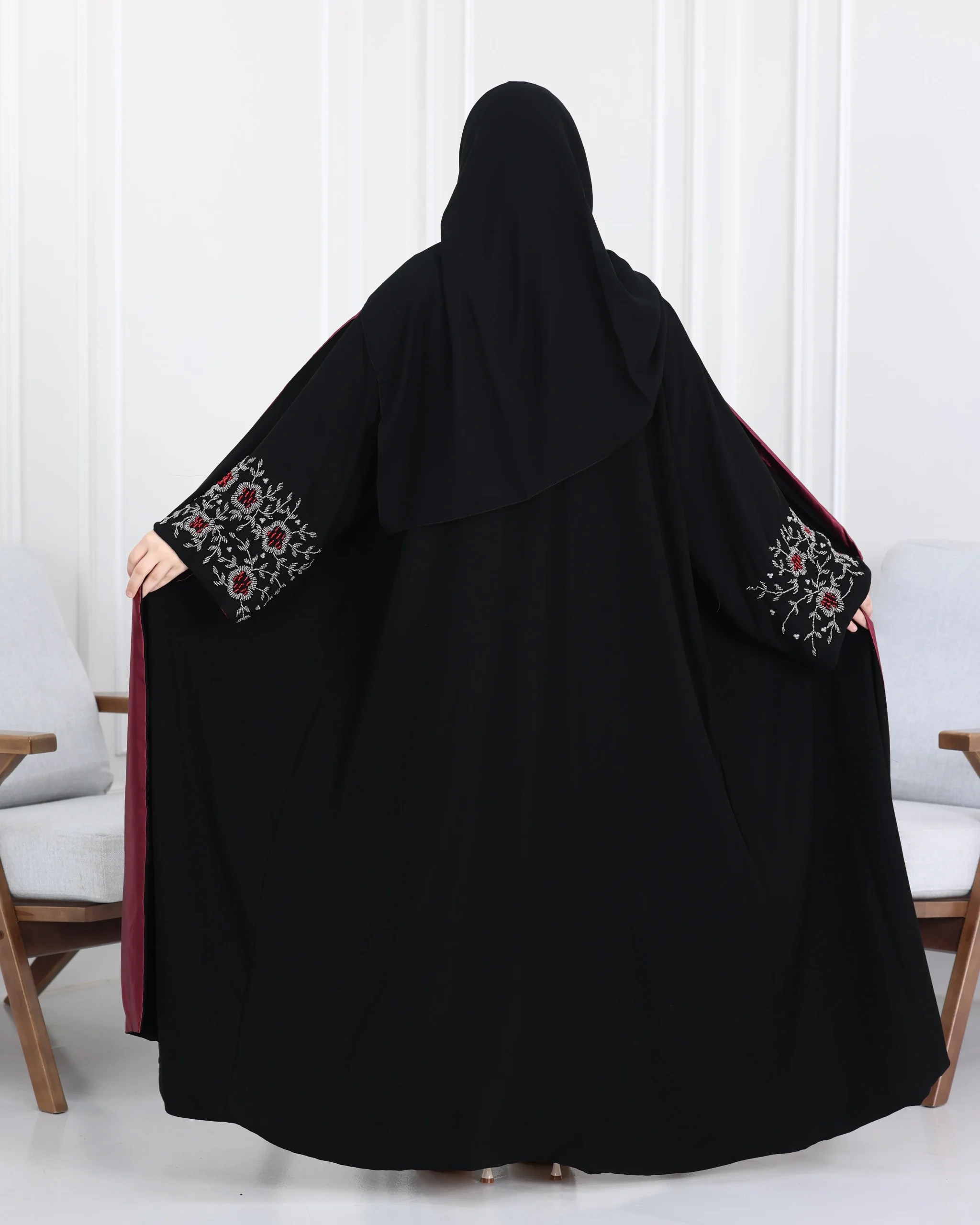 الإضافات المميزة: | شك بلون عنابي على اكمام و عباية مبطنة من داخل بنفس لون الشك |