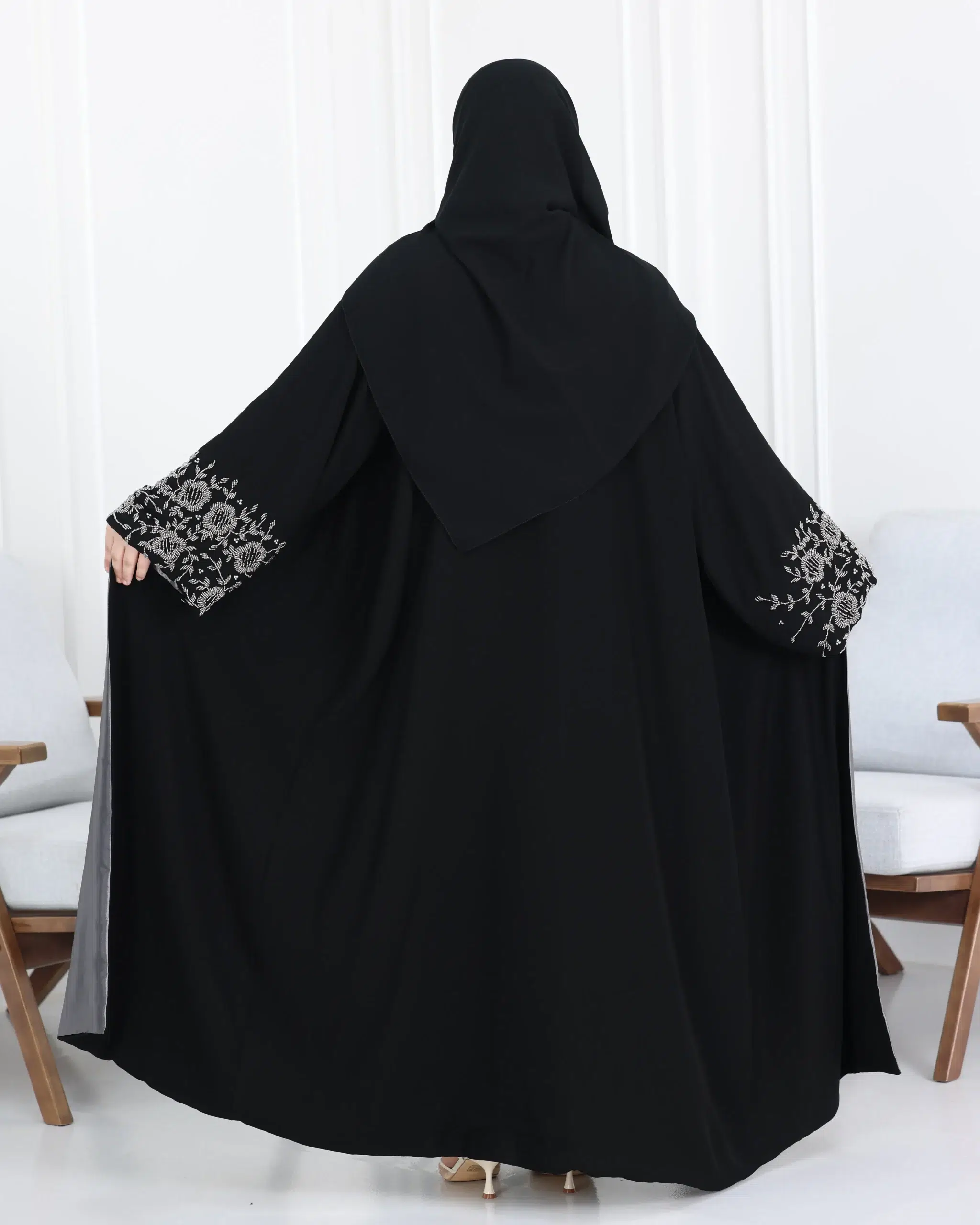 | الإضافات المميزة: | شك بلون رمادي على اكمام و عباية مبطنة من داخل بنفس لون الشك |
