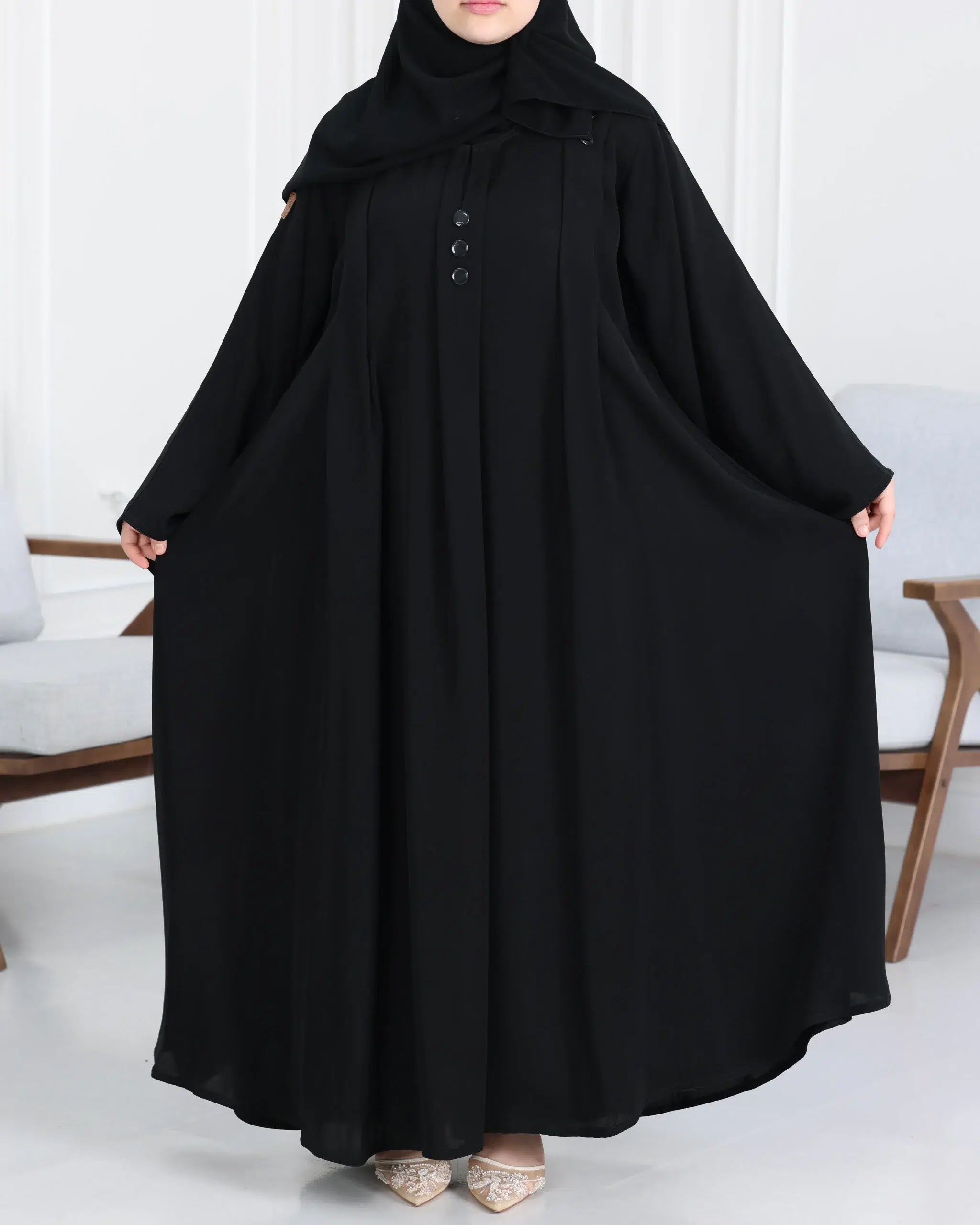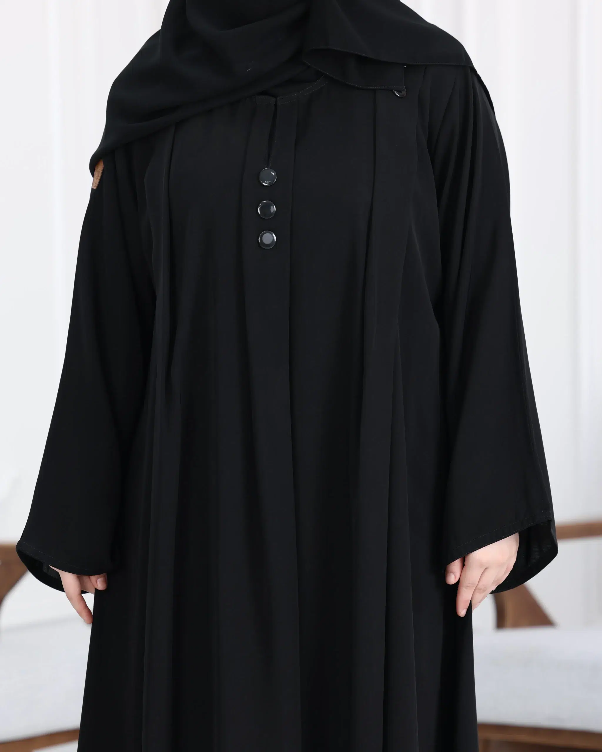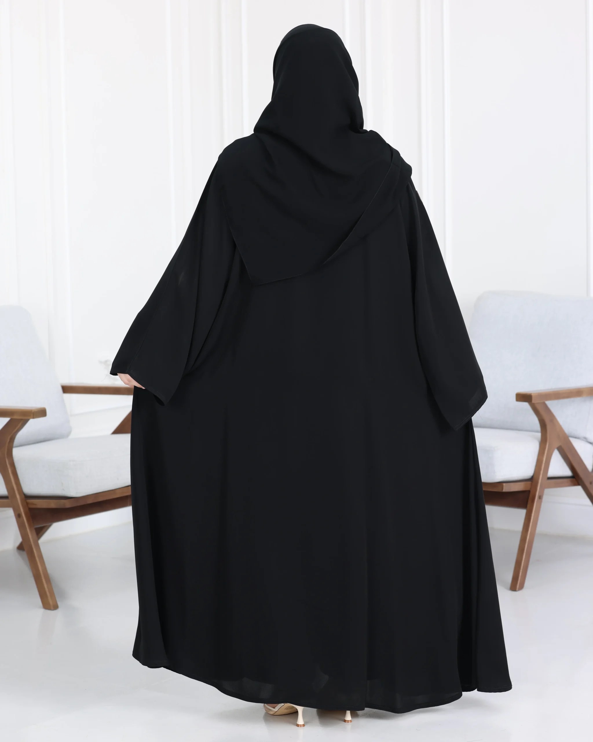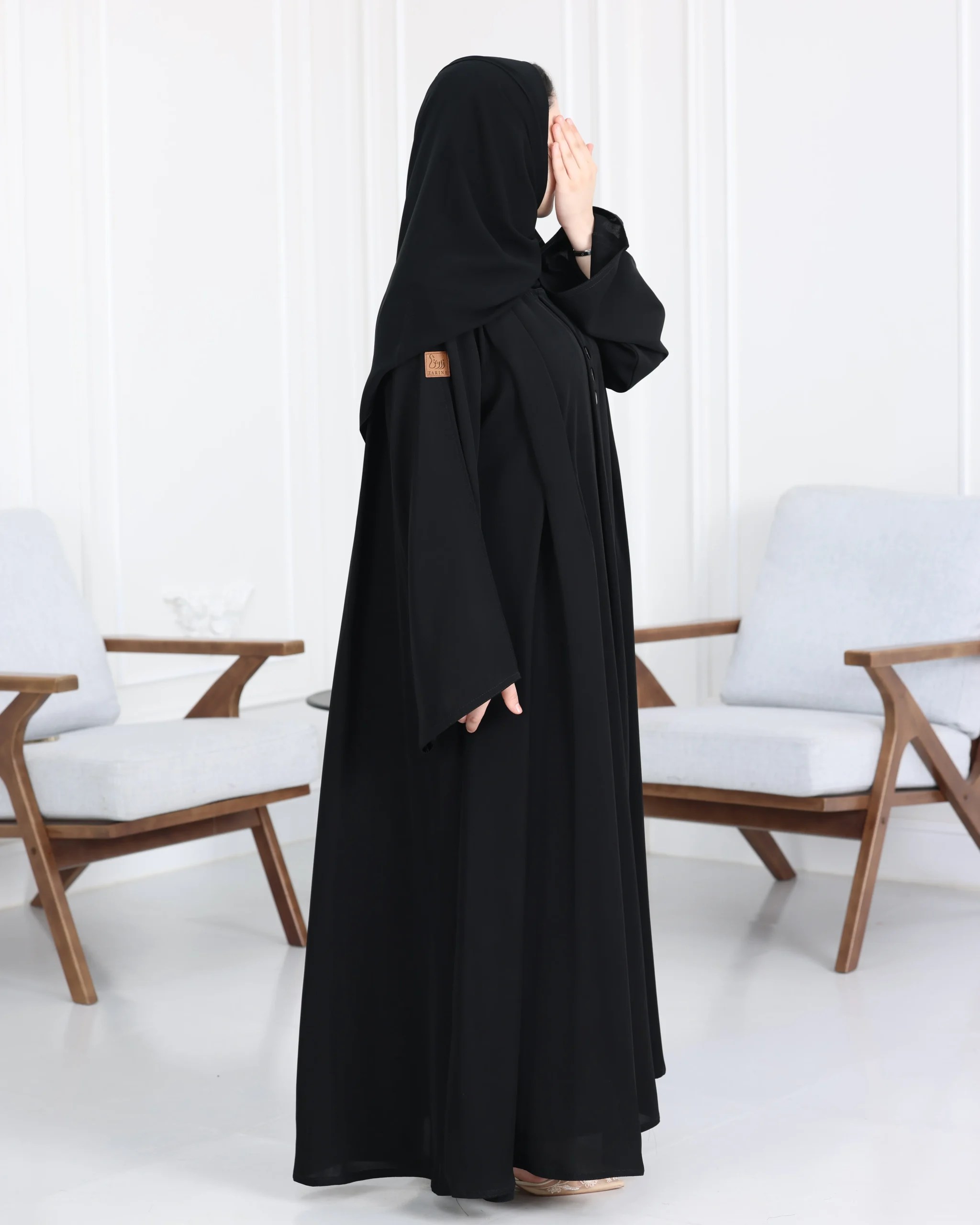 عباية ساده مغلقه بزراير مزينه نص كلوش محدد من الأكمام واجناب