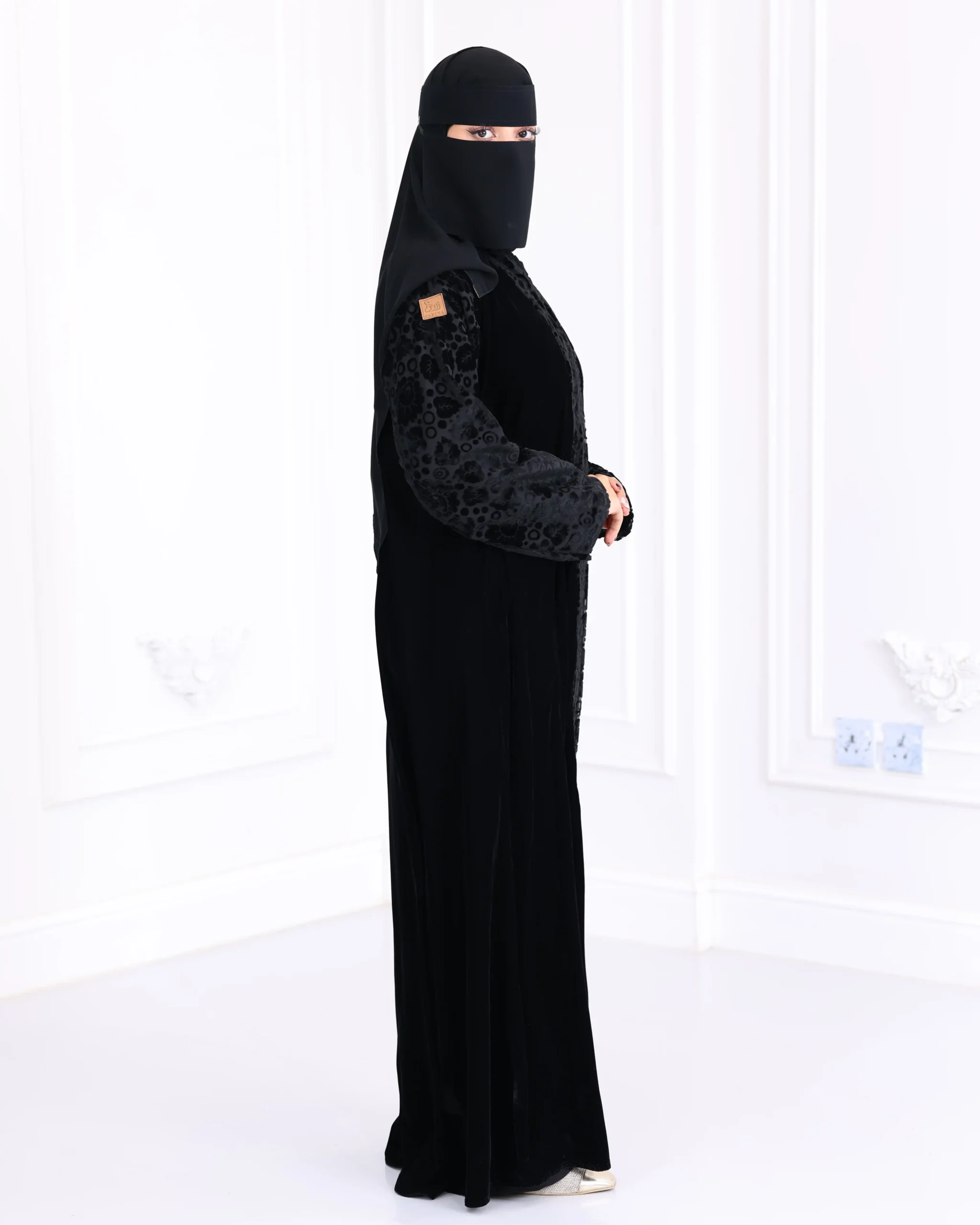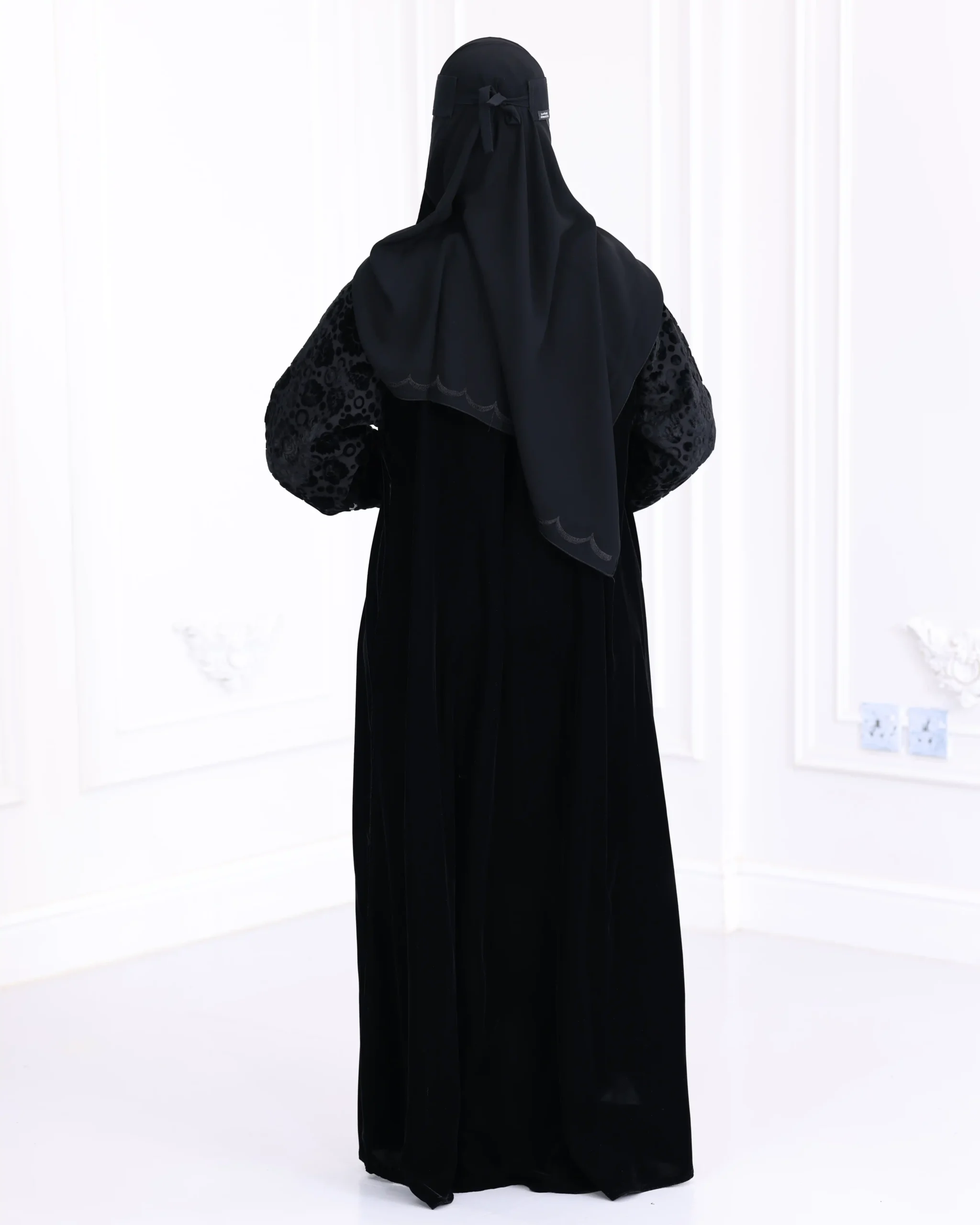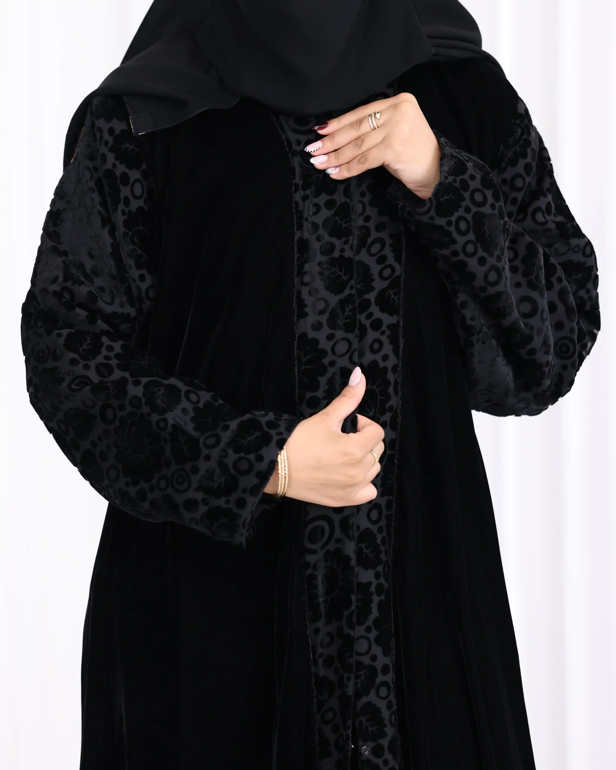 عباية قطيفة كامل باكمام منقشة بمخمل