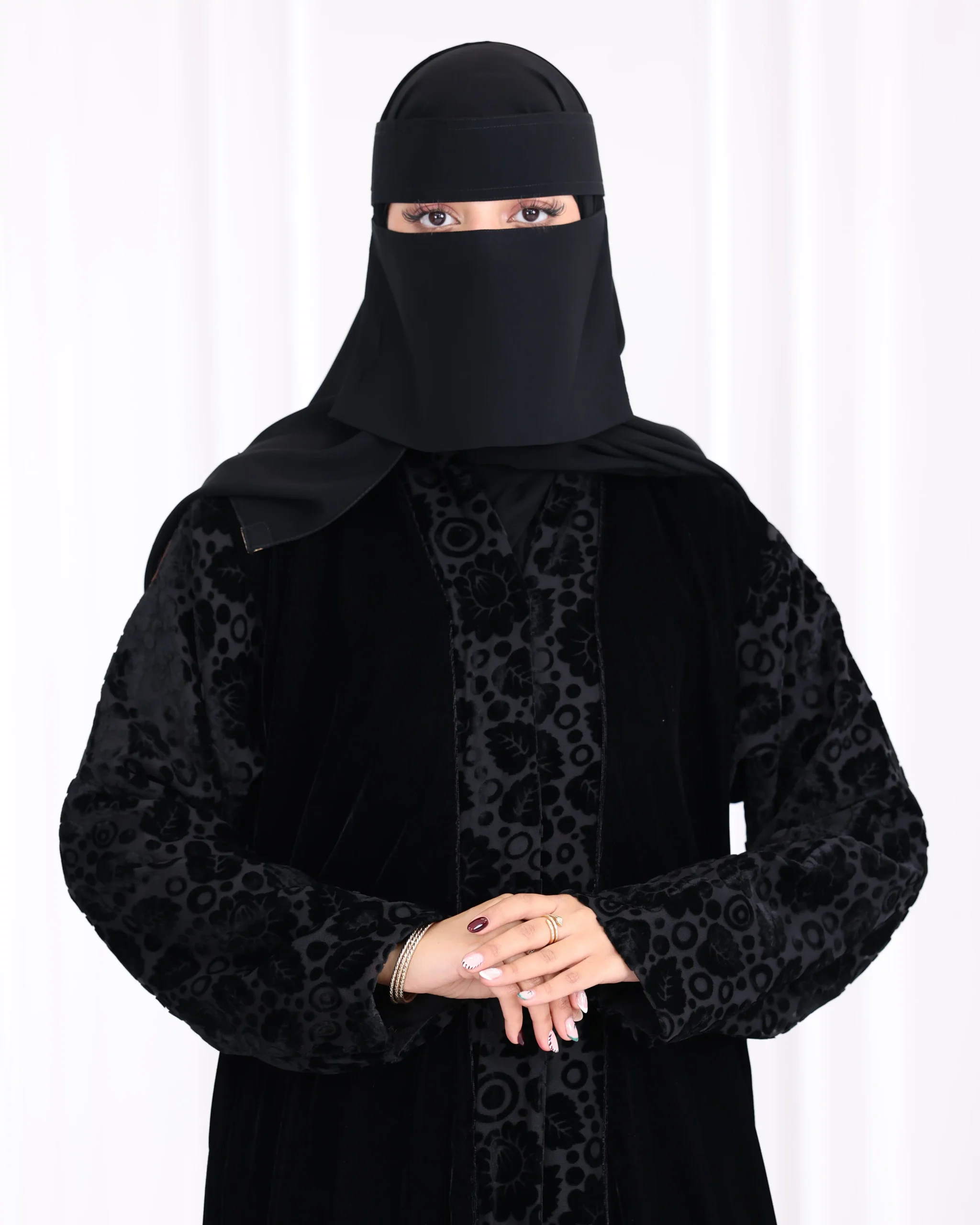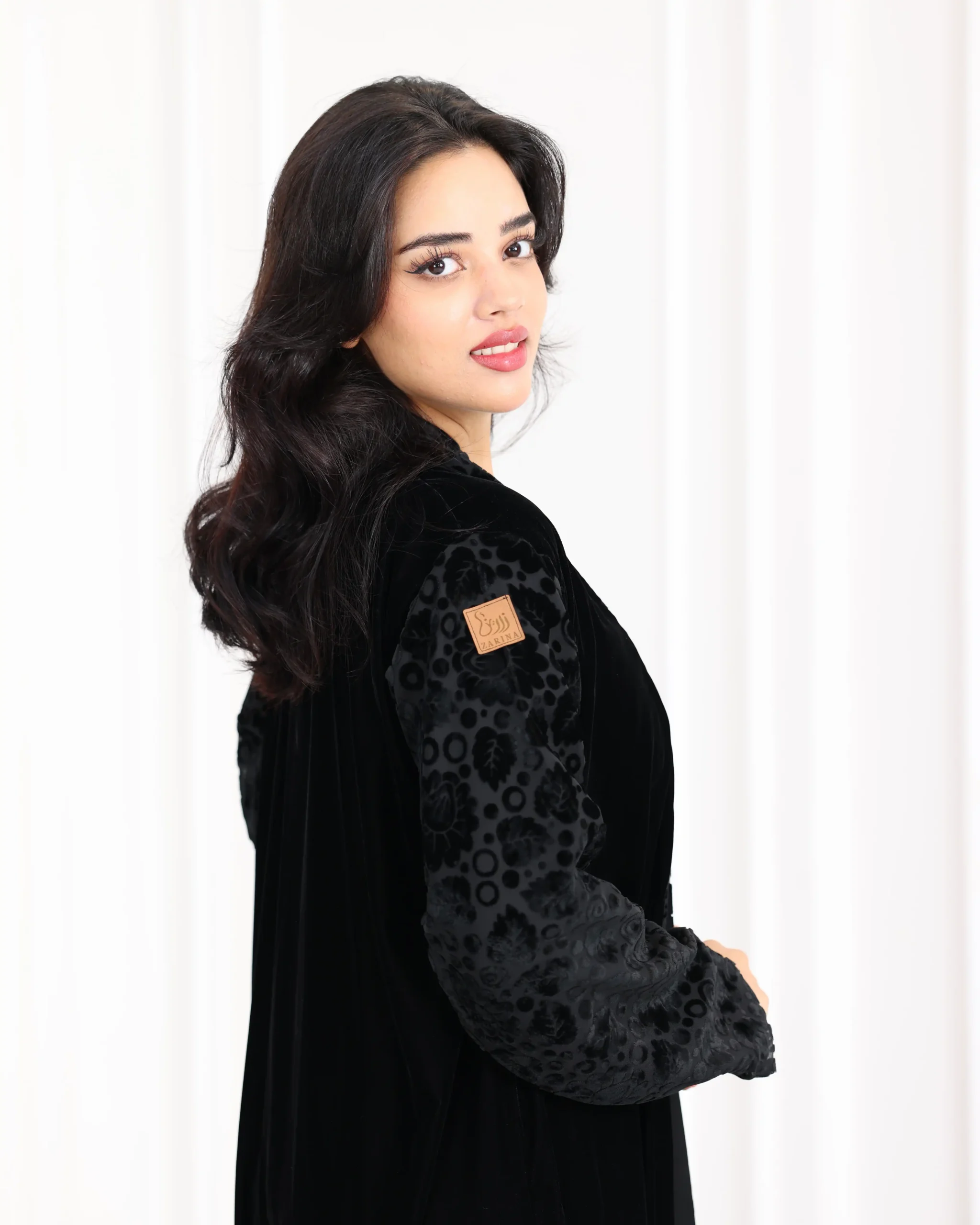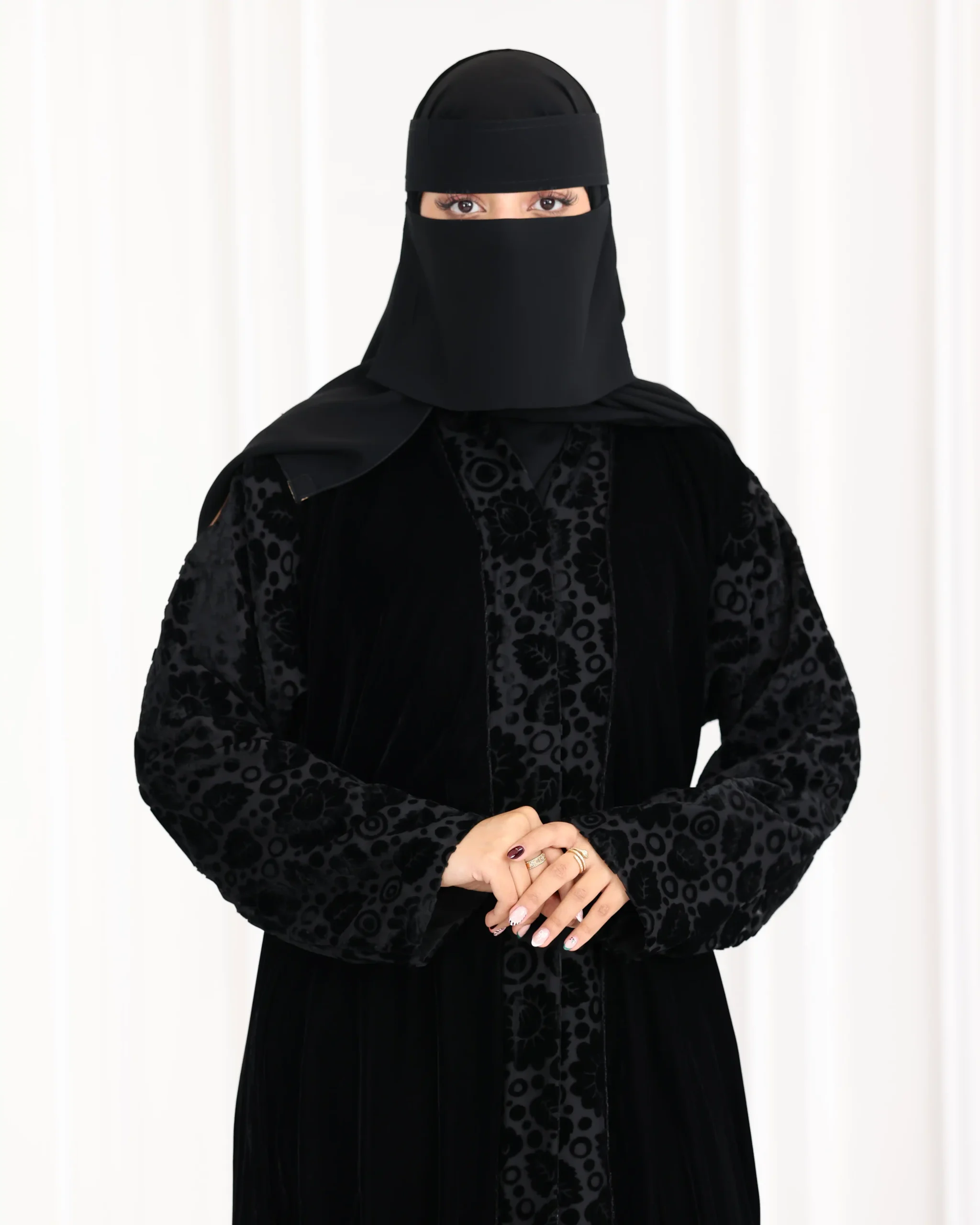 عباية قطيفة كامل باكمام منقشة بمخمل