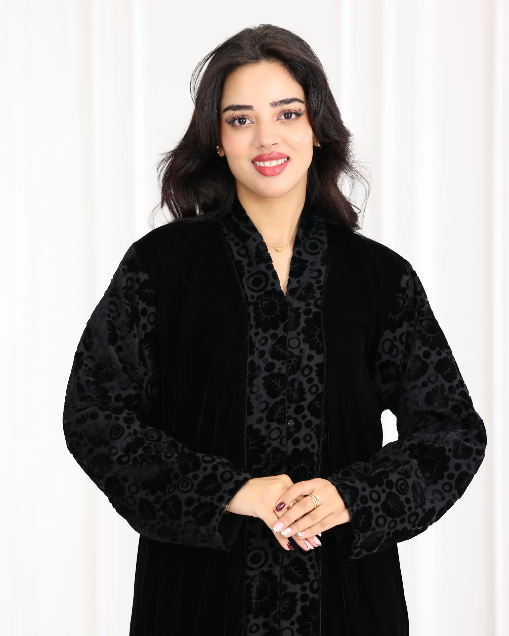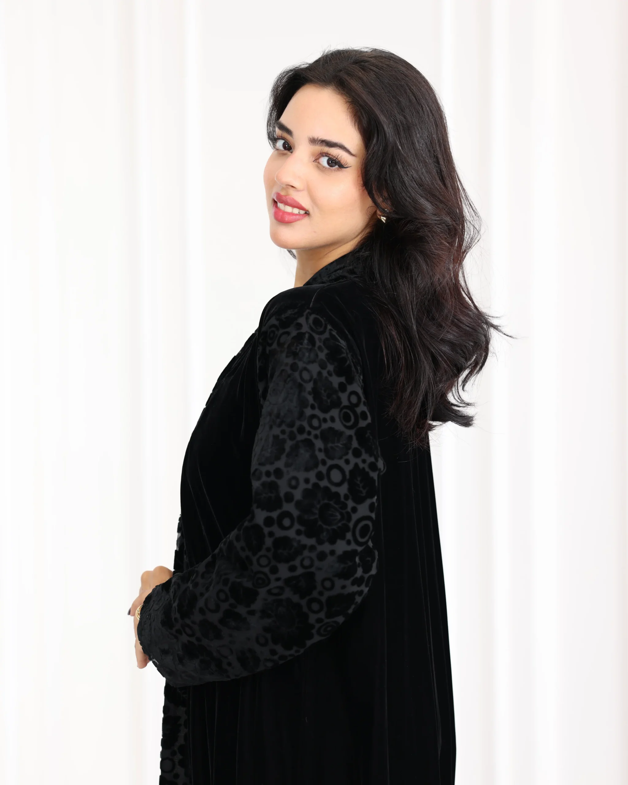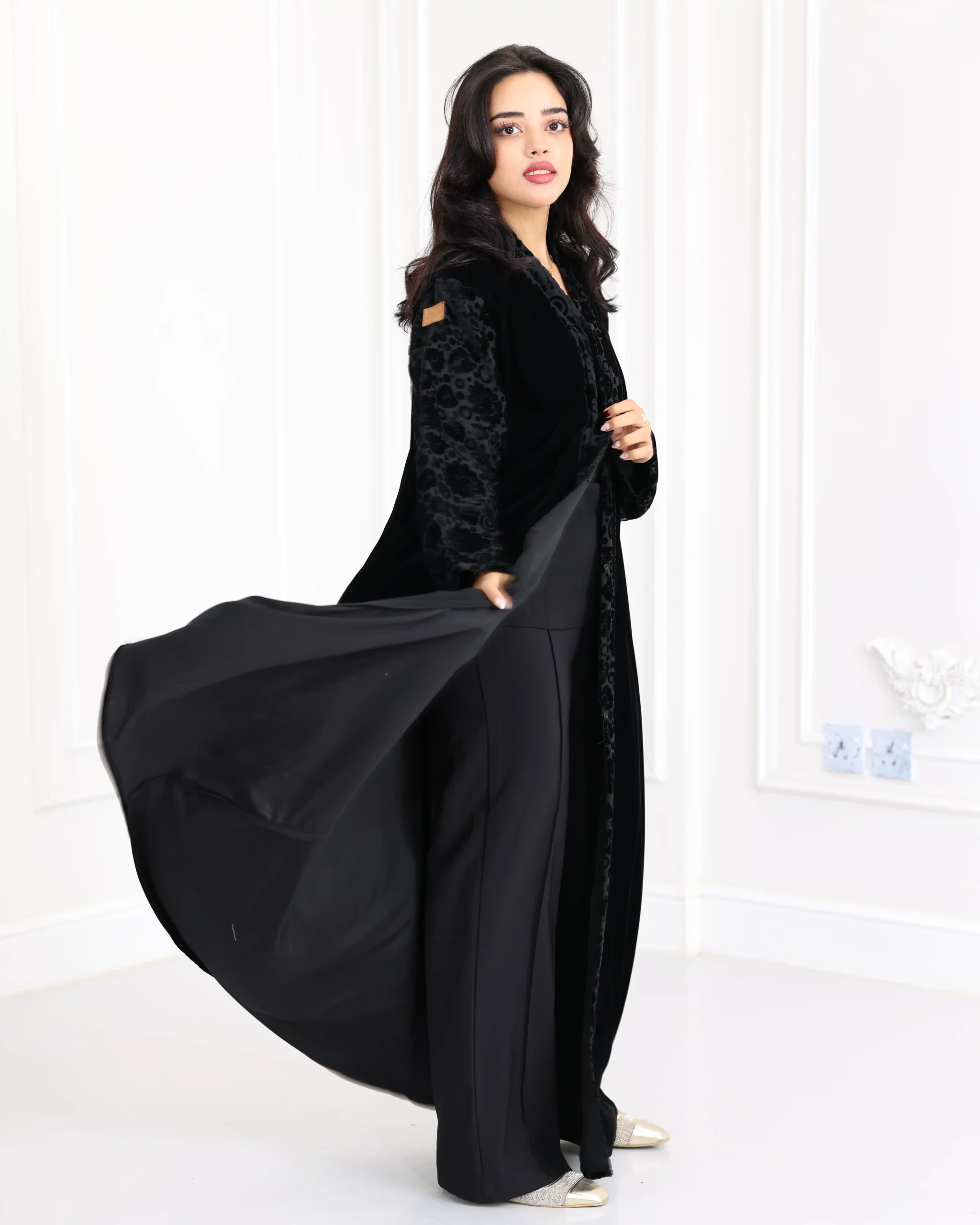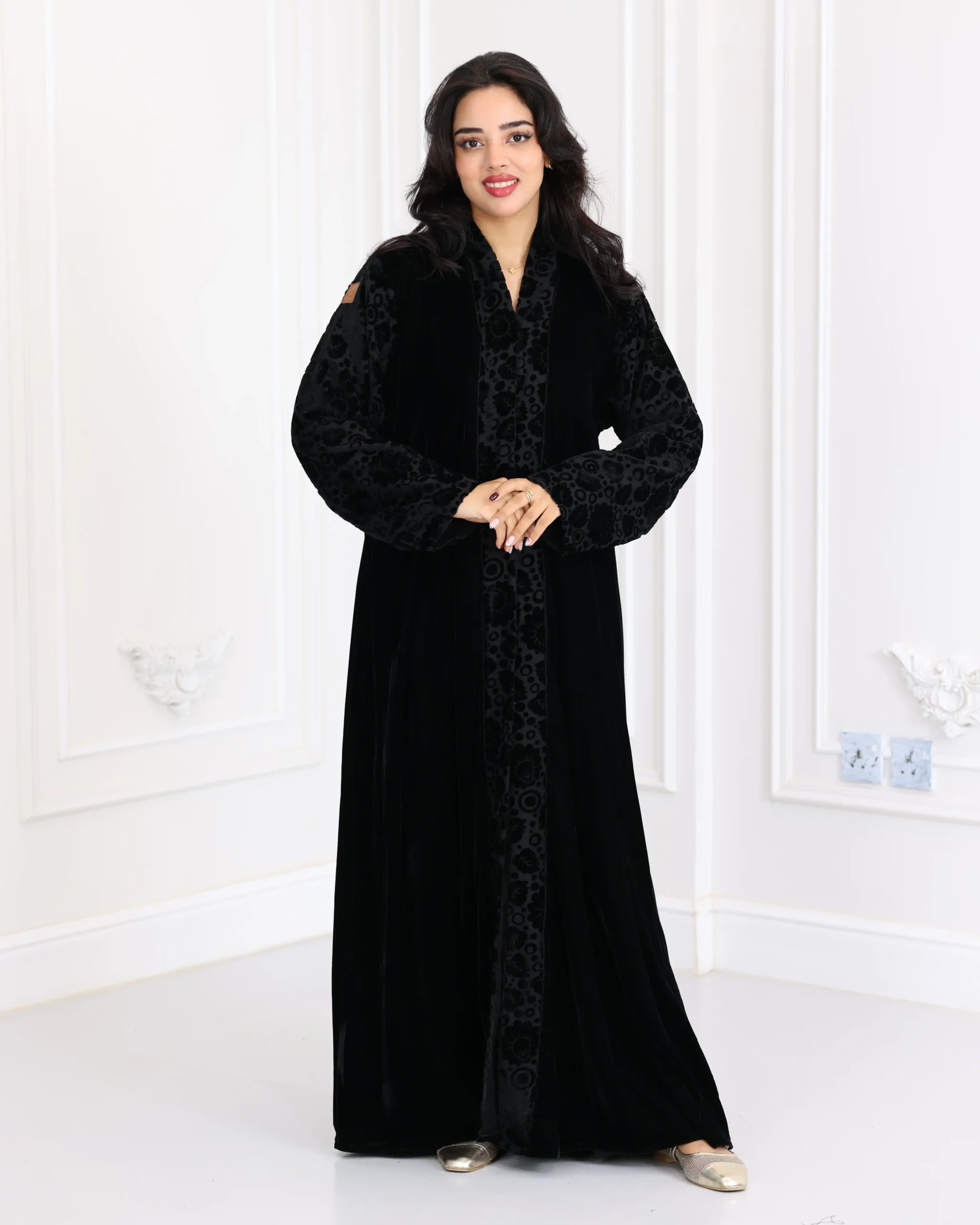 عباية مخمل بياقه كلوش بتطريز شك اسود على اكمام