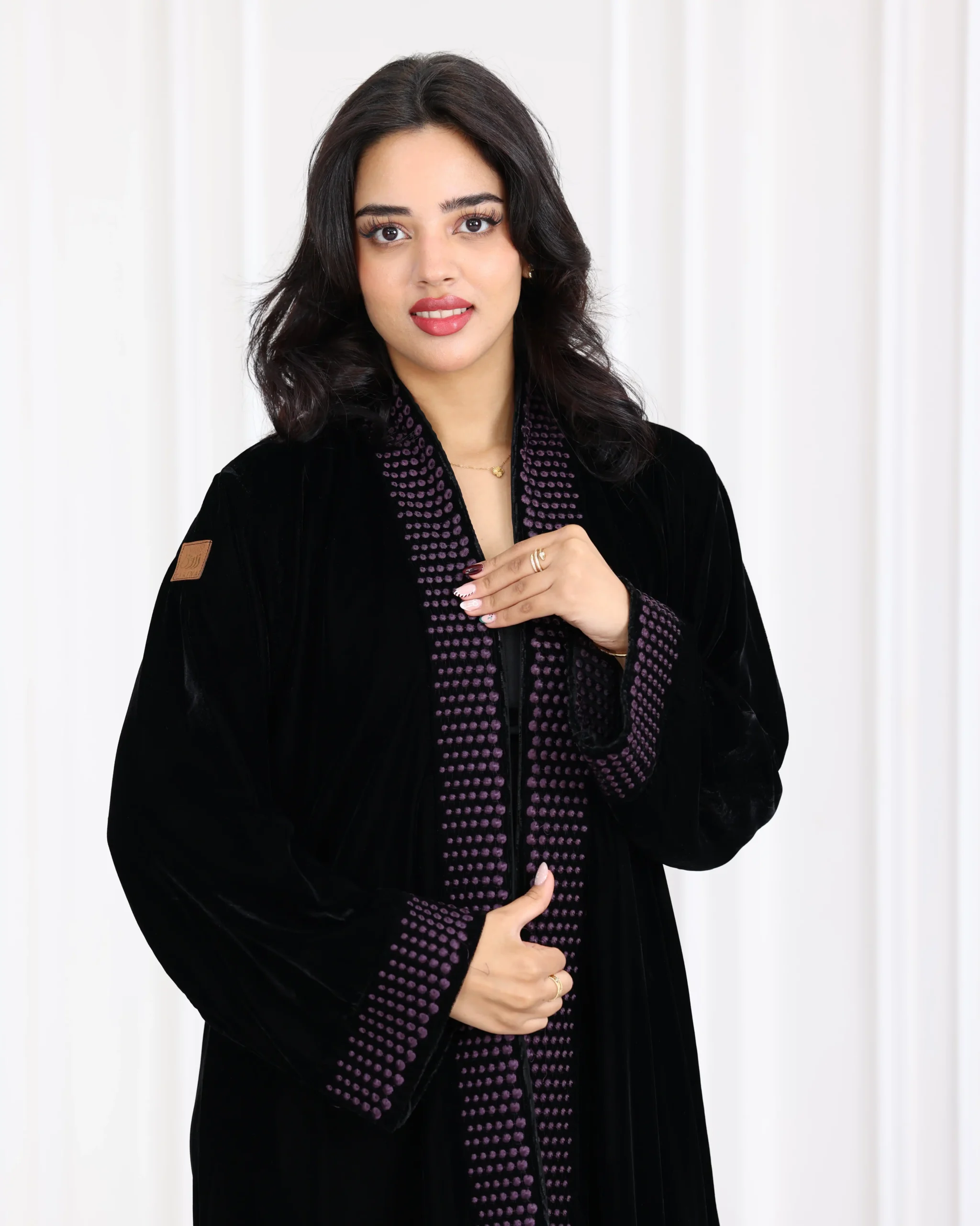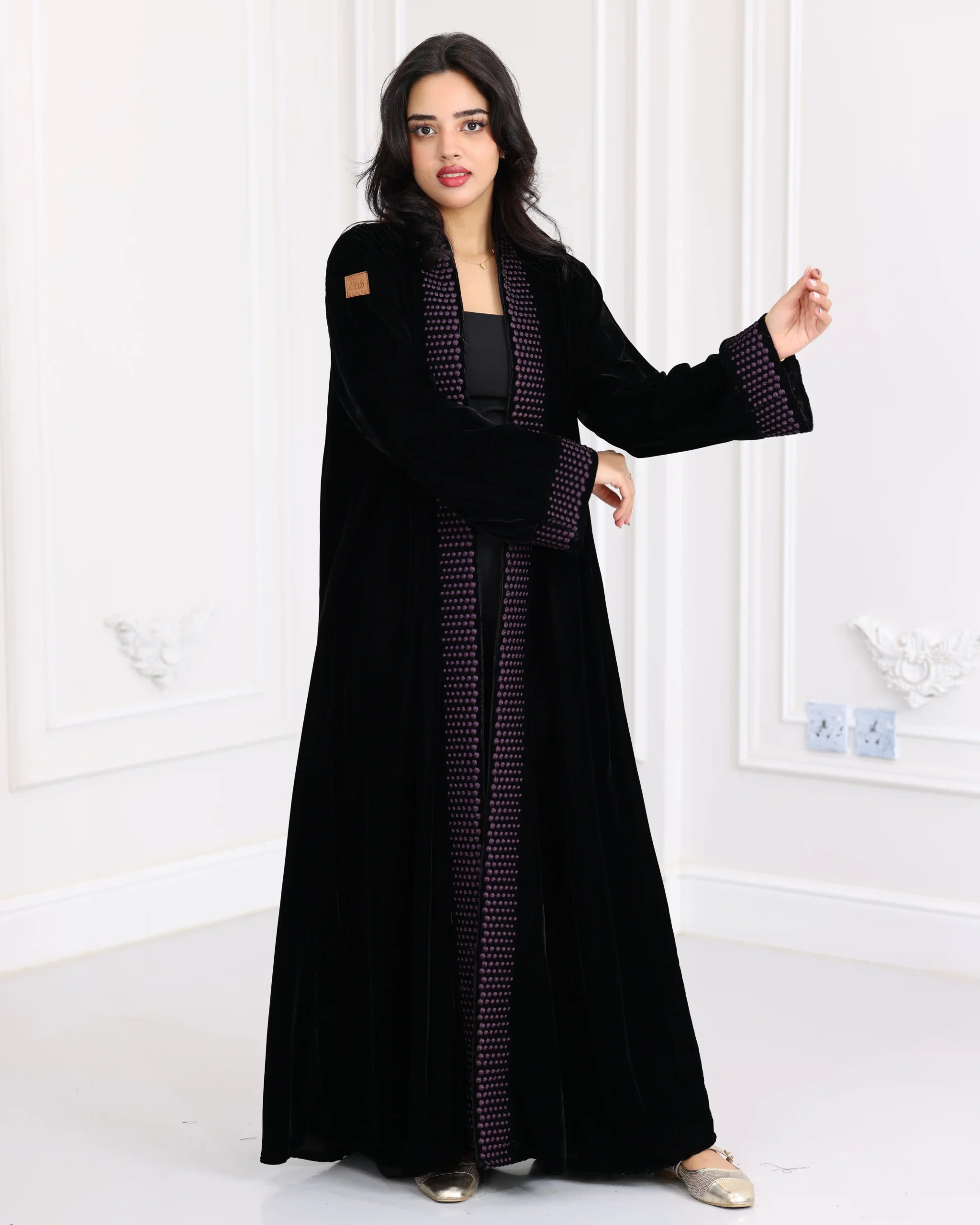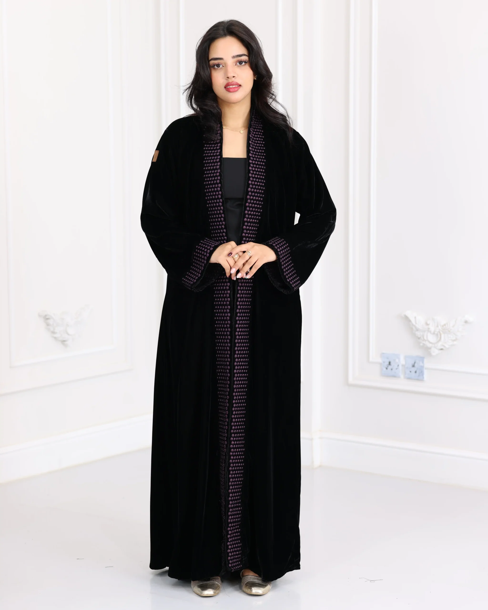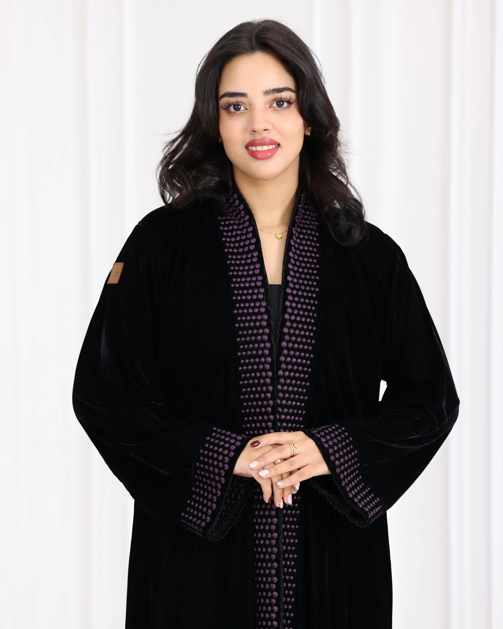 عباية مخمل مطرزة بموف هي قطعة فاخرة تتميز بخامة المخمل الناعمة والدافئة و أنيق، وقصة كلوش الفضفاضة والمريحة التي تضفي لمسة أنثوية ، مع تطريزات بارزة من امام بخيوط موف شك، وعلى الأكمام والحواف لتعزيز الجمال والتفرد، مثالية للمناسبات الخاصة وتجمع بين الفخامة والراحة