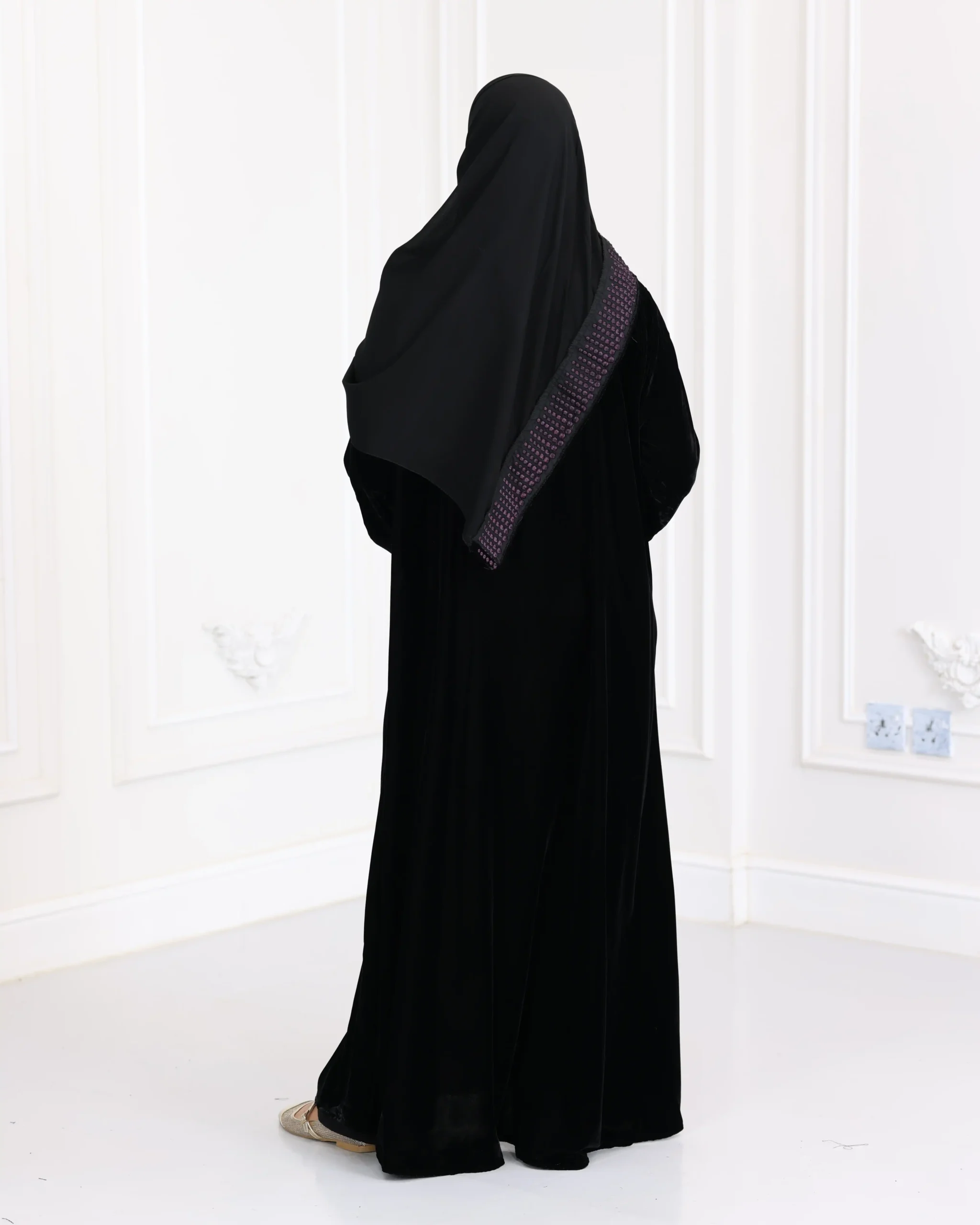 عباية مخمل مطرزة بدقات بلون موف مع طرحة